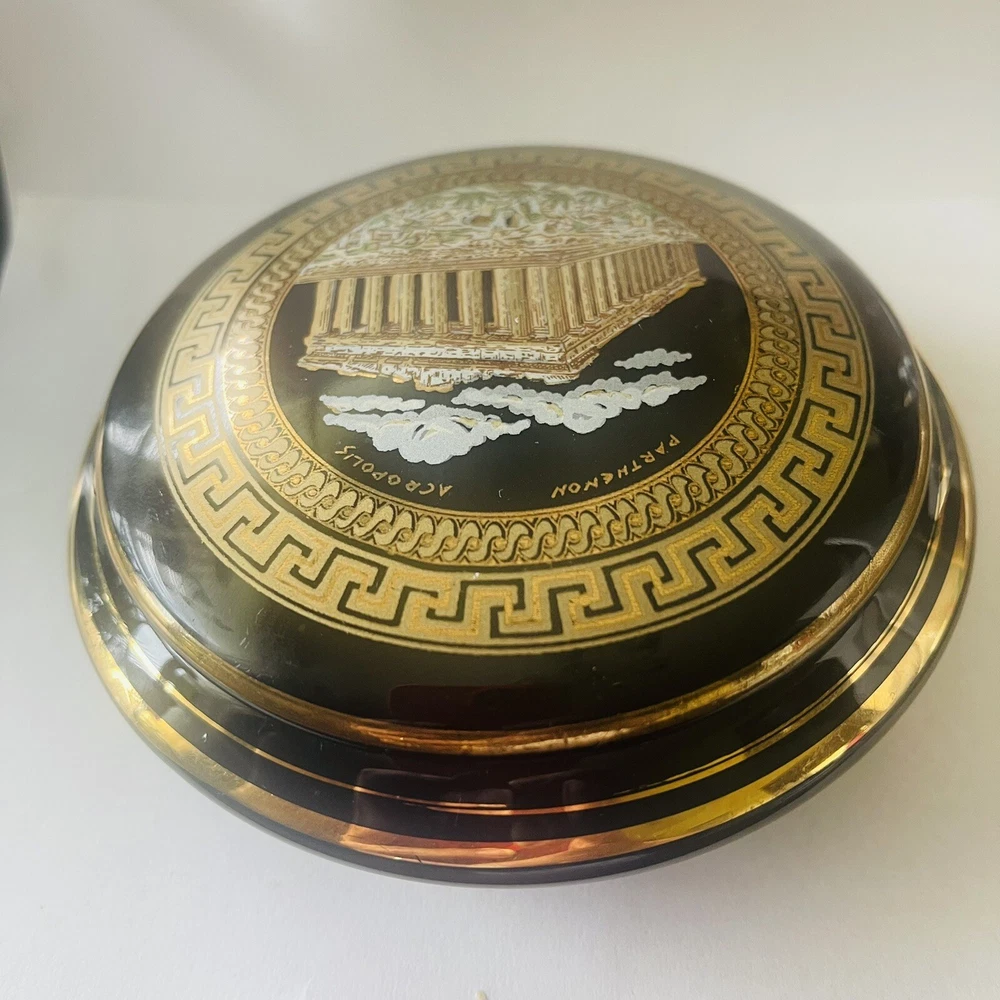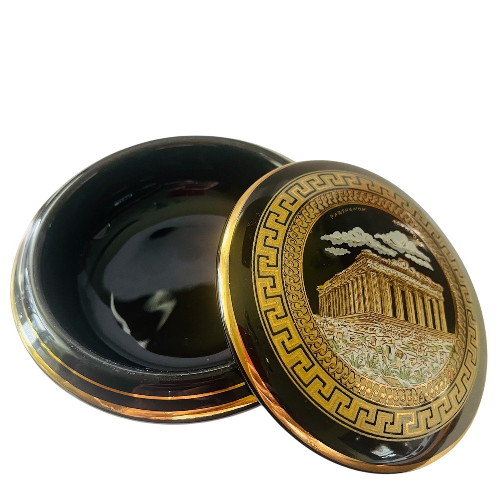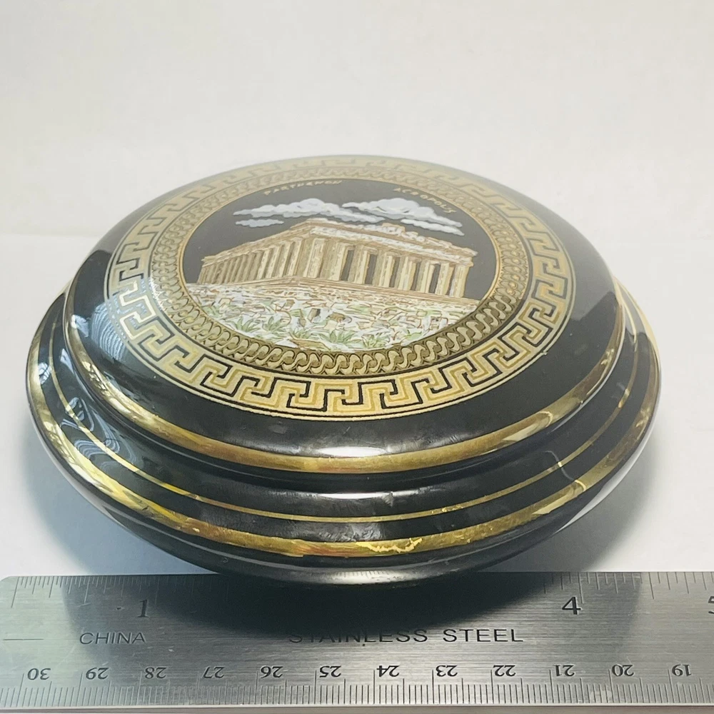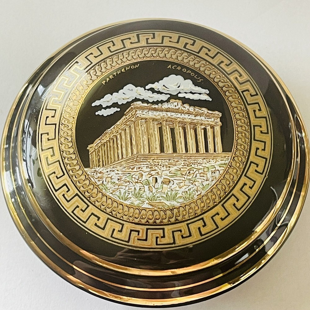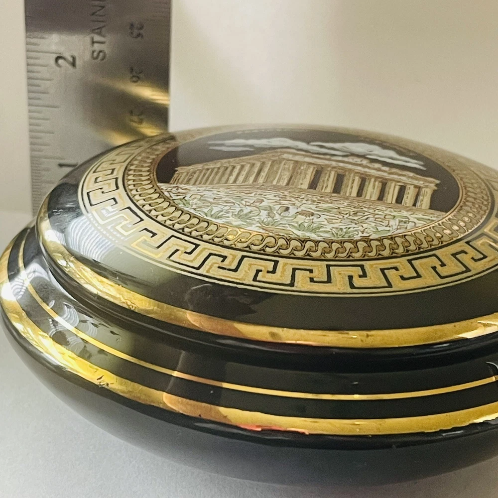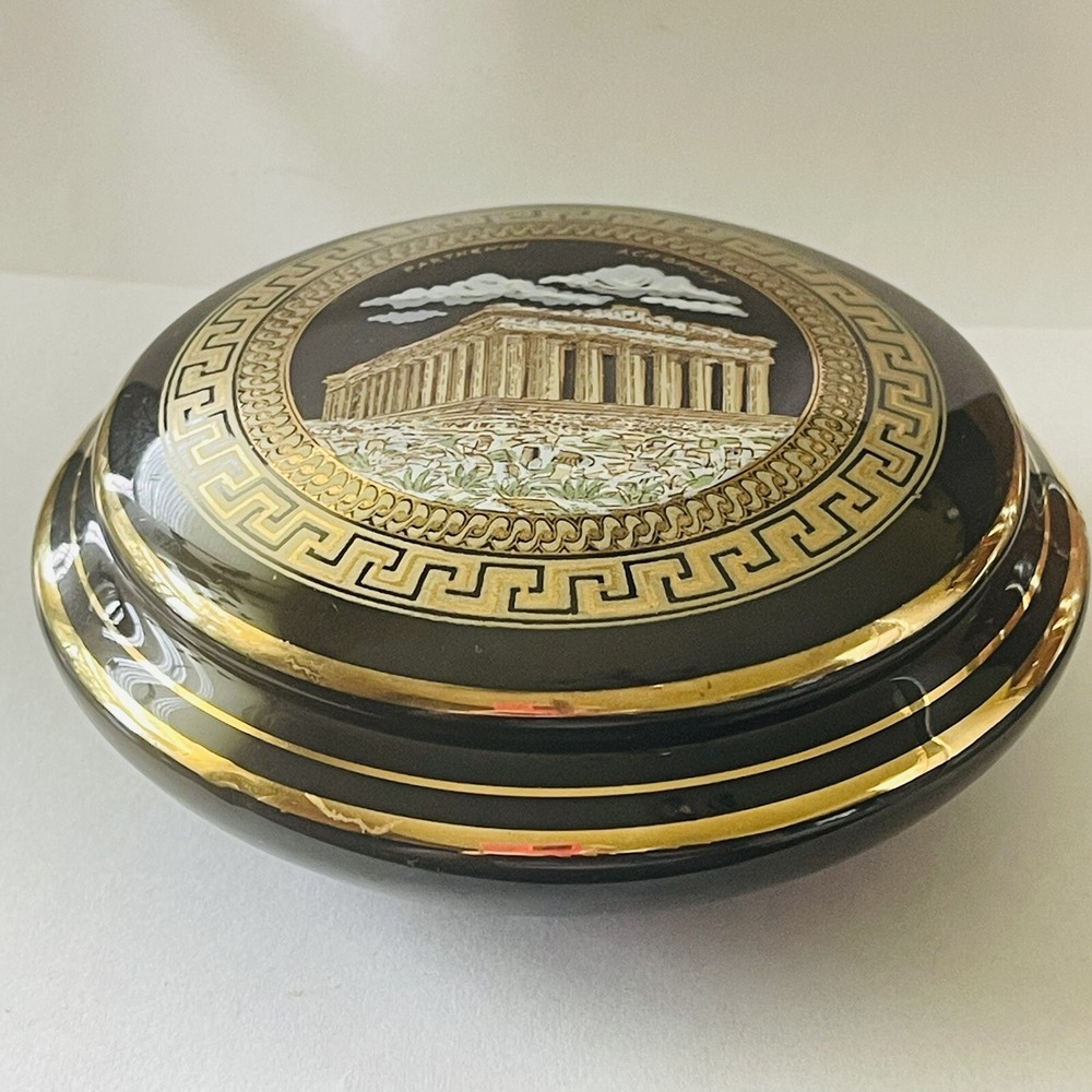 Subject: Parthenon Room: Any Room Color: Black, Gold Packaging: Unboxed Theme: Topographical & Souvenir Material: Ceramic Country/Region of Manufacture: Greece Finish: Polished Style: Greek Collection: Keepsake Boxes Seller Notes: “In good preowned condition w/a few minor scuff marks in the gold enameling. See photos.” Brand: Unbranded Closure Type: Lid Customized: No Shape: Round Department: Adults Type: Trinket Box Engraved: No Occasion: All Occasions Handmade: No