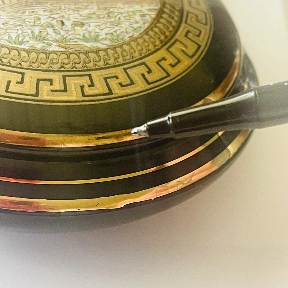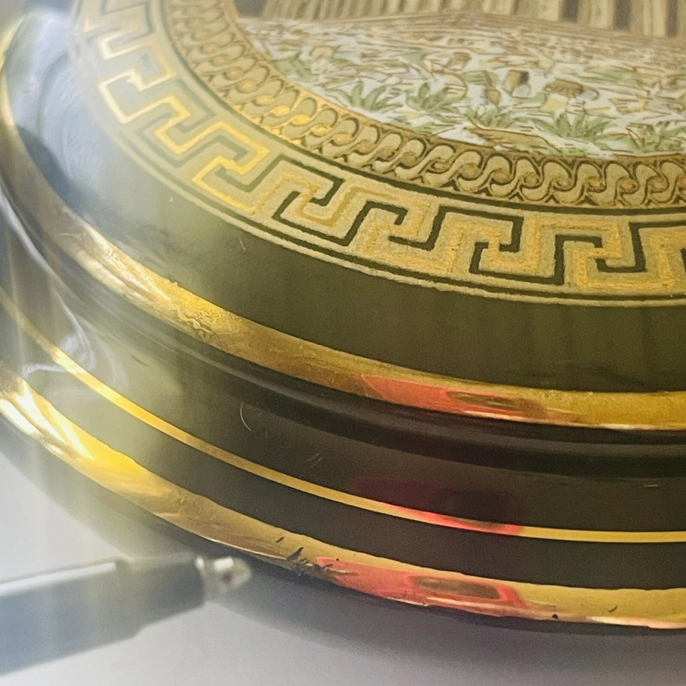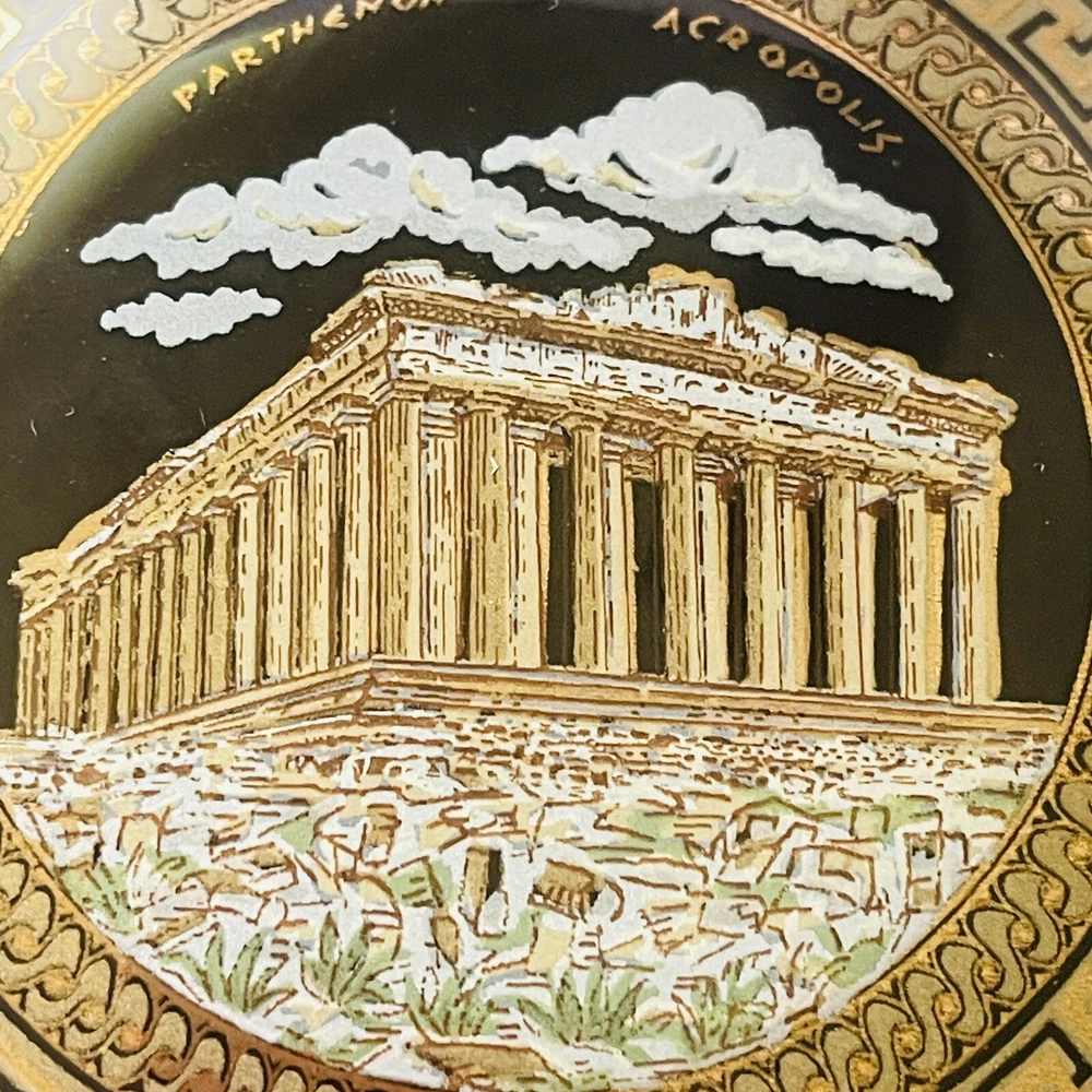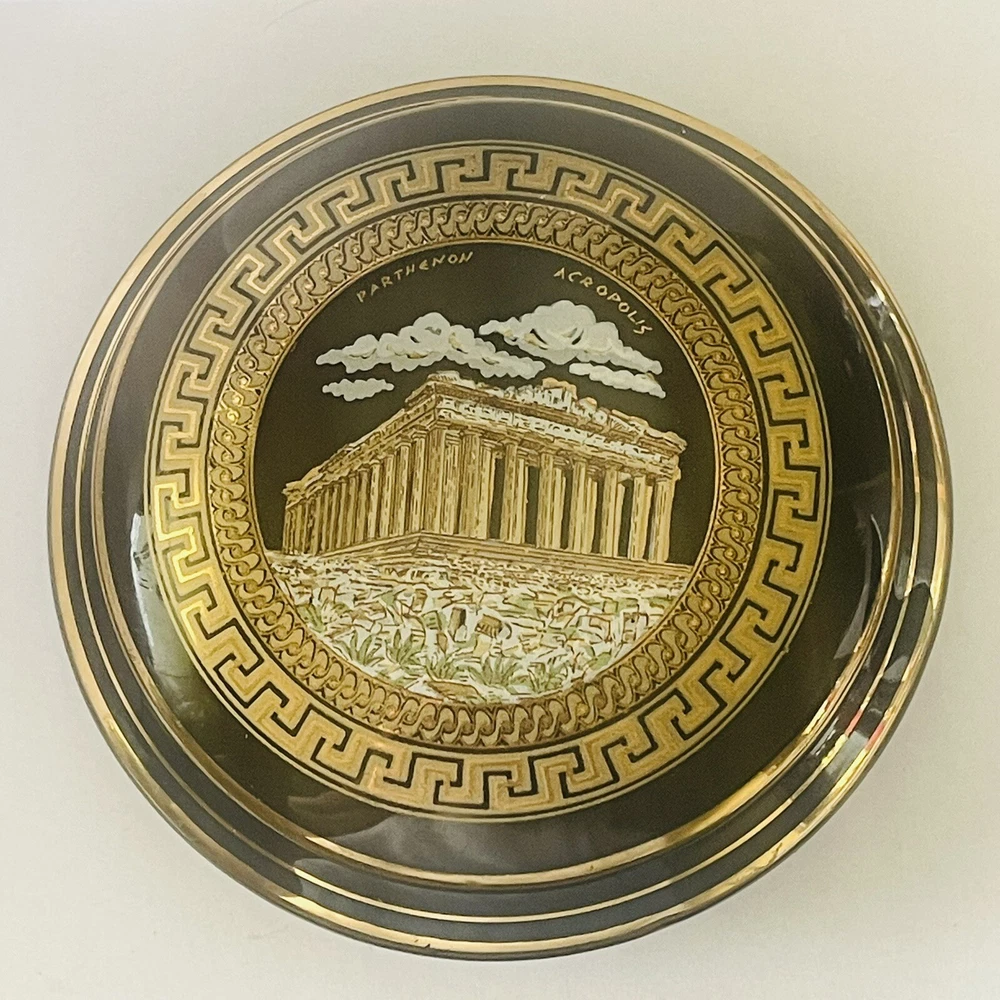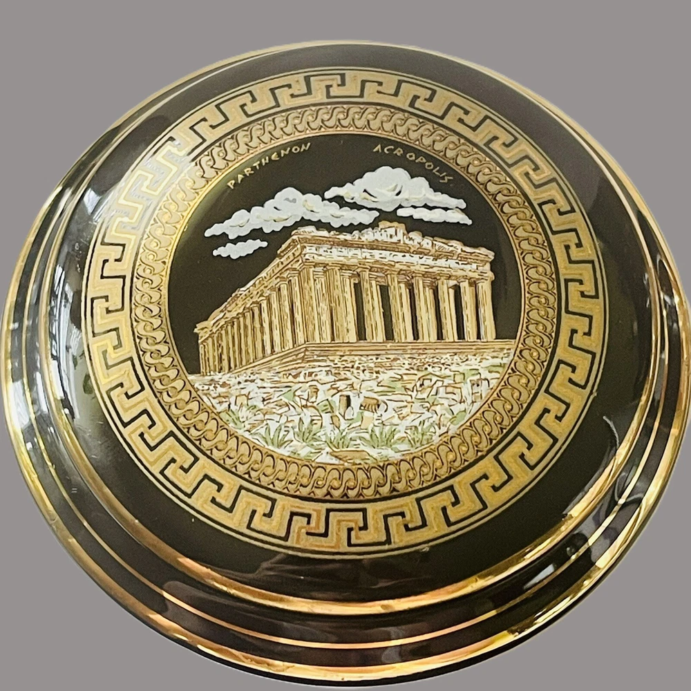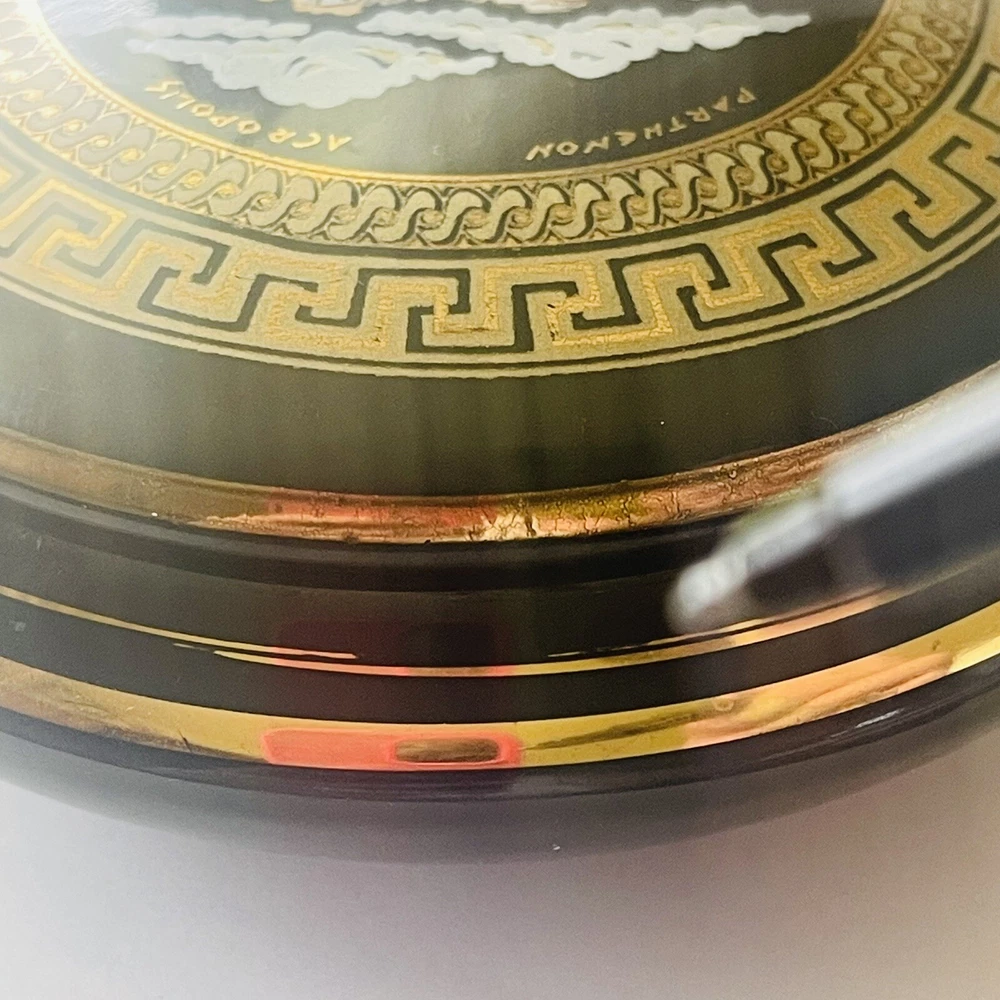 Subject: Parthenon Room: Any Room Color: Black, Gold Packaging: Unboxed Theme: Topographical & Souvenir Material: Ceramic Country/Region of Manufacture: Greece Finish: Polished Style: Greek Collection: Keepsake Boxes Seller Notes: “In good preowned condition w/a few minor scuff marks in the gold enameling. See photos.” Brand: Unbranded Closure Type: Lid Customized: No Shape: Round Department: Adults Type: Trinket Box Engraved: No Occasion: All Occasions Handmade: No