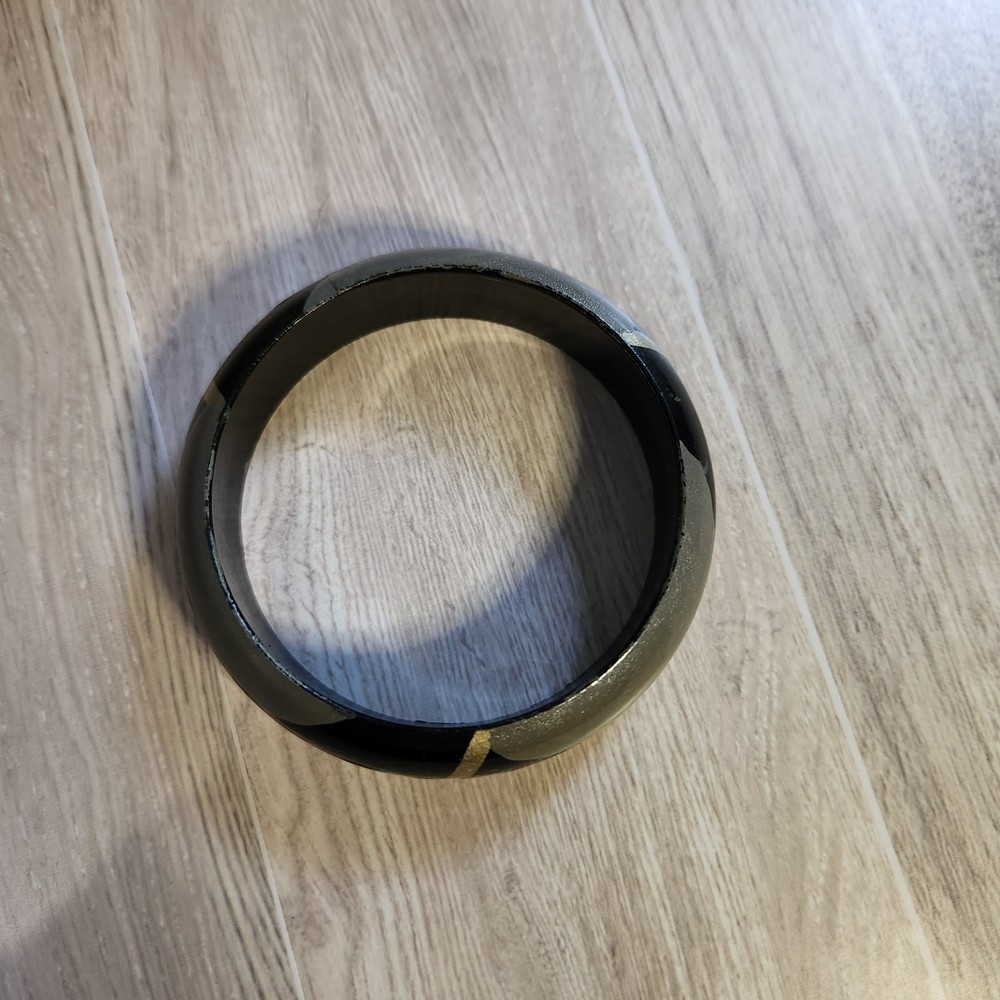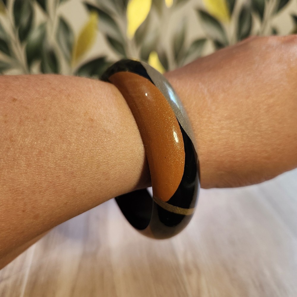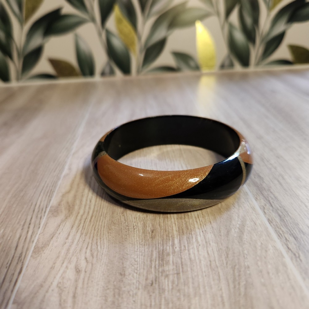 Add a touch of modern elegance to your wrist with this chic enamel painted wooden bangle bracelet! Featuring a striking geometric design in black, shimmering gold, and warm coppery-brown tones, this bangle is a versatile accessory that complements both casual and dressy outfits. Crafted from lightweight wood and finished with a smooth, durable enamel, it's comfortable to wear all day. The unique abstract pattern evokes a contemporary art deco vibe, making it a standout piece. Perfect for stacking with other bracelets or wearing on its own for a minimalist statement. Features: * Material: Wood with enamel paint * Colors: Black, Gold, Coppery-Brown * Design: Geometric / Abstract / Art Deco inspired * Lightweight and comfortable * Excellent condition Measurements: 2.5" diameter 1" wide A fantastic addition to any jewelry collection or a thoughtful gift! wooden bangle, enamel bracelet, painted bracelet, geometric jewelry, abstract design, art deco style, modern jewelry, black and gold, copper jewelry, statement bangle, fashion accessory, women's jewelry