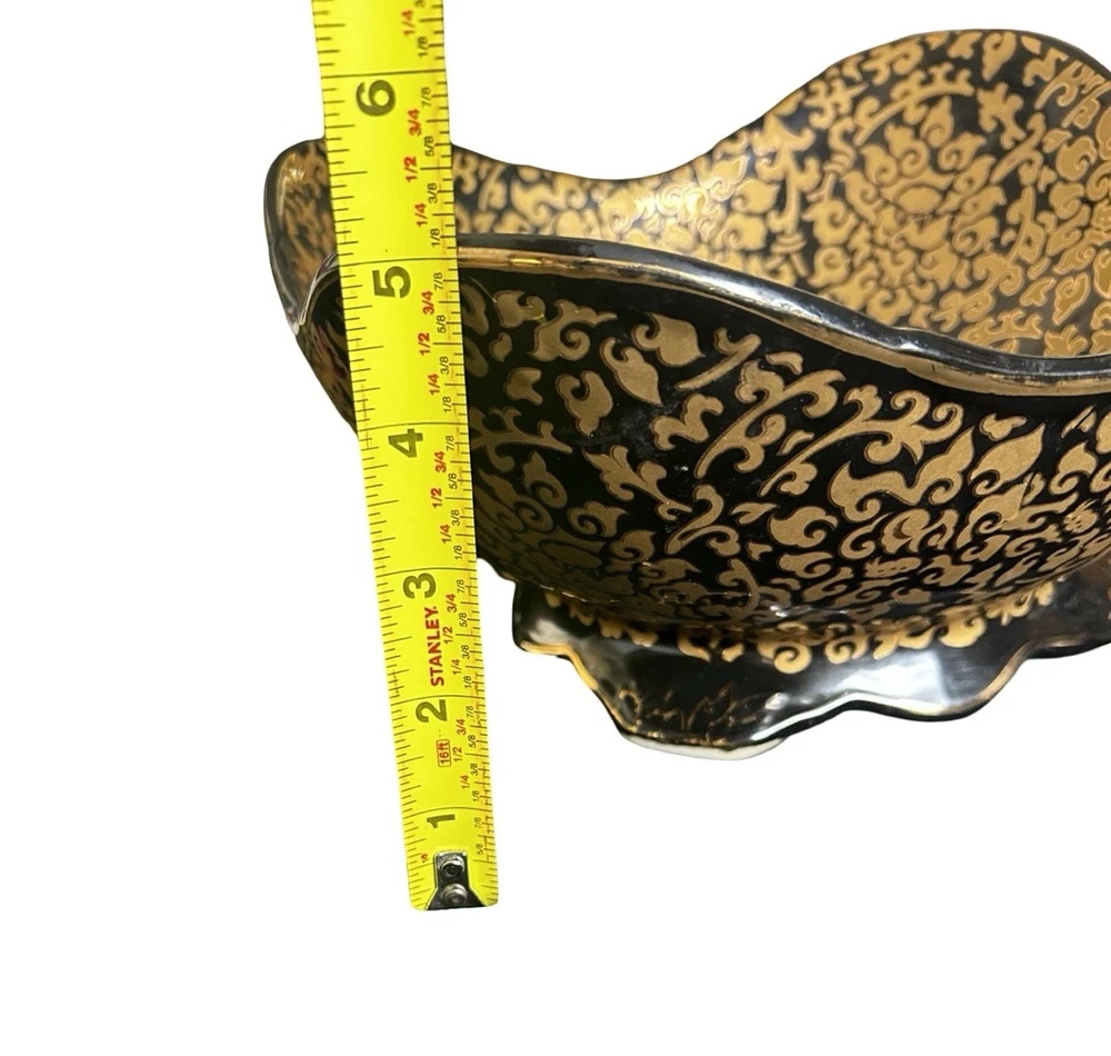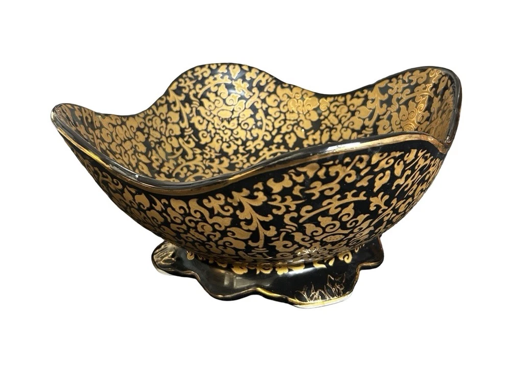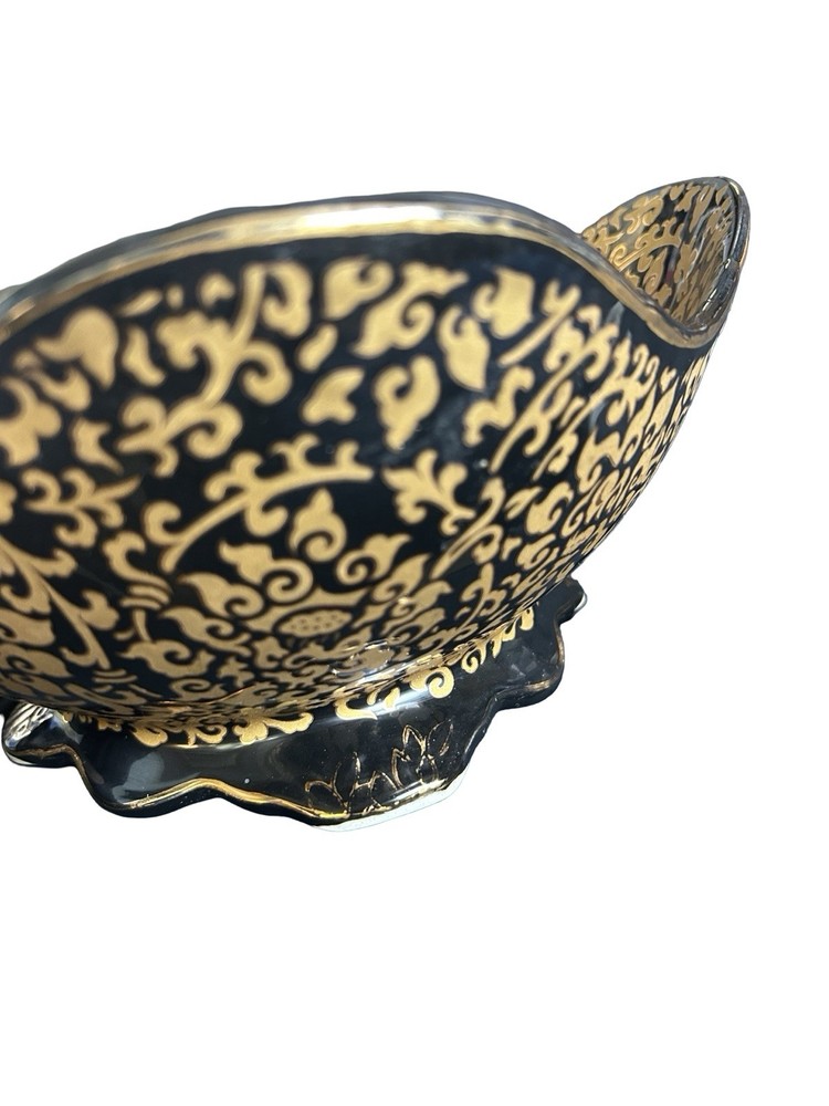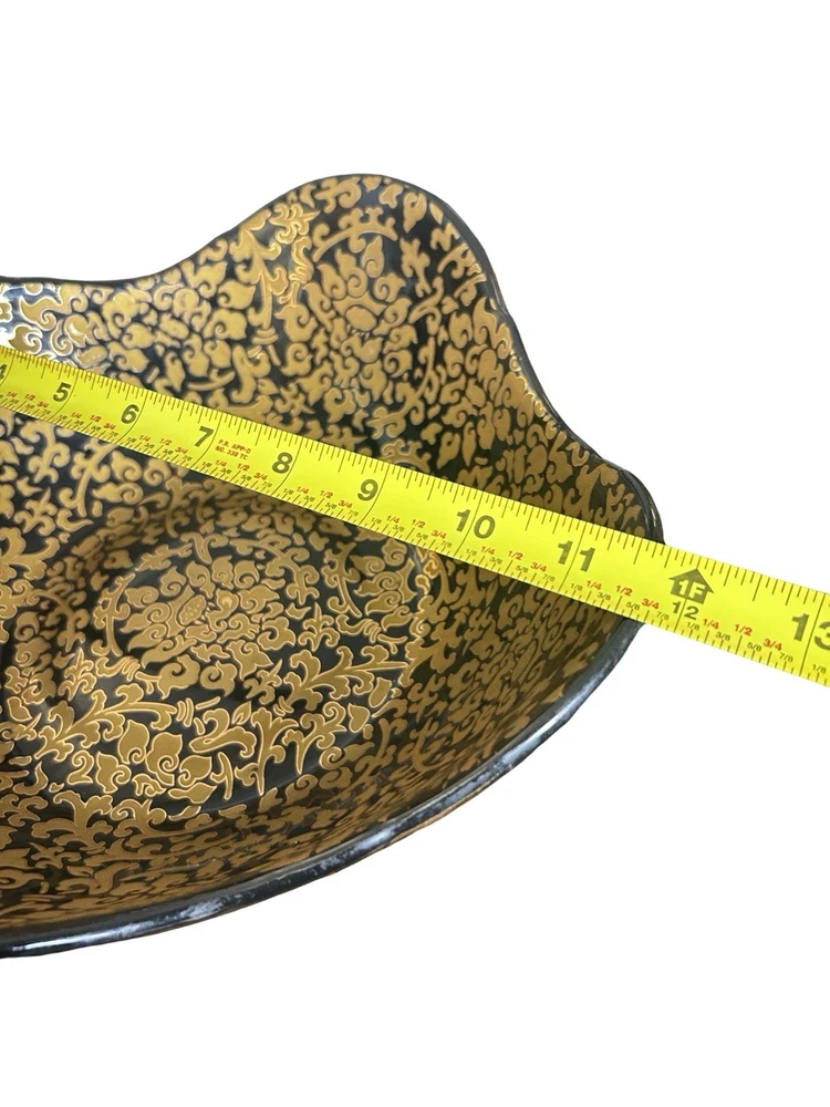 Black Gold Tapestry Scalloped Porcelain Trinket Center Bowl 11" Abstract Leaves Good used condition. Normal signs of wear and use, minor scratches. Please study pictures carefully before purchasing Feel free to ask us any questions. Thank you for visiting our store! Shlf4