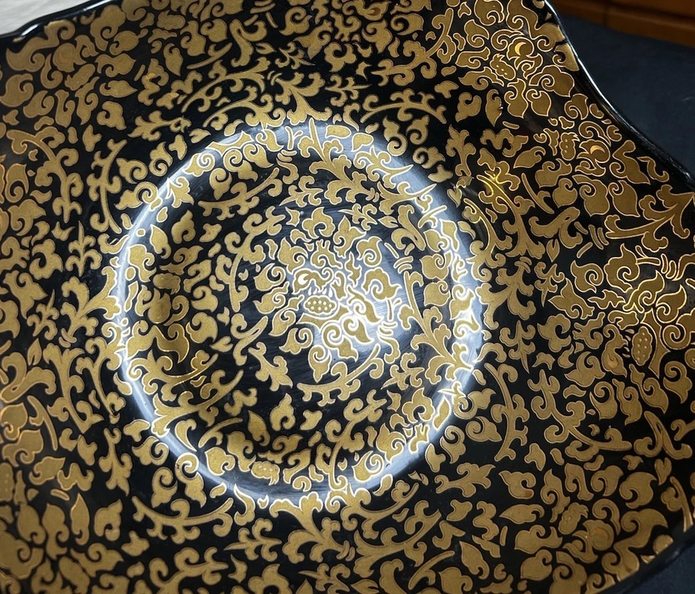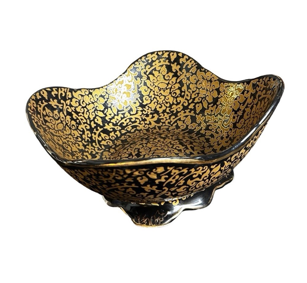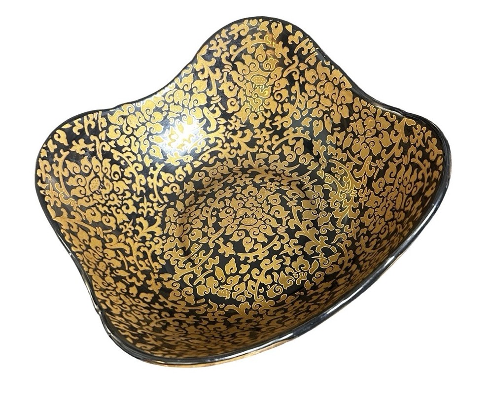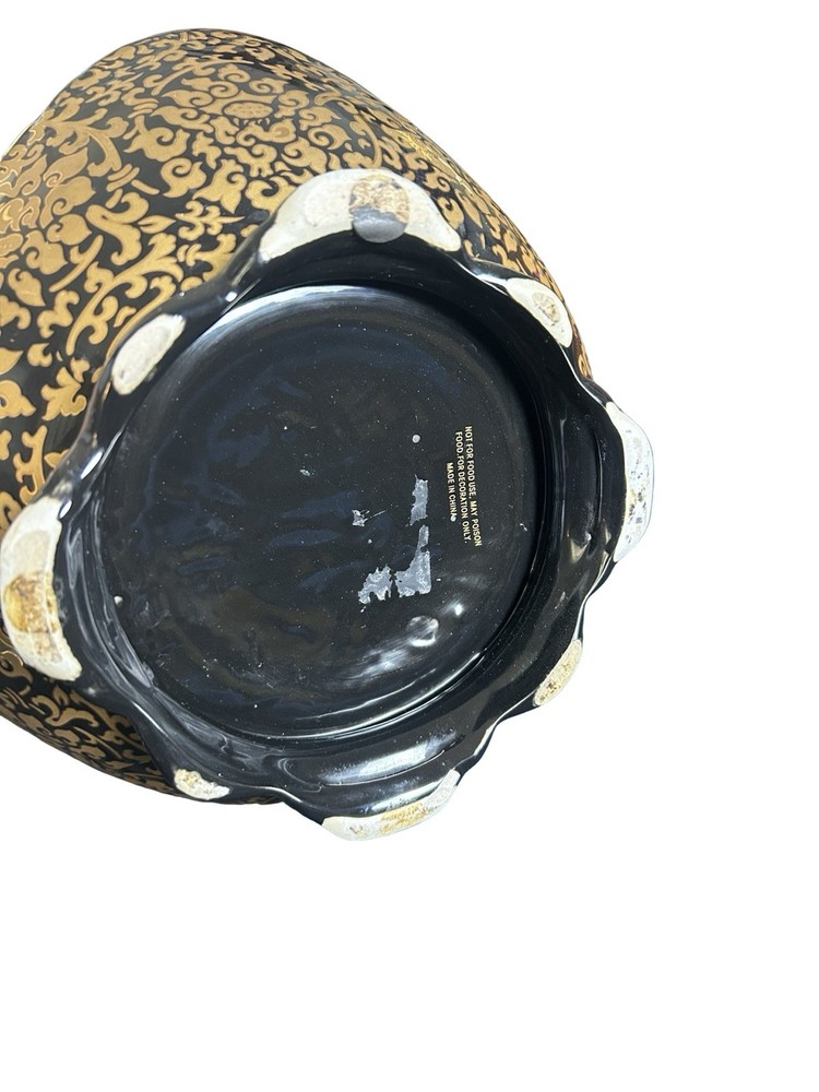 Black Gold Tapestry Scalloped Porcelain Trinket Center Bowl 11" Abstract Leaves Good used condition. Normal signs of wear and use, minor scratches. Please study pictures carefully before purchasing Feel free to ask us any questions. Thank you for visiting our store! Shlf4