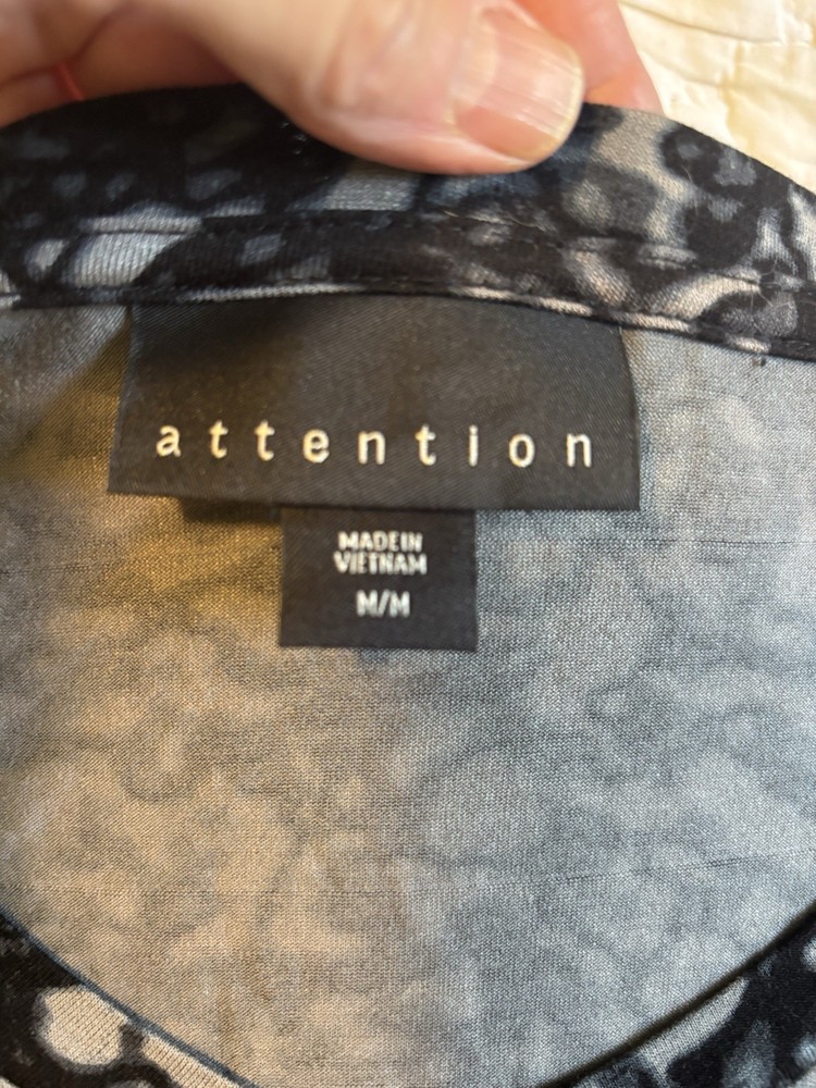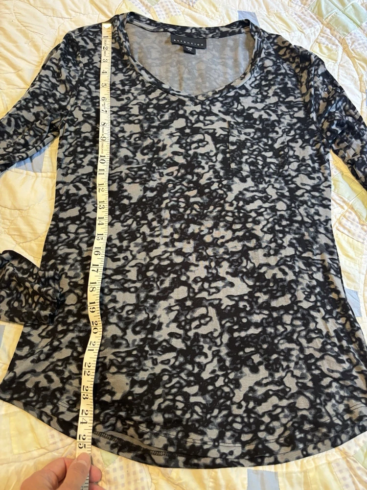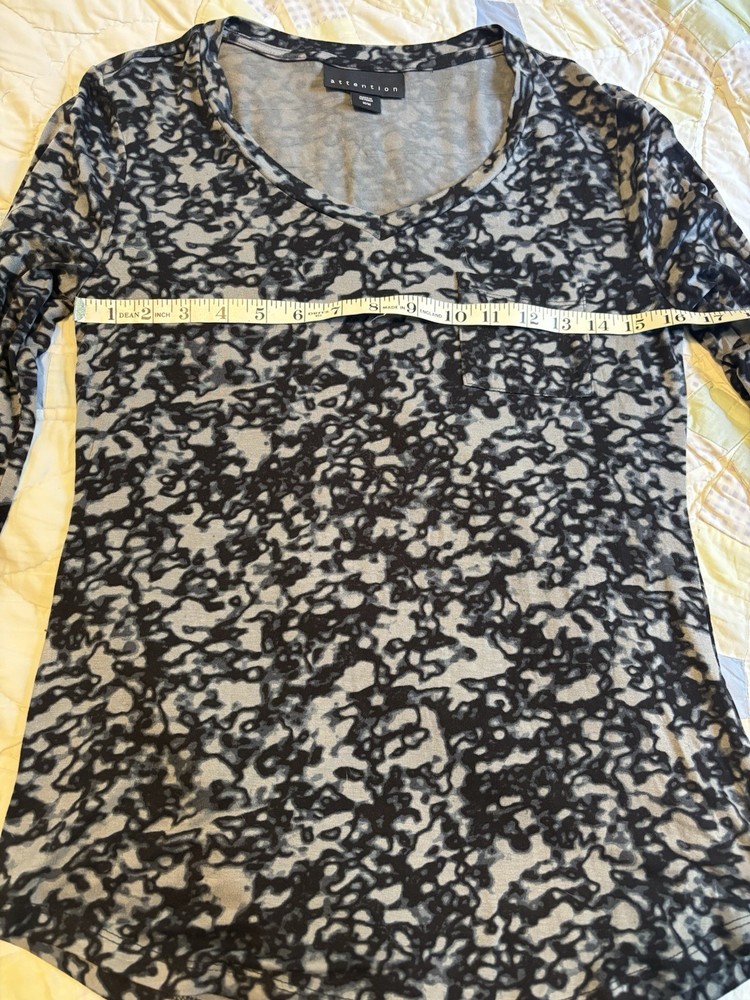 The Attention black gray rayon blouse is a stylish and versatile addition to any woman's wardrobe. Made from a blend of rayon and spandex, this top offers a comfortable and flattering fit. The V-neck design and long sleeves make it a classic and timeless piece, perfect for casual or dressy occasions. The front pocket adds a practical touch, while the black color keeps the overall look sleek and stylish. Perfect for a women who values both fashion and comfort in their clothing choices. Measurements in photos