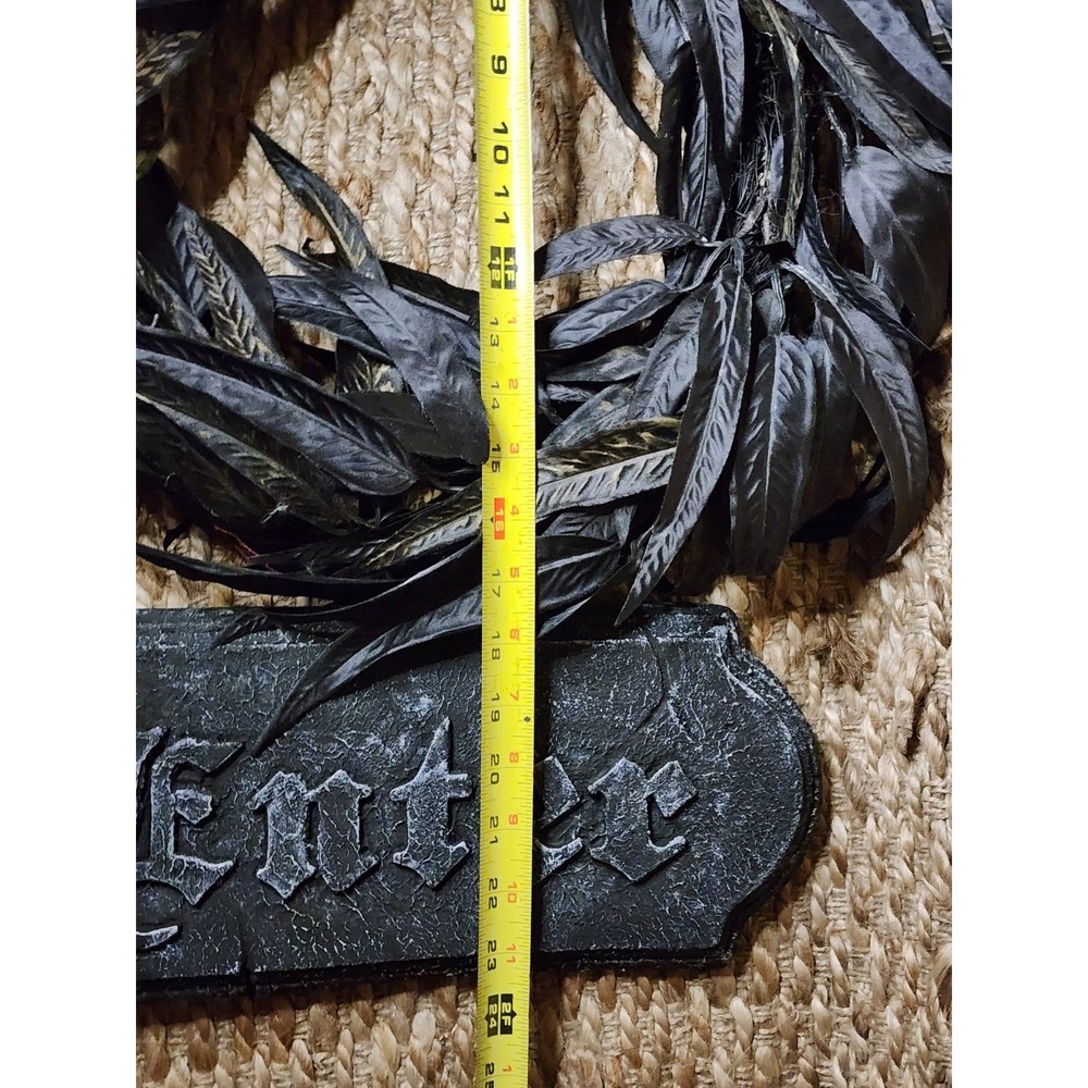 Enhance the spooky ambiance of your Halloween celebrations with this handmade 23-inch by 19-inch "Enter" wreath, a captivating door decoration that sets the perfect eerie tone for your party decor. Crafted with mixed materials, the wreath boasts a striking black color scheme that complements the festive Halloween theme, making it an eye-catching addition to any space. This artificial wreath is designed to provide a lasting and impressive decoration, without the need for maintenance. Its sizeable form factor ensures it's noticeable from the doorway, welcoming guests with a touch of Halloween fun. It's an ideal choice for those looking to create a memorable and festive atmosphere within their homes.