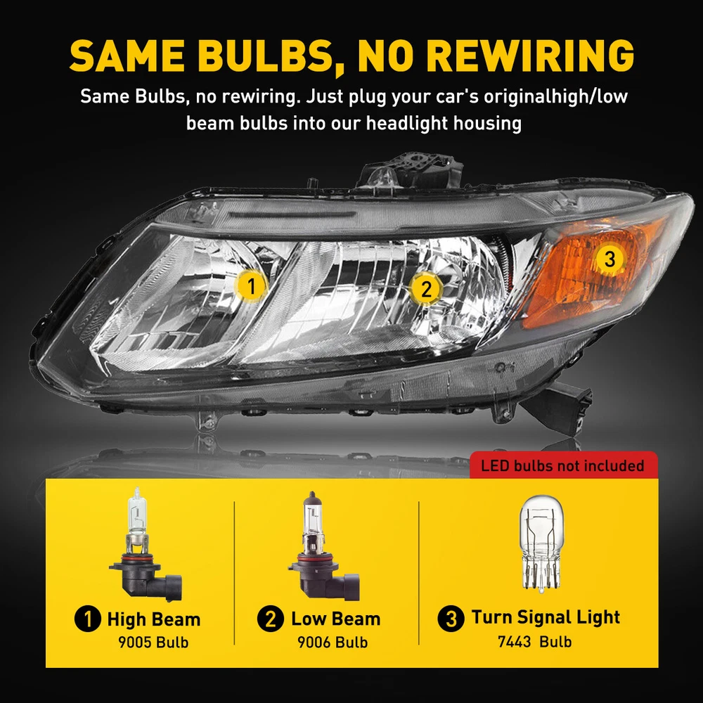 Headlights Headlamps Fit For 2012-2015 Honda Civic etc Fit for: 2012-2015 Honda Civic 4Dr Sedan 2012-2013 Honda Civic 2Dr Coupe Specifications: OE number: 33150TR0A01,33400TR0A01,33150TR2A01,331400TR2A01 HO2502144, HO2503144, HO2502150, HO2503150 Material: ABS+PC (ABS Plastic Housing/Polycarbonate lens) Appearance color: 1.Housing Color: Black 2.Lens Color??Clear 3.Reflector Color??Amber The original bulb type: 1.Low beam:9006 2.High beam:9005 3.Turn signal light:7443 Note: Projector ×??Not include?? DRL × (Not include) Black Headlights For 2012-15 Honda Civic 4-Door Sedan 4Dr 2013 2012 2014 2015 Headlights Headlamps Fit For 2012-2015 Honda Civic etc Fit for: 2012-2015 Honda Civic 4Dr Sedan 2012-2013 Honda Civic 2Dr Coupe Specifications: OE number: 33150TR0A01,33400TR0A01,33150TR2A01,331400TR2A01 HO2502144, HO2503144, HO2502150, HO2503150 Material: ABS+PC (ABS Plastic Housing/Polycarbonate lens) Appearance color: 1.Housing Color: Black 2.Lens Color??Clear 3.Reflector Color??Amber The original bulb type: 1.Low beam:9006 2.High beam:9005 3.Turn signal light:7443 Note: Projector ×??Not include?? DRL × (Not include) Bulb × (Not include) Features: *Easy to install: Direct replacement, drilling and cutting are not required. *Superior quality: Made of ABS and PC materials with toughness and heat resistance functions to ensure its long service life and durability. *Angle adjustment: Equipped with a headlamp Angle adjustment knob, you can adjust the best Angle of view through the knob. *Suggestion: 1.Please confirm the OE number before purchasing!!! 2.Professional installation is required!!! Packaging include: Headlights*2(Left+Right) Item Specifics Brand AUXITO Placement on Vehicle Front Left Right Housing Color Black Lens Color Clear Manufacturer Part Number Does Not Apply Interchange Part Number HO2502144 HO2503144_2012 2013 2014 2015 OE/OEM Part Number HO2502144, HO2503144, HO2502150, HO2503150 Package Include Driver & Passenger Side Attention [Compatible 2012-2013 Civic Coupe Models] [Headlight] Bulb Reuse Stock Low Beam 9006/ High Beam 9005 Bulbs SAE DOT Compliant Yes Lens Heavy Duty Polycarbonate Dust and Moisture Protection Yes Return Free Return Shipping on damaged or defective items Headlight Style Factory Assembly Type Composite Lighting Technology Halogen Fitment Type Direct Replacement FAQ ♥ If you have a decoding problem or any other problems, please contact us first, we will help you with it. We will reply you within 24 hours in working days. I'm a new seller, thanks a lot for your trust and convince! I will serve you with all my heart. ♥ Q1: Will this bulb fit my vehicle? A: We can match almost any vehicle to one of our bulb sizes. eBay only lets us include some vehicle fitments per listing, but if your vehicle does not show up on the compatibility table at the top of our listings, welcome you to contact us for free consulation before purchasing a product. Q2: My item has not arrived, what's taking so long? A: Sometimes items take longer than expected, especially if it’s going far or to rural area. Check with your post office to see if your item has been held up. Sometimes Royal Mail will not update a tracking number until it has arrived at its destination. If your item still don't arrive after a few days, let us know so we can double check for you and help solve it asap. Q3: My bulbs won't fit, help! A: Special bulb holder may be required. See if you can take the holder from the stock bulb. If not, let us know. The bulb size may be wrong, double check the item you received with the item you ordered. Do you have an aftermarket lighting housing? These may not be perfectly fitted for aftermarket bulbs and will require some manual modifications. Q4: Neither side lighting up? Both sides flicker, hyper flash, or work inconsistantly. A:Check the light fuses, and then check the ballast plugs to insure correct installation. If this doesn't work, there may be a voltage problem with the vehicle. You probably just need a relay or capacitor. Even though some bulbs are builtin resistors, they may still need a decoder. Pay & Ship (1). We gladly accepts payment via PayPal, We will ship your item(s) within 24 hours. (2). Before payment, please keep the consistency of Paypal address and ebay address. (3). Quantity orders are welcome! Returns (1). We offer 60 days free return policy. Please contact us within 60 days from the date you receive your order if you have any issues with the product or want return. Refund will be send after we got your resend package. (2). All returned items should be in the original packaging , return tracking information should be provided . Contact Us (1).Negative feedback will not help resolve any problems you have, please contact us via eBay messages before leaving negative feedback , our customer service will make best effort to help you with the issues. (2).We maintain high standards of excellenceand strive for 100% customer satisfaction! Feedback is very important to us. We request that you contact us immediately before you give us neutral or negative feedback, so that we can satisfactorily address your concerns. About us We're professional in car and motorcycle accessories, especially in LED bulbs. We have our own factory and R&D team. Our belief is to sell top quality items that fit your car and serve you with our heart. Anything please feel free to contact us! Our customer service is very responsibility. Come and follow us! DESCRIPTION NEW ARRIVED HOT SALE CONTACT US SAVE US Store Category Store Home Other Hot Item Headlight Assembly For 05-10 Volkswagen Jetta Sedan Wagon Left Right Clear USD 110.99 AUXITO 9012 LED Headlight Bulbs kit High Low Beam 6500K 400% Super Bright Canbus USD 42.99 AUXITO Pair 9007 HB5 LED Headlight Bulb 24000LM High/low Beam 6500K White Canbus USD 38.85 Clear FOR 2007-2013 GMC Sierra 1500 2500HD 3500HD Headlights Lamps Left+Right USD 73.79 For 1996 1997 1998 Honda Civic Left & Right Headlights Assemblies New USD 71.99 New List
