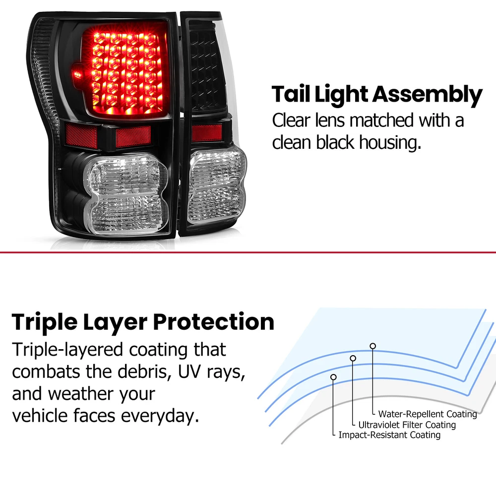 Black Housing LED Tail Lights Brake Lamps Set For Toyota Tundra 2007-2013 FIT FOR: For Toyota Tundra 2007-2013 Specification : Condition: 100% Brand New Color:Clear Lens+Black Housing Lens Color:Clear Housing Color:Black Material: Plastic Lighting Technology:LED Installation Method:Screw-On Placement on Vehicle:Rear, Left, Right Replace for TO2801165, TO2800165,815500C070,815600C070, 815500C090, 815600C090, TO2801183, TO2800183 Features: Helps improve your vehicle's visual appeal. Tail lights are built to withstand adverse weather conditions, including rain, snow, and extreme temperatures. They are often made of impact-resistant materials to protect the light assembly from damage. Package Includes : 1 X Pair of LED Tail Lights ( Driver & Passenger Side) Shipping: All items will be shipped out in 1 business day, no expedited service available. We ship our items to USA only(Does NOT include Hawaii, Alaska or Puerto Rico, PO Boxes/APO's). Shipping Notes: We use multiple warehouses and will select the nearest warehouse for delivery according to your order address and our inventory, Thank you for your cooperation. Contact us: Any Questions, Just feel free to contact us on eBay. We will reply you in 24 hours. On Dec 22, 2024 at 21:23:55 PST, seller added the following information: