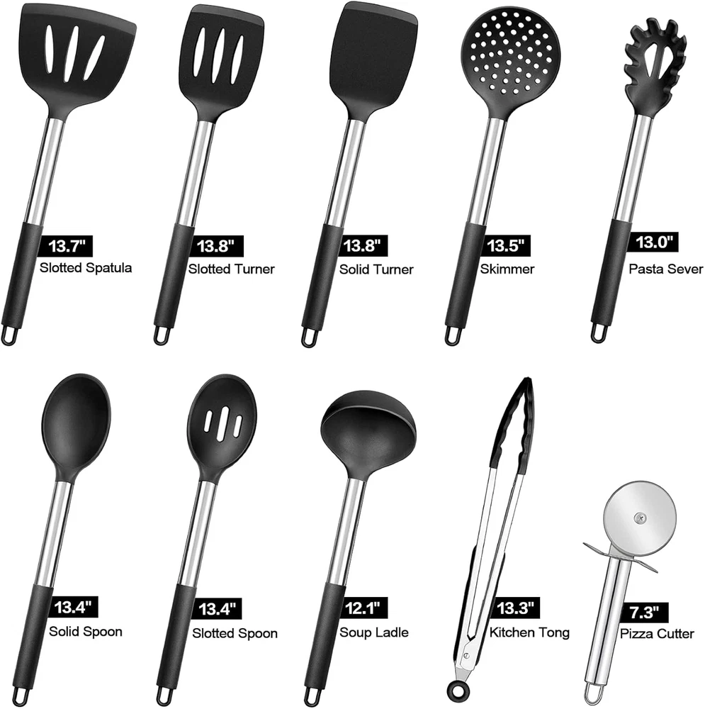 Store New Arrivals Add to Favorite View Feedback Contact Black Kitchen Utensils Set of 10, Heat-Resistant Silicone Cooking Utensil with Stainless Steel Handle, Include Turner,Spatula,Spoon,Tong,Pizza Cutter, Non-Toxic & Non-Stick, Dishwasher Safe Description Item Package Quantity 10 Color Black Material Stainless Steel, Silicone Material Type Stainless Steel, Silicone Is Dishwasher Safe Yes Shape Rectangular Recommended Uses For Product Cooking, Sautéing, Stirring, Scraping Is the item dishwasher safe? Yes Handle Material Stainless Steel Material Type Free Plastic Free 【VERSATILE 10 PCS】 P&P CHEF Kitchen Utensils Set is perfectly fit for various purposes, Include: ●Slotted Spatula, ●Slotted Turner, ●Solid Turner, ●Skimmer, ●Pasta Server, ●Solid Spoon, ●Slotted Spoon, ●Soup Ladle, ●Kitchen Tong, ●Pizza Cutter, This set will bring you excellent using experience 【HEATPROOF MATERIAL】 Our cooking utensils are made of food grade silicone, Will not get musty or produce peculiar smell, Be the greatest for wooden/ plastic cookware, Built to withstand the heat up to 450℉, You can rest assured that it will not melt, warp, discolor or release any toxic substances into your food, Definitely safe and healthy to the human body 【DURABLE &FLEXIBLE】 Featured with heavy gauge stainless steel handle, One-piece seamless design keep it sturdy, Will not break off or fall apart when using, Rust-free and Durable to last for a long service life, Flexible and soft spatula head is great to flip, stir, scrape and fold the most kinds of food without scratching your coated cookware 【EASY USE】 Sturdy handle wrapped in velvety silicone for heat and skid proof grasp, Smooth edge without sharp angles, Prevent cutting you hand, All the utensils are dishwasher safe, Non-stick and stain-resistant attributes make hand-wash in a breeze Big holes at the end of the handles for easily hanging on the kitchen wall 【ECONOMICAL SET】 Save a lot of money than buying them separately, Whether cooking sautéing, stirring or scraping, This utensil set will cater all your needs with their different feature, Best gift idea - Classic color set with a good-looking packaging box, for both aesthetics and practicality, A Ideal present for your friends Product Description P&P CHEF Kitchen Utensils Set of 10 is made of food grade silicone and stainless steel, Will not have any harmful substance into your food, Rust-free and Durable to last for a long service life. Have high-strength flexibility, Corrosion and heat resistance, Bringing you a healthier cooking experience. The 10-Piece cooking utensils will meet all your needs, such as cooking/ serving/ mixing/ preparing, etc. Perfect kitchen tools for your everyday cooking. WARM TIPS: ✔ Please Do Not rub them with a sharp metal. ✔ Please Do Not Directly Flame Fire on the Utensil. ✔ Please don't leave them in the sun for a long time. ✔ Please wash with soft dishcloth in warm, soapy water. ✔ Please dry them after washing, Store in dry place for their durability. SPECIFICATION: Material: Silicone, Stainless Steel Color: Black PACKAGE INCLUDE: ● Slotted Spatula ● Slotted Turner ● Solid Turner ● Skimmer ● Pasta Server ● Solid Spoon ● Slotted Spoon ● Soup Ladle ● Kitchen Tong ● Pizza Cutter ADVANTAGES: Certified Quality - Free from harmful substances, Healthier for daily cooking, Better than typical plastic/ wooden utensils. Dishwasher safe - Dishwasher safe without taking your valuable time, Also easily clean up by hand-wash. Easy Storage - Big hole at the end of the handle, Easy to hang on the kitchen wall, convenient to save storage space and get them when you need. ABOUT US We offer the best prices around on high quality products. Our E-store includes media such as books, movies, music and games while offering electronics, toys, sporting apparel, clothing, tools, general home, garden items and more. SHIPPING We are always working hard to ensure your package arrives as soon as possible. Please understand that some factors like weather, high postal traffic, and the performance of shipping companies are outside of our control. We offer free shipping to the lower 48 states and ship within 2 business days of payment, usually sooner. We do not accept P.O. Boxes. Please provide a physical address. For shipping outside of the continental USA, we only use eBay's Global Shipping Program.The item is shipped to KY and then sent to the rest of the world. International customers are responsible for all duties and taxes. Continue to check out in order to calculate costs for shipping the item to your country. Messages regarding eBay's Global Shipping Program MUST be directed at eBay EXCLUSIVELY. RETURNS We offer a 30-Day Return Policy on items which you are not completely satisfied with. You have the option for a full-refund or an exchange of the item. No returns are available on items shipped outside of the USA. PAYMENT We accept PayPal. CONTACT US This page content is yet to come Please ad us to your favorite seller and visit again later Thank You CUSTOMER SATISFACTION We try our very best to make sure every customer is completely satisfied. If there's a problem, message us! We're happy to help. WE ACCEPT Copyright © 2021 AutoDS. | All Rights Reserved