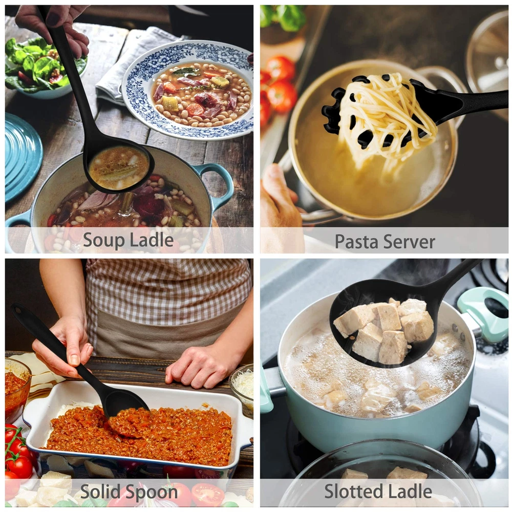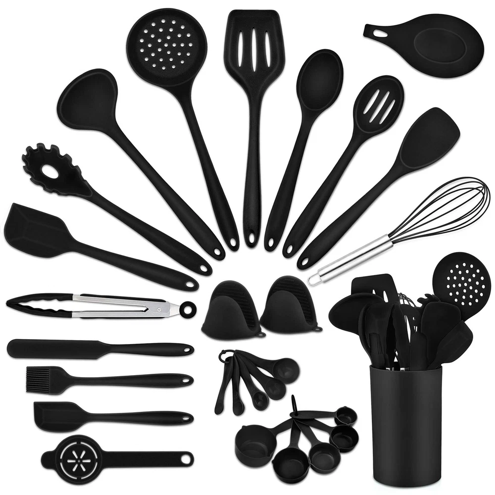 【28 PIECE UTENSIL SET】Our 28Pcs cooking utensil and spatula set will meet your all kinds of needs in kitchen, More convenient for cooking, baking ,serving and mixing, Including slotted turner/ladle, soup ladle, slotted/solid spoon, pasta server, large/small spatula, spoon spatula, silicone brush/kitchen tong/mat, 2 oven mitts, small jar spatula, egg beater/separator, 5 measuring cups and 5 spoons and a holder 【FOOD GRADED & DURABLE】Utensils and measuring cups are made of food-graded silicone and plastic, No materials, No peculiar smell, No musty or no chipping, More durable than the wooden, Silicone head could protect your non-stick pan from scratch,Proper maintenance could extend their service life even extend the life of your pots and pans! Black set is classic and popular to join your modern kitchen, To be a good gift choice 【FOR DAILY USE】Each silicone utensil is up to 446℉, Easy to serve hot food by our utensil, like serving soup by soup ladle/whisk hot butter and sauce by spatula/stir fry vegetables by turner, Meet your everyday cooking needs, DO NOT put them near open flame or put them in the burning pot for a long time if nobody cares, Trying put the utensil on the mat to reduce the risk of melt 【ERGONOMIC DESIGNS & EASY TO USE】Our handle of the utensil conform to ergonomic, Skid resistant surface and handle shape for grip effortlessly whether or not your hand is wet, The big hole on the handle end for easy to hang on the pothook, Also can put them in your holder, To maximize cabinet space saving, Lightweight and easy taking for camping, Easy to clean by hand, Just rinse under running water or throw them in the dishwasher 【ACCESSORIES IN KITCHEN】In our utensil set, no only have utensil and spatula, also have some accessories, making your baking more convenient, Egg separator helps to separate the yolks from egg, 10 pieces measuring cups and spoons with a accurate measurement of food, Silicone brush for brushing sauce on meat, Silicone mat could keep your utensil more hygienic and clean, Oven mitts could help to move heated pot or food to protect your hand from scald
