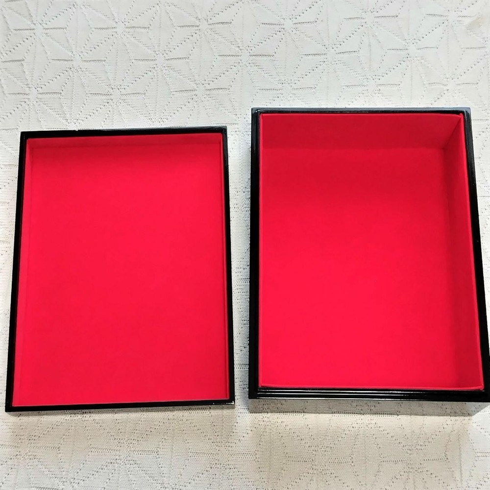 Black Lacquer Box with Gold Foil Leaf Pattern Aizu Wakamatsu Gift Key Features ✔ This black lacquered box features an elegant gold leaf pattern design. The interior is red, providing a striking contrast. External dimensions are approximately 30cm (height) x 22cm (width) x 11cm (depth). The bottom of the exterior bears an inscription from the Aizu Wakamatsu Public Wholesale Market, suggesting it may be Aizu lacquerware. The lid has a small scratch. Please note, this item has been stored at home, so those sensitive to minor imperfections should consider carefully. ✔ - Design: Black lacquer finish with gold leaf pattern ✔ - Interior: Red lacquer ✔ - Shape: Box with lid ✔ - Material: Lacquerware ✔ C: Size : 30cm x 22cm x 11cm ✔ C:Material : Lacquerware ✔ C: Color : Black, Red ✔ C:Design : Gold leaf pattern on black lacquer ✔ C: Condition : Small scratch on lid ✔ C:Origin : Possibly Aizu lacquerware Specifications Brand NO BRAND Country Japan Product Description Description Please refer to the photos. Shipping ・We always send the item with a tracking number. So please place an order without any concern on delivery. You can alway track the delivery status. ・Shipping is only available to the address registered in eBay. If you want us to send another location, please change the address on eBay and place an order. ・Shipping is available from Monday to Friday. Fright companies are closed on Weekends. International Buyers - Please Note: For buyers in the United States: Import duties and taxes are included in the item price or shipping cost. Items shipped to the U.S. are sent under the Delivered Duty Paid (DDP) method, which means all import-related charges are prepaid. You don’t need to pay any additional fees when your order arrives. For buyers outside the United States: Import duties, taxes, and charges are not included in the item price or shipping cost. These charges are the buyer’s responsibility. Please check with your country’s customs office to determine what these additional costs will be before bidding or buying. Statement on Legal Compliance and Quality Assurance for the Sale of Used Goods At our business, all used items are directly purchased from trusted consumers or authorized sellers. This ensures the provenance and quality of each product. We strictly adhere to the following practices: Legal Compliance: The products we handle comply with the Lanham Act, Common Law infringement, Unfair Competition Prevention Laws, and equivalent laws in other countries. This is because we thoroughly verify the origin and rights of each product, and seek legal advice when necessary. Quality Assurance: We rigorously clean and disinfect all items before listing them for sale and conduct quality control checks. This guarantees that we provide safe, high-quality products to our customers. Transparency and Responsibility: If it's brought to our attention that any of our listings may violate the aforementioned laws, we will promptly investigate and take the necessary actions. Moreover, we commit to promptly correcting any misinformation and maintaining transparency. Handling of Misinformation: While we strive for accuracy, there may be instances of unintentional misinformation due to human error. If you encounter such issues, please contact our administration. We promise to address your concerns with courtesy and professionalism. Customer Engagement: We always respond courteously and promptly to customer feedback and inquiries. We are committed to ensuring that our customers can shop with confidence and enjoyment. If you have any questions or concerns about our products, please do not hesitate to contact us.