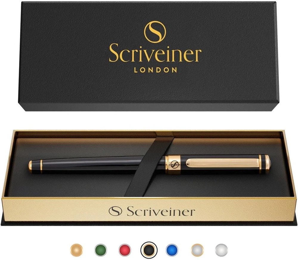 Enjoy the feel of a true luxury pen in your hand – Stunning luxury rollerball pen by Scriveiner. Brass with jet-black lacquer finished in 24 karat gold. Premium quality and understated luxury from a boutique British brand. Transcribe your thoughts effortlessly – We use the Schmidt liquid ink system from Germany which allows your pen to glide smoothly across any type of paper. This combines the ink feel of a fountain pen with the convenience of a ballpoint and gives a superior writing action to gel ink pens. Perfectly weighted and balanced for your writing comfort – this is a luxury pen designed for those who love to write every day. Impress your colleagues and your love ones – The pen comes in a beautiful presentation box making it the perfect gift. Whether as a casual or executive pen, for work, office or personal use, your Scriveiner rollerball will be admired by those around you. Express elegance, sophistication and understated luxury – Scriveiner pens are designed in London, England and share the timeless attributes of classic British design. Buy with total confidence – Incredible customer service and money back guarantee. Our customers are at the heart of everything we do. If you are not satisfied then we will put it right or refund you – whichever you prefer. We know the quality of our products and we want you to have the best possible. A perfect gift – Beautifully boxed and ideal for Father's Day, Mother's Day, Graduation, Christmas, or for a favourite teacher. Or simply as a present to treat yourself! Product Description Winner of King's Award by His Majesty King Charles III (2023) Scriveiner Ballpoint Pen For those moments when smooth precision is key, the Scriveiner Ballpoint is an excellent choice. Scriveiner Rollerball Pen Savour the convenience of a ballpoint with the luxurious feel of a fountain pen with our liquid ink Rollerball pens. Scriveiner Fountain Pen Our beautifully crafted fountain pens, made with German Shmidt nibs are the epitome of luxury pens. For those who are looking for that special unique experience that can only happen with a traditional fountain pen. Scriveiner EDC Pen Range For a luxurious everyday carry pen available in both fountain pen and rollerball, the Scriveiner EDC pens are the epitome of understated sophistication. Designed to fit in your pocket and also be a full size pen with the lid posted. This versatile and perfectly weighted range of pens give a superb writing experience. Scriveiner Ballpoint Scriveiner Rollerball Scriveiner Fountain Pen Scriveiner EDC Range Experience a thrill of pleasure as you enjoy the beauty, quality and understated luxury that a Scriveiner pen delivers with every stroke across the page.