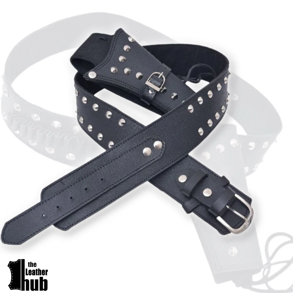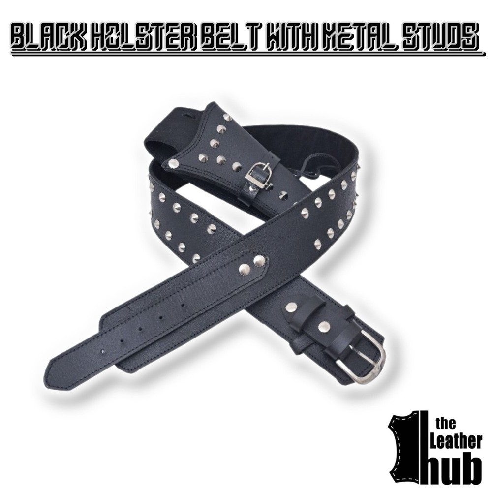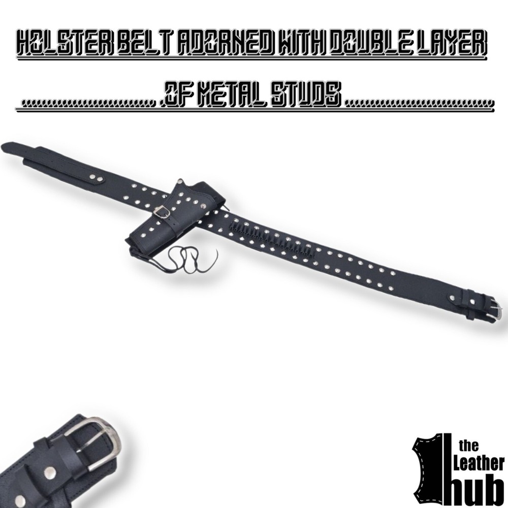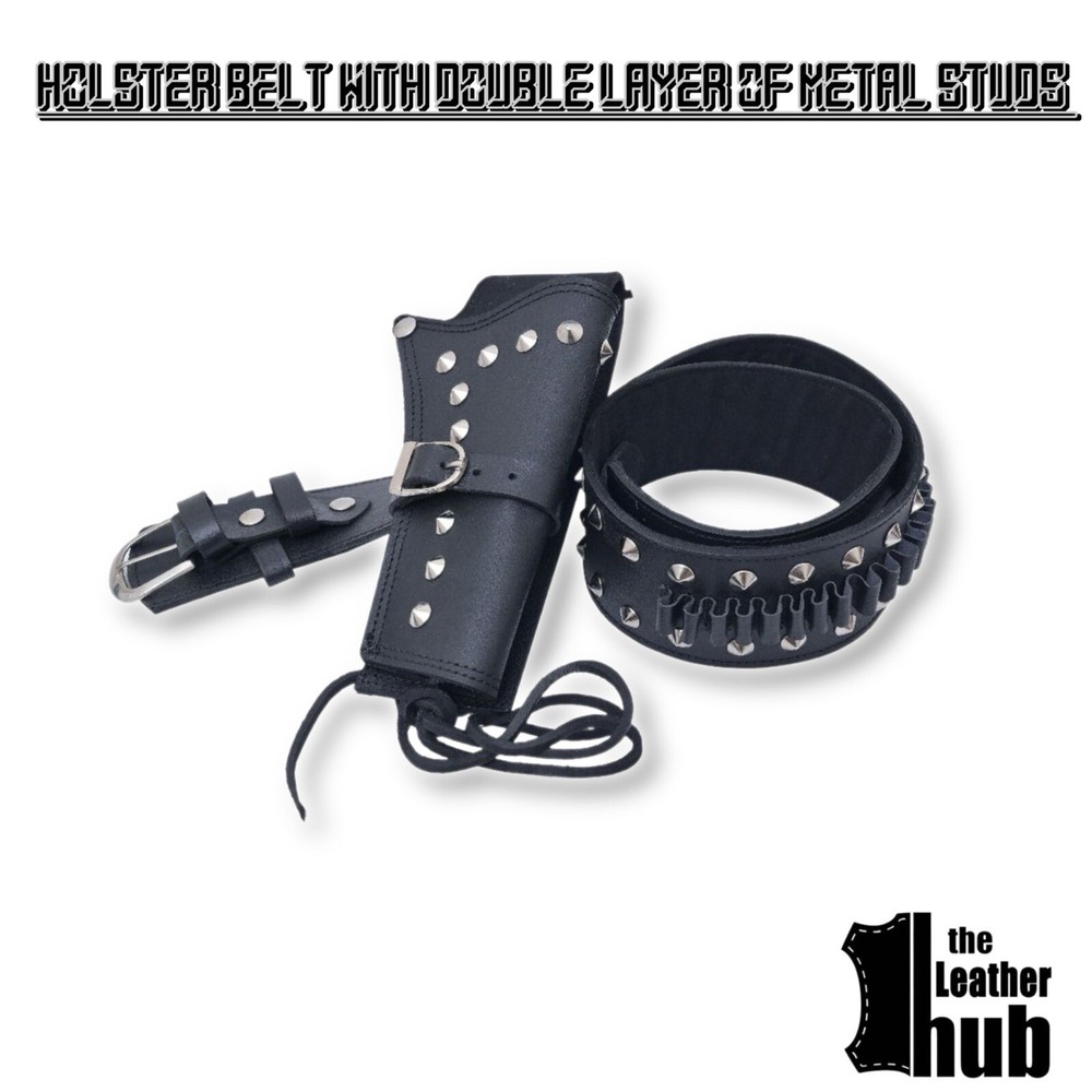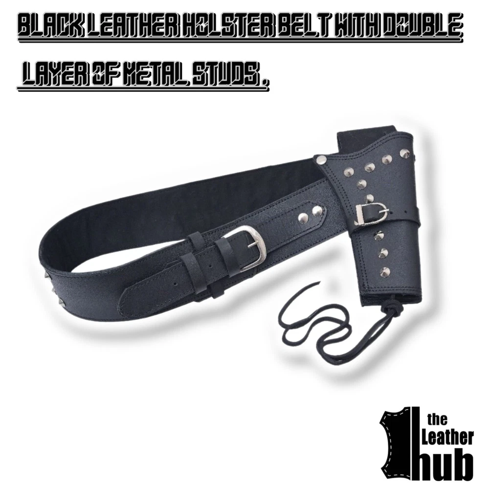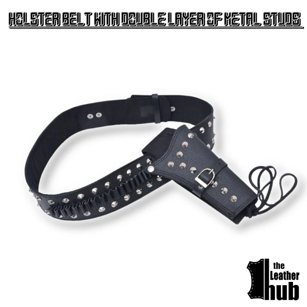 Holster Belt Black Leather Gun Revolver Holder Conical Studded Punk Cowboy Style This product data sheet is originally written in English. Conical studded black Leather single gun holster belt This black leather holster belt is designed in a punk style with conical double layer studs, giving it a unique and edgy look. Features:- It features a gun revolver holder, making it both functional and fashionable for those who enjoy a cowboy or punk aesthetic. Adjustable strap suits most makes it versatile to fit most sizes. Material:- Made with pure genuine Leather the belt will last you longer if handled with care and store in a dry place.Metal studs are high quality stainless steel. The belt is made of leather and metal materials, with a width of 7.5 cm and adjustable features for a comfortable fit. Department:- This Western style belt is suitable for both men and women who appreciate bold. and statement accessories that add a touch of rebellious flair to their outfits. It’s adjustable strap suits most sizes from 32-48 Please refer to our size guide to check your required size. This black leather holster belt is designed in a punk style with conical double layer studs, giving it a unique and edgy look. It features a gun revolver holder, making it both functional and fashionable for those who enjoy a cowboy or punk aesthetic. Adjustable strap suits most makes it versatile to fit most sizes. Made with pure genuine Leather the belt will last you longer if handled with care and store in a dry place.Metal studs are high quality stainless steel. The belt is made of leather and metal materials, with a width of 7.5 cm and adjustable features for a comfortable fit. This Western style belt is suitable for both men and women who appreciate bold. and statement accessories that add a touch of rebellious flair to their outfits. Please refer to our size guide to check your req Pattern Solid Character Punk Character Cow Boy Belt Width 7.5 Cm Size Multiple Material Leather, Metal Accents Studded Colour Black Vintage No Brand TheLeatherHub Size Type Regular Department Unisex Adults Type Belt Hardware Material Stainless Steel Theme Western Style Studded Belt Features Adjustable Country/Region of Manufacture United Kingdom Handmade Yes Personalise No