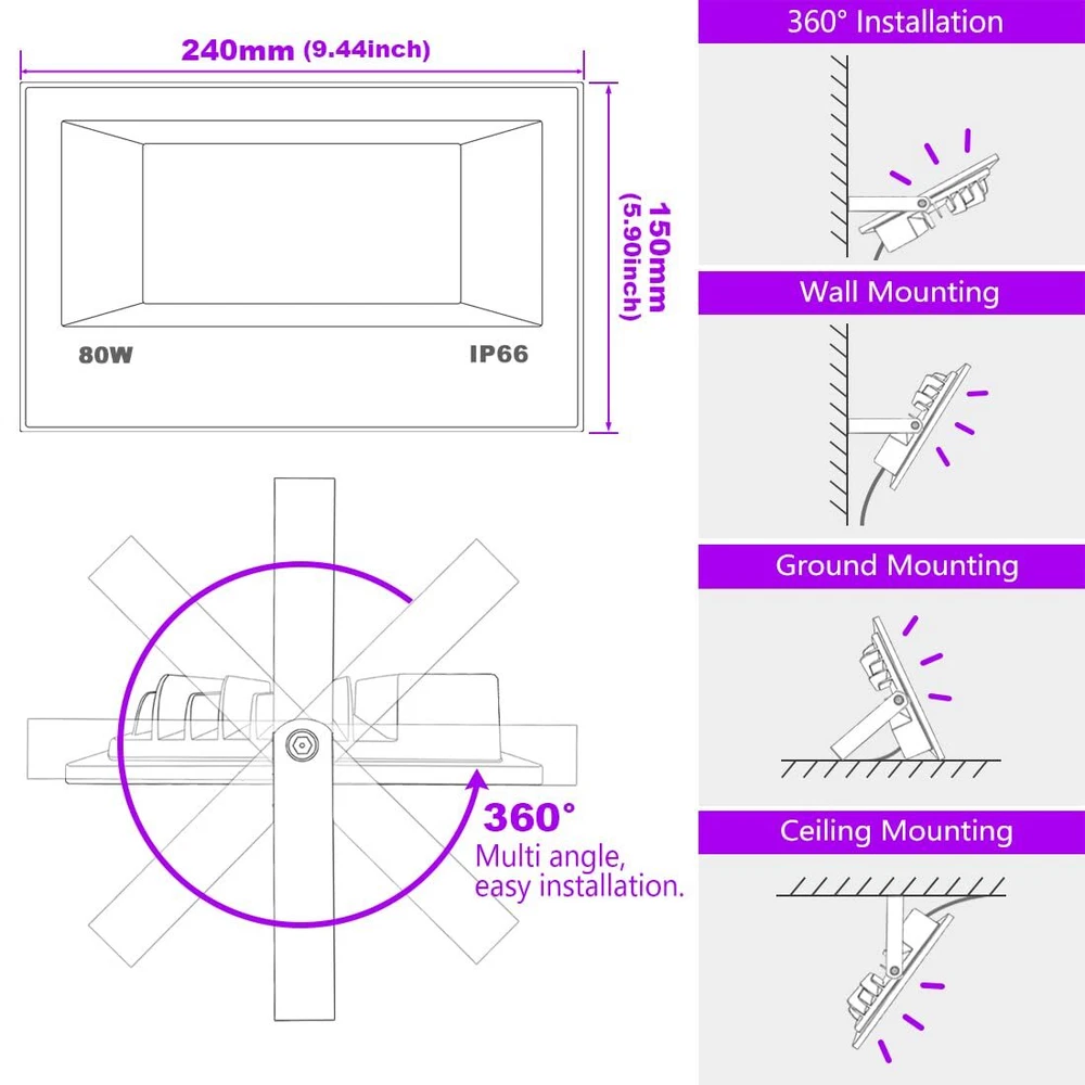 Note: LED Black Light The temperature of the case will rise accordingly after prolonged use (this is normal), please do not touch it directly with your hands. Specifications: Input: 85-265V Universal Power: 80W Wavelength: 390 -- 395 nm Beam Angle: 120° Wire Length: 1.8 Meters/5.9 ft Switch: Included Waterproof Rating: Yes, IP66 Waterproof (do not immerse it in water) Material: Aluminum + Tempered Glass Package Contents: LED Black Light x 2 User Manual x 2 【Powerful 80W Black Lights Outdoor】80W ,IP66, wavelength:390-395NM, US standard plug - 5.9Ft/1.8m cable (switch included). Combined with high power LED and special lens, the fluorescence effect is better. 【Black Lights for Glow Party Large Space】 Ideal for illuminating most reactive pigments, paints and dyes with black light. Especially with neon-colored objects, the blacklights work super cool for visible fluorescent materials. Perfect for Glow Party, Birthday Parties, Neon Party, Bars, Clubs, Painting, Stage Lighting, Aquarium, Gallery and Halloween Lighting. 【Mood Lighting and IP66 Waterproof 】The wavelength of 390-395nm does no harm to the human body, and the deep purple light it emits can be used for Atmosphere lighting, which is very suitable for haunted houses, Halloween decorations, etc. 【Curing effect 】Experiments have found that the blacklights has a surface curing effect on both curing glue and nail polish. When the light is 1-3cm away from the nail polish, it will cure within 2 seconds. When the light is 5-10cm away from the nail polish, it will cure within 5 seconds. 【 Metal Design and Efficient Cooling 】Special heat dissipation design on the back of the 80W black lights, With the qualified aluminum housing, it has a better heat dissipation performance which makes the light much more secure and durable. 【Aftersales Service】2-years-warranty. 90 days money back guarantee. High quality standard and friendly customer service. For any issues relating to the product, please do not hesitate to contact us.