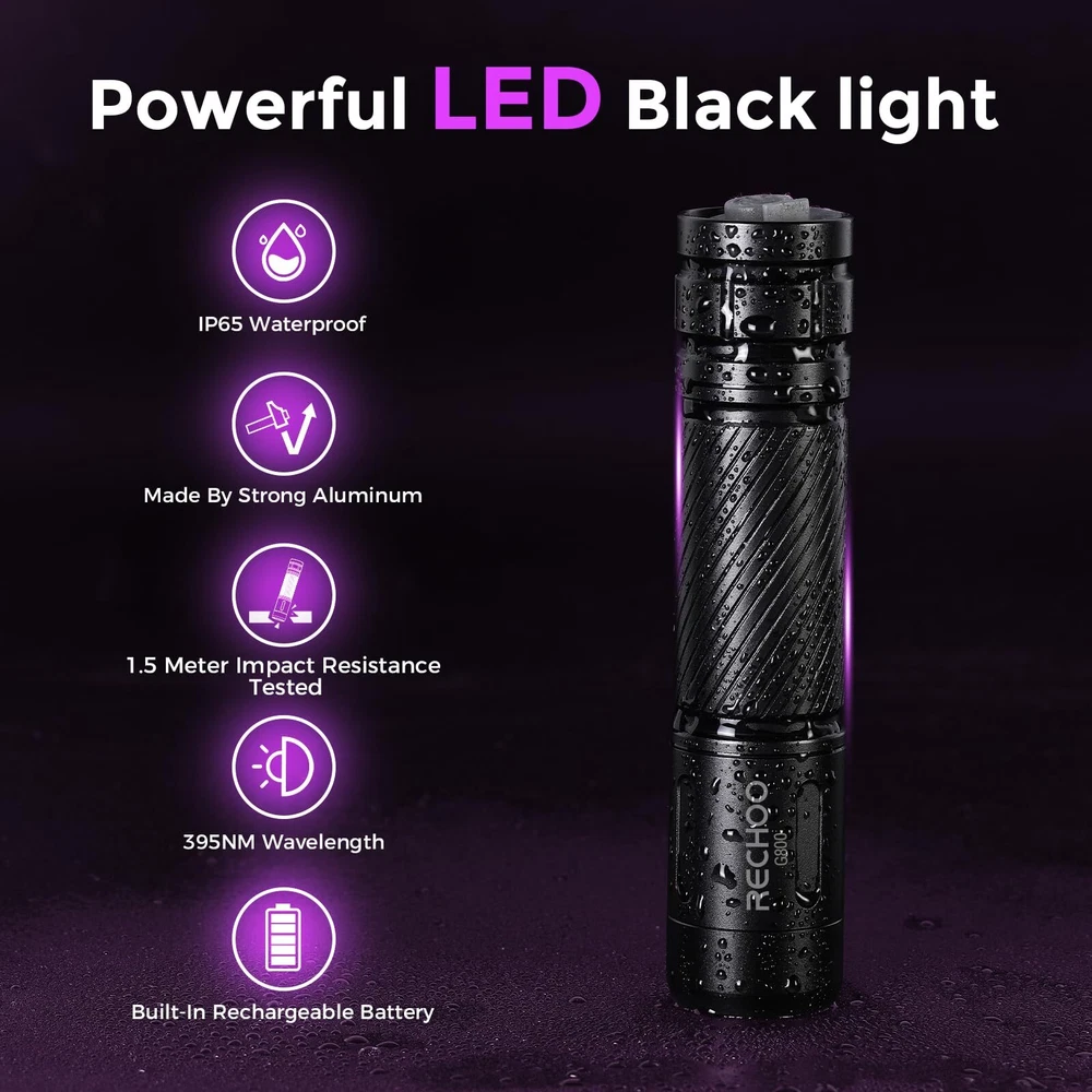 Discover Hidden Stains Effortlessly: The 395nm wavelength black light flashlight can help detect what the naked eye cannot see, like food stains, pet urine stains, and other invisible marks lurking on carpeting, bathrooms, furniture, or kitchen walls; This compact UV light is an indispensable, versatile tool in everyday life, ideal for detecting fluorescent substances and cleaning up pet accidents (effective for identifying dry urine spots only) Portable Blacklight Flashlights for Outdoor Use: This pocket-sized UV flashlight is easy to carry and perfect for detecting car stains, spotting hidden scorpions around your home, and locating tomato hornworms to protect your plants; It also reveals the fascinating glow of fluorescent materials, such as minerals, corals, and seashells(Dimensions: 4.52 inches x 0.98 inches; Weight: 0.2 lb) Type-C Rechargeable Flashlights with Smart Indicator: This rechargeable UV flashlight features a built-in TYPE-C charging port and overcharge protection for enhanced safety; The power indicator button glows red while charging and turns green when fully charged; Simply connect the flashlight to any USB power source using the included Type-C cable for quick recharging; Say goodbye to disposable batteries(Please cover the tail cap tightly after charging to prevent water ingress) Versatile UV light for Multiple Purposes: Whether for home cleaning, outdoor adventures, or daily detection, this black light is your ideal assistant; You can use these UV flashlight to verify currency and official documents like driver's licenses, Check the cleanliness of your room, hotel linens, and pillows, detect unwanted whitening agents in cosmetics, cure UV resins, collect uranium and fluorescent minerals to admire their true allure and check for bed bugs, among other things Reliable After-Sales Support: stands behind its products with excellent after-sales service, providing prompt responses to any queries or issues you may have with these UV flashlights