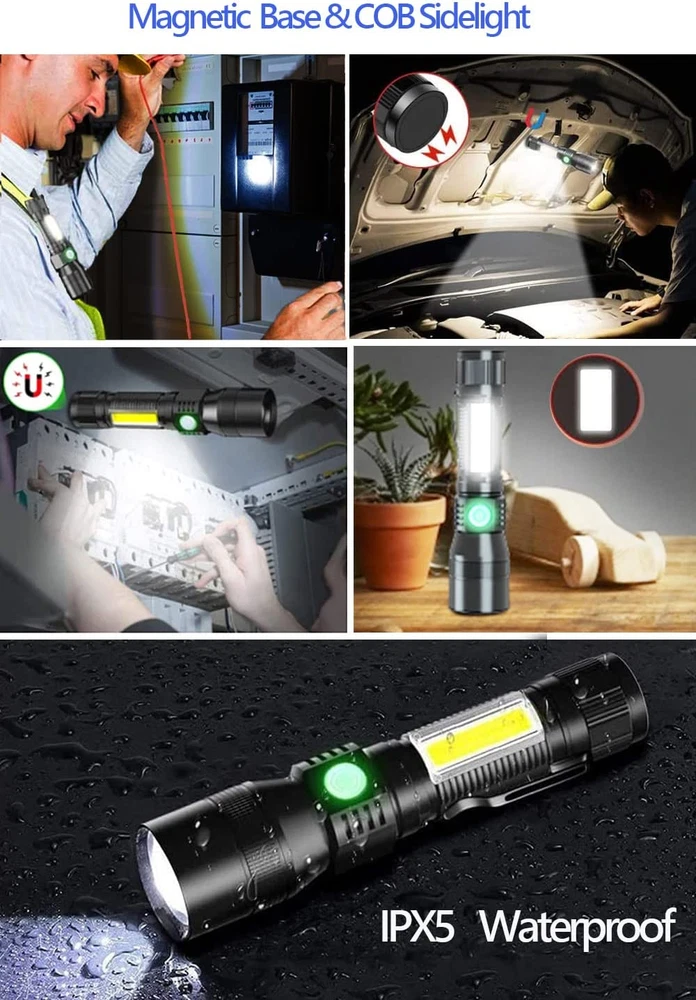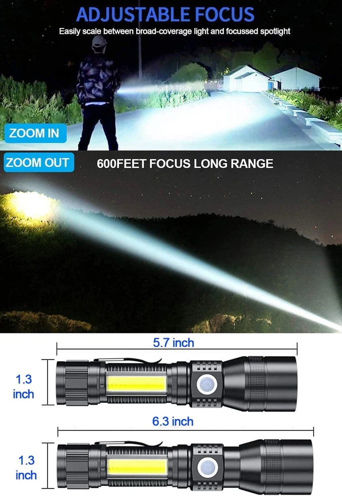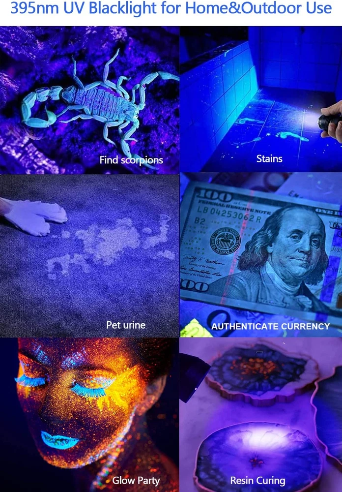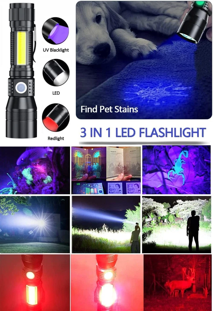 Super Bright LED Flashlight, 7modes, One key Turn Off ------ High Lumen LED Flashlight delivering a outstanding 2000-Lumen and up to 600feet Strong Illumination; This LED tactical flashlight can be turned off at any of 7modes via long press the button 2S, no need cycle through all 7 modes: high/low /strobe/UV blacklight/COB white/COB red/COB Flash light. 395nm UV Flashlight ------Flashlight is a combination of white, red and purple light.Black light Flashlight, provide professional 395nm wavelength UV light can be perfectly used as pet urine stains Detection, UV Cure light, kitchen floor carpet bathroom stains; black light detector authenticate currency, driver license, passports; this ultraviolet flashlight also do a great job in scorpions detecting during your camping night. Best LED blue light flashlight choice as a mutimode flashlight. USB Rechargeable Flashlight, Long Lasting----- Tactical Flashlight rechargeable,USB cable included, This Rechargeable UV Flashlight only need 3hours to get full charged and reach up to 10hours (Low mode) working time. the flashlight all designed with overcharge protection function, which mean this rechargeable flashlight will stop charging when it fully charged. No worry about safety issue. Magnetic Flashlight, COB work flashlight, Hand free ------ LED Flashlight magnetic, Features a strong magnetic base in this blacklight flashlight bottom ensure you can attach this Rechargeable flashlight to metal surfaces for hands-free use; Magnetic COB work flashlight with black light, red light and white light , Best combination as a tactical flashlight. Zoomable, Waterproof, Practical ------ This UV Flashlight design with adjustable focus, Fully zoomable from Floodlight to Spotlight; IPX6 Waterproof and Sturdy whole aluminum body ensure this black LED flashlight can be used in bad weather environments; 5inch in length and 4.3onces in weight, UV black flashlight with pocket clips, this small rechargeable flashlight is lightweight and compact as a camping flashlight or a EDC flashlight. Product Description Why Choose Hoxida UV Rechargeable Flashlight : 1. 3in1 flashlight : Compared to most flashlight, Hoxida flashlight combine 3 color lighting in one flashlight, White/UV/Red. you can pay one flashlight money to get three flash lights.******395NM UV lights/Black light used for easier spot carpet pet urine stains, find fluorescent in baby clothes, authenticate currency, driver license, passports. ******White Bright Light for daily and work purposes *****flashlight with red light make this tactical flashlight is great for Camping, Emergency and outdoor use. 2. magnetic flashlight &COB sidelight :LED Flashlight, has Strong magnet at the bottom on this black led flahlight and combine a COB sidelight , let your hands totally,perfect LED Tactical Flashlight. 3. USB Rechargeable :a usb cable included, you could charge this rechargeable flashlight via any USB device 4. 7 Lighting Modes &Zoomable :flash lights, 7 lighting modes: high / low / strobe / UV light / COB white light / COB red light / COB side strobe light mode, easily ajust focus by stretching flashlight body get wide to narrow beam . 5. Waterproof : IPX6 waterproof ensure its safety when you use this waterproof flashlight in rainy day 6. Lightweight and compact :Rechargeable flashlight pocket size, only 4.59inch in length and 4.3once in weight, easily put in your pocket ,or wear it on your belt(with a pocket clip),a wonderful EDC flashlight. 7. One-Step directly off function : led flashlight, One-Step directly turn off by long press for 2 secs, no need to cycle all mode 8. Super bright and long burn time: High grade LED provide 2000lm and 8hours constant lighting in low brightness mode. 3in1 LED Flashlight Hoxida flashlight combine 3 color lighting in one flashlight; 395NM UV Black light /White Bright Light for daily and work purposes /flashlight with red light make this tactical flashlight is great for Camping, Emergency and outdoor use. USB Rechargeable * 10hours long standby * USB Cable included, this rechargeable flashlight is charged via any USB port ,3 hours fast charging * Charging indicate light , red is mean in charging , and green is mean full charging. Small LED Flashlight Small LED Flashlight, Only 5.5"in length and 5onces in weight .With belt-clip, easily put in pocket, perfect Flashlight for camping, walking dogs, daily and emergency use COB Sidelight COB sidelight provide a larger illumination for more lighting needs . can be a powerful lighting for Power outage, also can be a work flashlight for large area lighting at night repairing, also can be a desklamp for reading. Flashlight with Magnetic base led Magnetic Flashlight, has Strong magnet at the bottom and combine a COB sidelight ,really a smart operation when you want fix some stuff at night or outside camping, let your hands totally,perfect LED Tactical Flashlight. IPX6 Waterproof Waterproof flashlight, design for rainy day, you could you could use it in rainy day . Zoomable Flashlight-Adjustable Focus Zoomable Flashlight, simple stretching lamp head to adjust the focusing light And floodlights,meet your various lighting needs Package included 2pcs Rechargeable LED Flashlights 2pcs Micro USB charging cables 1pcs user manual Specification Product name :UV rechargeable flashlight Material: High-Strength Anodized Aluminum Alloy 2. Light Source :1* High Light LED/ 1* Blacklight LED 3. Brightness: 2000 Lumens 4. LED Lifespan: 100,000 hours 5. 7 Modes: Full, Low, Strobe, UV, White COB, Red COB,RED White SOS Mode 6. Size: Length 5.5 inch 7. Zoomable(Telescopic zoom in and out