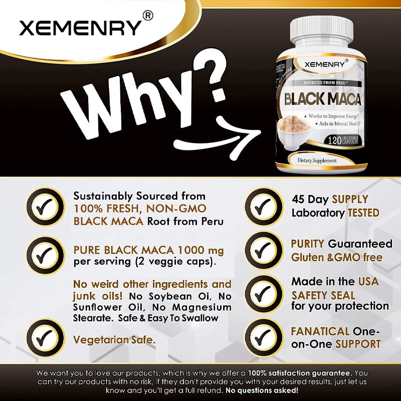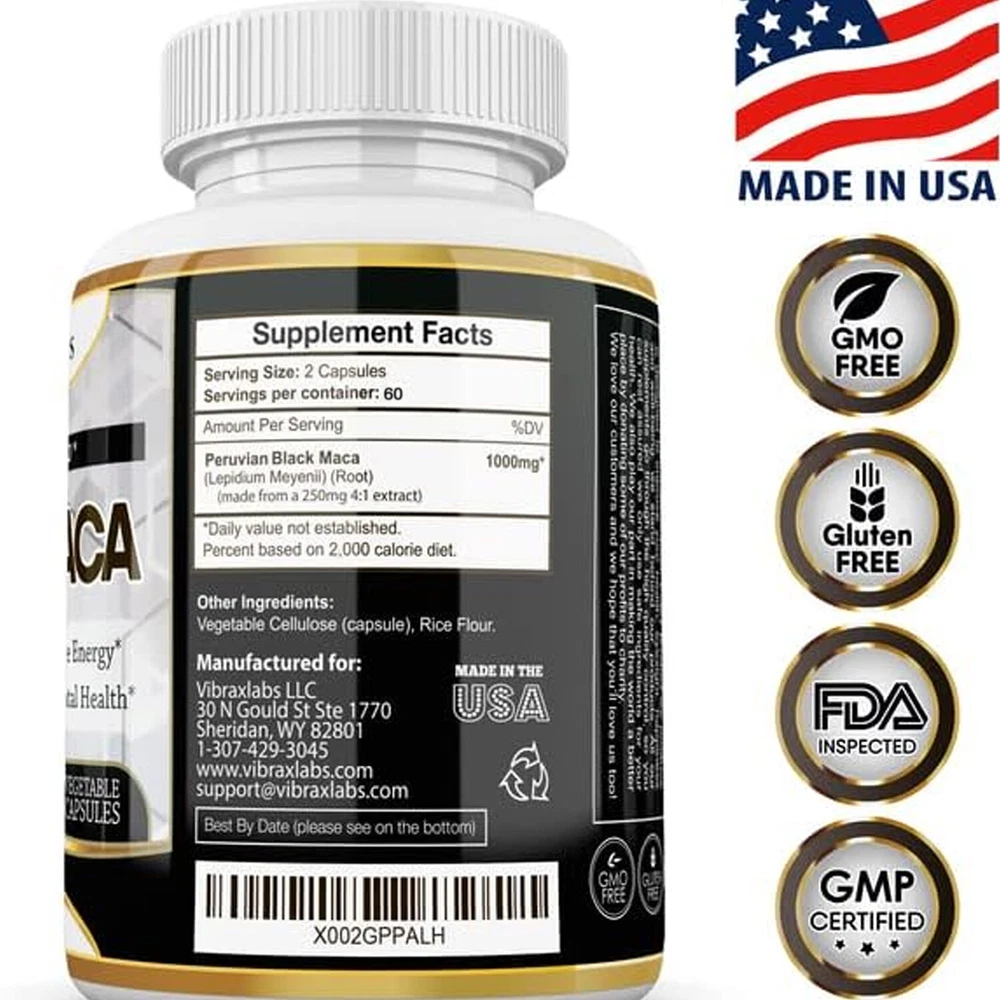 Effects: Men's Health, Energy & Endurance Ingredients: Peruvian Black Maca Directions: Take 1-2 capsules twice a day after meals. Shipping: Ships within 48 hours on working days. Shelf life: 2 years Description: Black Maca is endemic to central Peru. It is said that Inca warriors consumed the root of this plant to increase energy and strength. Black Maca root balances hormone levels in both men and women, improving their performance, mood and endurance, and providing the extra energy needed during action. Black Maca capsules are perfect for both men and women, and just one capsule before training can give you all the energy you need! Black Maca is also a nootropic extract that can improve brain performance. Our Black Maca root capsules may help improve mental focus, memory function, and brain clarity. Additionally, Black Maca capsules can promote feelings of well-being and a good mood. Document