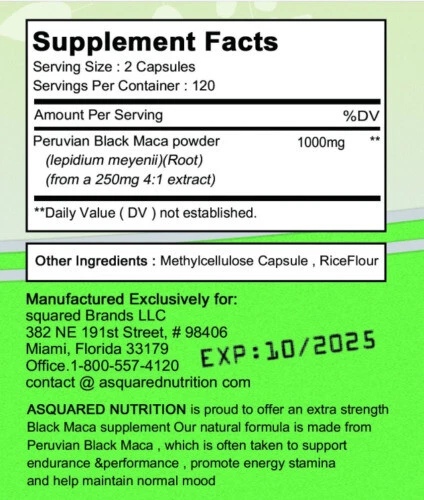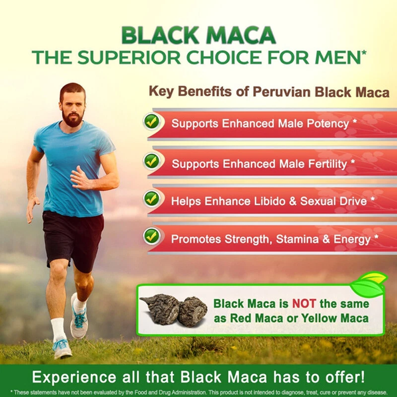 Effects: Energy & Endurance, Men's Health, Testosterone Booster Ingredients: Peruvian Black Maca Directions: Take 2 capsules once daily after a meal. Shipping: Ships within 48 hours on working days. Shelf life: 2 years Description: PREMIUM PERUVIAN BLACK MACA: Made with the highest quality pure organic, sustainably sourced Peruvian Maca root, these Black Maca root capsules are nutritionally concentrated and cleanly formulated to ensure efficient, safe use with dramatic results! [Energy and Performance Support] Maca root for men and women has amazing energy-boosting properties and rich amino acids, vitamins, and minerals, which helps increase endurance, support muscle growth and recovery, and reduce fatigue. It is a must-have for athletes or fitness enthusiasts. Great workout supplement. BRAIN & MOOD SUPPORT: Nature's Own Black Maca Root pills not only help improve physical performance and strength, they also help support brain function. It is a great enhancer of optimal cognitive function as it helps increase mental clarity and focus, improves mood and memory, and promotes hormonal balance. Document