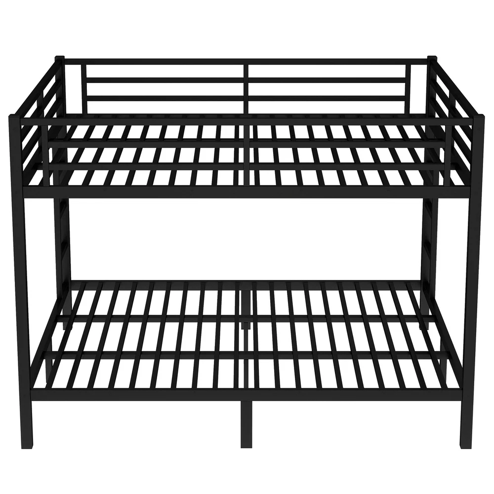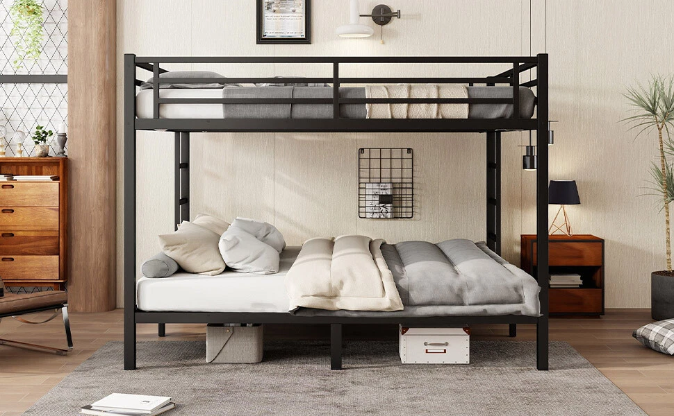 Metal California King Over California King Bunk Bed for Teens and Adults Black Features Solid construction: Made by strong and heavy duty metal provides durability and strong structure make the bunk bed more stable. The bunk bed adopts durable electrostatic powder coating, environmental protection, non-toxic and pollution-free, not easy to fade,the use cycle is long,and easy to clean. Under Bed Storage: Under bed storage can also help you utilize space more efficiently and make the whole room more tidy. 2 Side Ladder: Both sides of the bunk bed with ladder for easy climb up, also making it easy to customize to your room's layout and your personal preferences. Safety Design: Our bunk beds have 40 metal slats for great support. The lower bed has thickened legs for reinforcement. Guard rails around the upper bed increase safety and prevent accidents. Description Description Feature upper bed is Queen size and bottom bed is Queen size. The metal bunk bed constructed with a sturdy quality and thicker steel frame that for stability and durability, make the bunk bed not wobbling and allowing users to sleep soundly. Description & Dimensions Type Metal Bunk Bed Size California king over California king Overall Product Dimension 87.4''L*75.2''W*63.7''H Overall Product Weight 130.07LBS Weight Capacity Minimum weight capacity of 600 lbs. for bunk beds Recommended Mattress Thickness 6'' for upper bed, 8'' for bottom bed