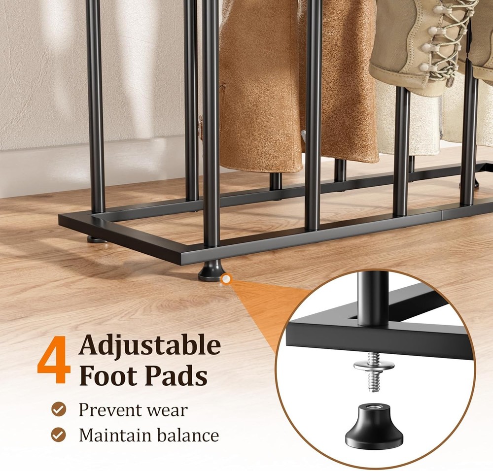 Absolutely love this boot rack! It keeps all my tall and mid-calf boots neatly organized and prevents them from getting creased—no more tangled piles. The adjustable feet make it super stable on any floor, and it saves so much space in my closet. Perfect for keeping my favorite boots in great shape!