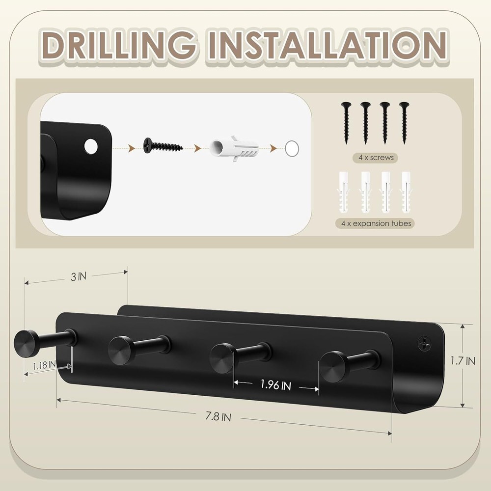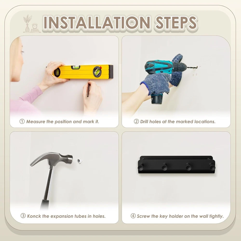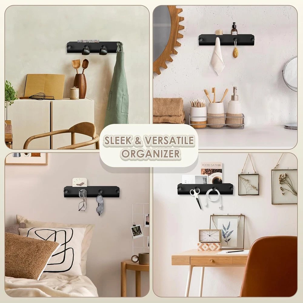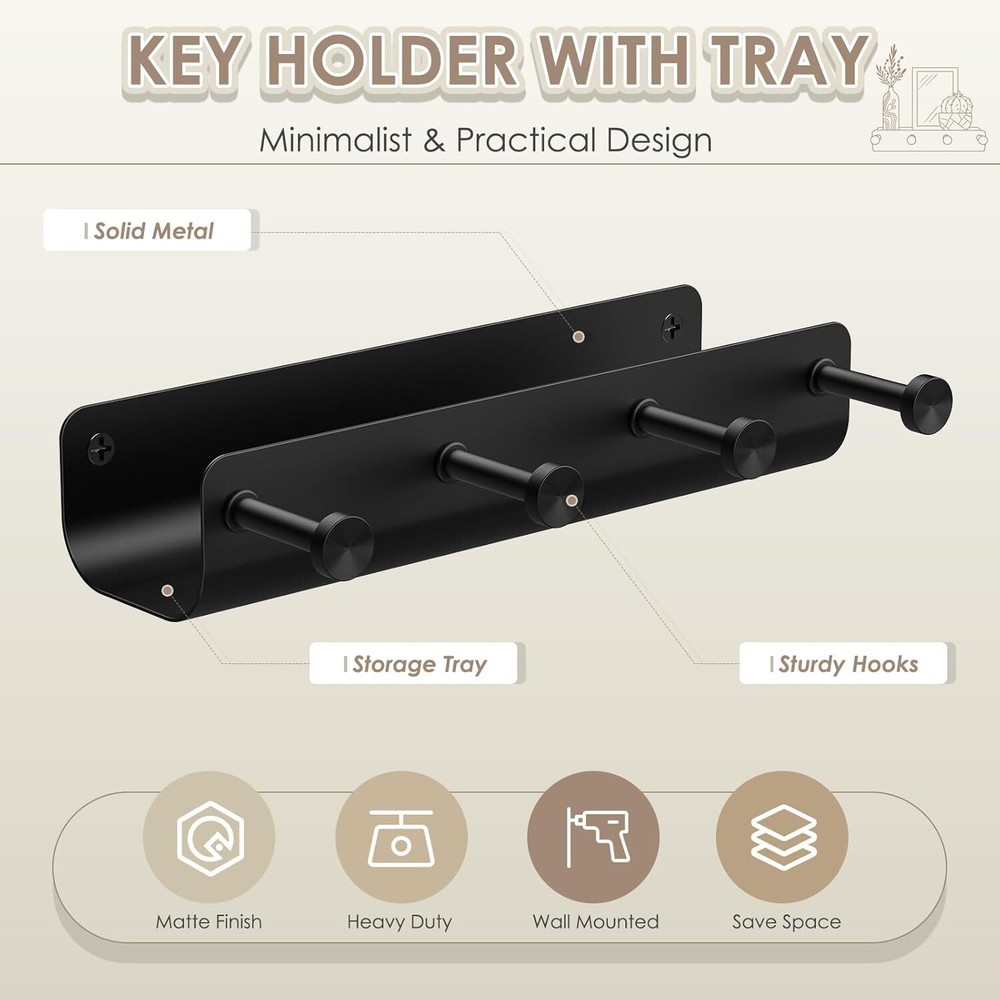 Key Holder Wall Mount, Black Metal Rack with Tray Narrow Small, Product Details Color: Black Brand: MEILIDY Material: Metal Finish Type: Matte Mounting Type: Wall Mount Style: Stylish Weight Limit: 20 Pounds Special Feature: Easy to Install, Space Saving, Lightweight, Heavy Duty, Rust Resistant Recommended Uses For Product: Camper, Foyers, Garage, RV, Kitchen, Cabinet, Closet, Front Door, Mudroom, Laundry, Trailer Shape: Rectangular Theme: Modern, Minimalist Included Components: 1* Small Key Holder, 2* Mounting Hardware Item dimensions L x W x H: 7.8 x 3 x 1.77 inches Number of Hooks: 4 Surface Recommendation: Wall; Door; Wood Maximum Weight Recommendation: 20 Pounds Manufacturer: MEILIDY Part Number: LH004BKHUS Item Weight: 9.6 ounces Product Dimensions: 7.8 x 3 x 1.77 inches Item model number: LH004BKHUS Size: Small Finish: Matte Item Package Quantity: 1 Maximum Weight Capacity: 20 Pounds Special Features: Easy to Install, Space Saving, Lightweight, Heavy Duty, Rust Resistant Batteries Included?: No Batteries Required?: No Color: Black Brand: MEILIDY Material: Metal Finish Type: Matte Mounting Type: Wall Mount Well Built: Wall mount key holder is made of solid metal material, lightweight, sturdy construction; surface nice matte finish withstand wear and tear, ensures long-lasting use; compact sleek black look adds a elegance touch and matches well with any decor Minimalistic but Functional: Clean design with a narrow metal shelf and 4 long key hooks; the narrow tray is a bonus, provides a designated home for miscellaneous items, deep enough to accomodate small items without dropping out; the hooks are durable and well spaced, can holds multiple sets of keys, have a little knob to keep from falling off; small organization tool but really makes a difference Space Saver: Nice size for a small narrow spot, slim enough without bumping into it; keeps all stuff being together in one place, within easy reach and keeps clutter off the counter; easy to hang and grab as heading out the door, gets in the habit of dropping items off in an organized way Simple Installation: Easy to assemble with the included 2 sets of mounting hardware; just mark the positions of holes, level it on the wall, insert the anchors into the holes, twist the screws and hang up the key hanger to finish the installation; everything in its place, hold up well with quite a bit of weight on it Functional Organizer: Metal key rack serves multiple purposes, organize keys, badges, leashes, hats, bags, mails, receipts, bills, wallets, purses, glasses, knickknacks, small potted and other essentials; mount in the foyer, kitchen, bathroom, mudroom, garage, office, dormitory, camper, rv, trailer; such a stylish and functional addition to any home
