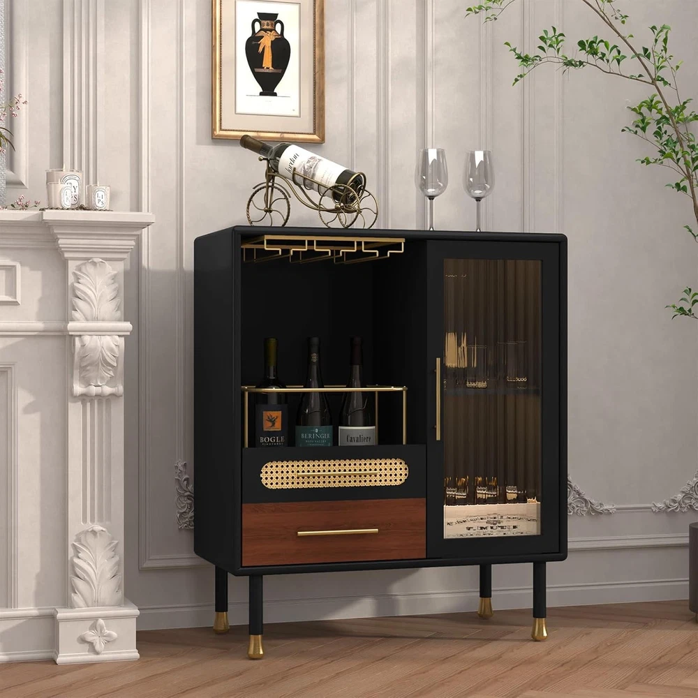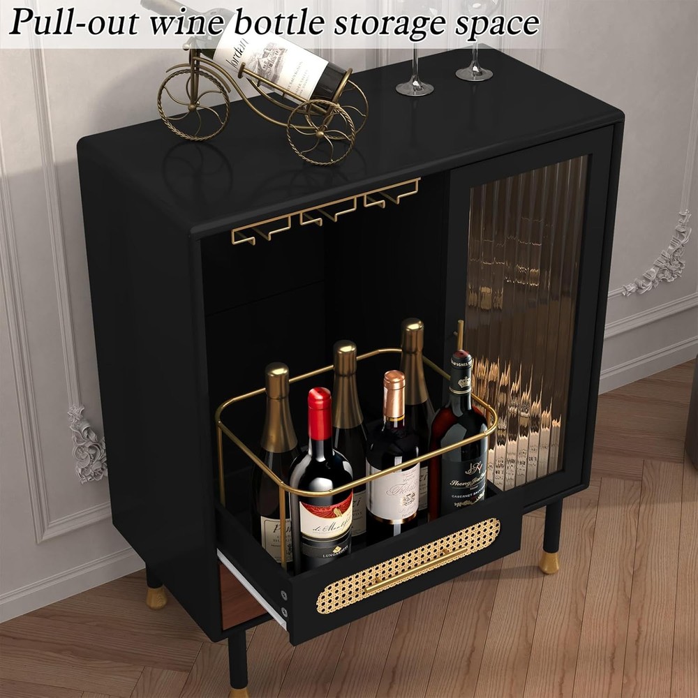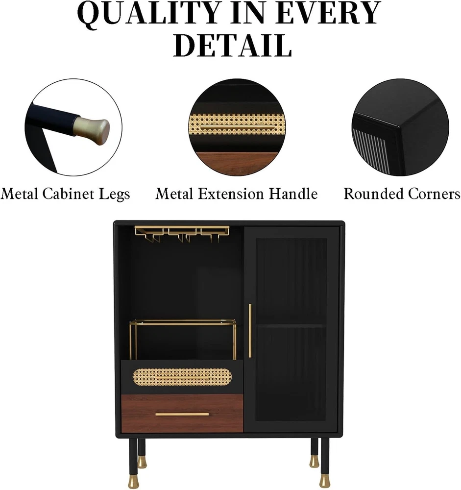 Product Description About this item 【Partitioned Storage】: The wine bar cabinet has ample internal storage space with 3 integrated stemware racks. The pull-out wine bottle storage space is convenient and quick(the drawers are smooth gliding). The bottom drawers can store bar tools, and independent cabinets with removable shelves can freely customize the space according to the size of the items. 【High-quality Materials】: This coffee bar cabinet is made of high-quality MDF, paired with tempered glass cabinet doors, and supported by 4 sturdy metal legs for long-term use. Environmentally friendly lead-free paint is safe and healthy. Just wipe it with a damp cloth in daily life. 【Exquisite and stylish design】: This liquor buffet cabinet is available in two finishes. Gold accessories embellish the stylish green and classic black, creating a timeless modern look. It is perfect for adding a touch of elegance to your dining room, living room, or kitchen. 【Space-saving design】: This compact bar cabinet with storage measures 37 inches x 14.96 inches x 31.49 inches, suitable for placement in any room without taking up space. It is a stylish and practical solution for storing beverages, glassware, and bar necessities. 【Easy to Assemble】: Designed with user-friendly assembly in mind, this buffet storage cabinet comes with clear instructions and all necessary hardware. Each component is labeled for easy identification, simplifying the assembly process. You'll have your home bar installed in no time. Modern Coffee Bar Cabinet Liquor Buffet Cabinet Pull-out Wine Bottle Storage 3 Rows Wine Glass Holders Smooth Waterproof Tabletop Sturdy Metal Legs