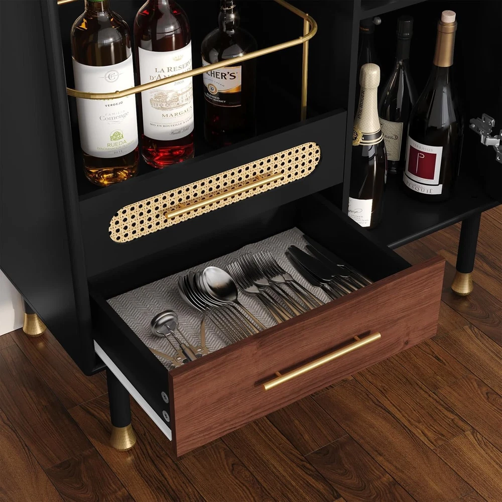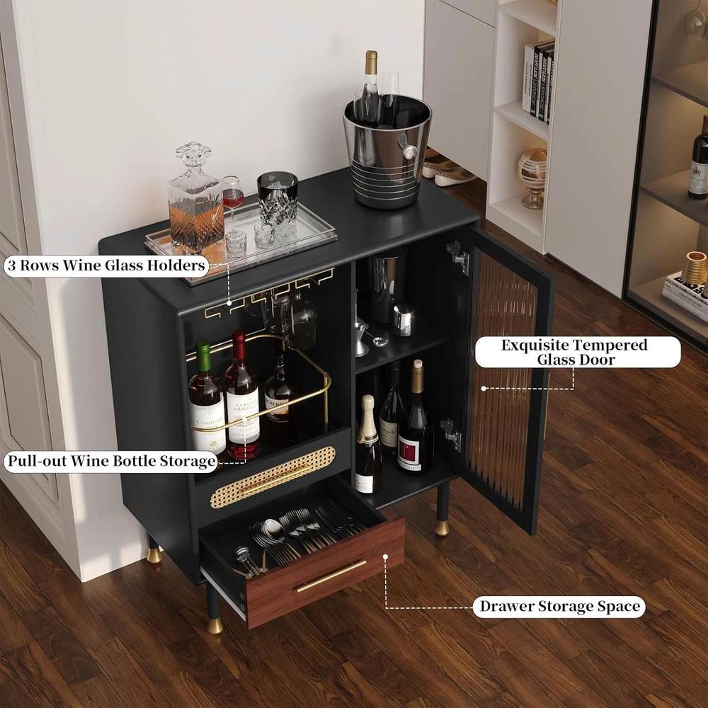 This coffee bar cabinet is a game-changer for any home! The sleek black design looks modern and stylish, while the partitioned storage keeps everything organized—love the stemware racks and smooth-gliding drawers. The tempered glass doors add a classy touch, and the adjustable shelves make it super versatile. Perfect for storing wine, bar tools, or even coffee essentials. Sturdy, functional, and great value—highly recommend!