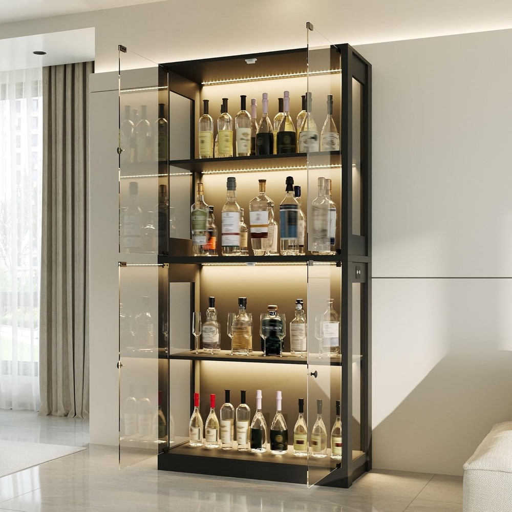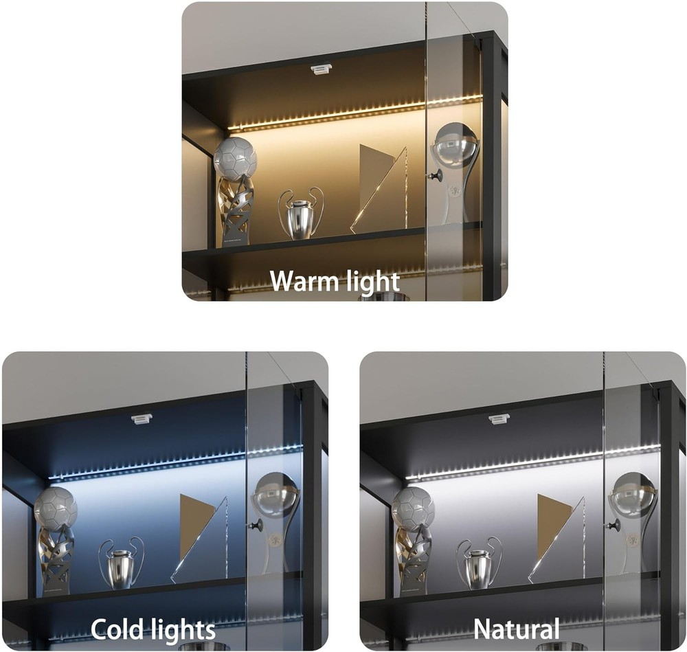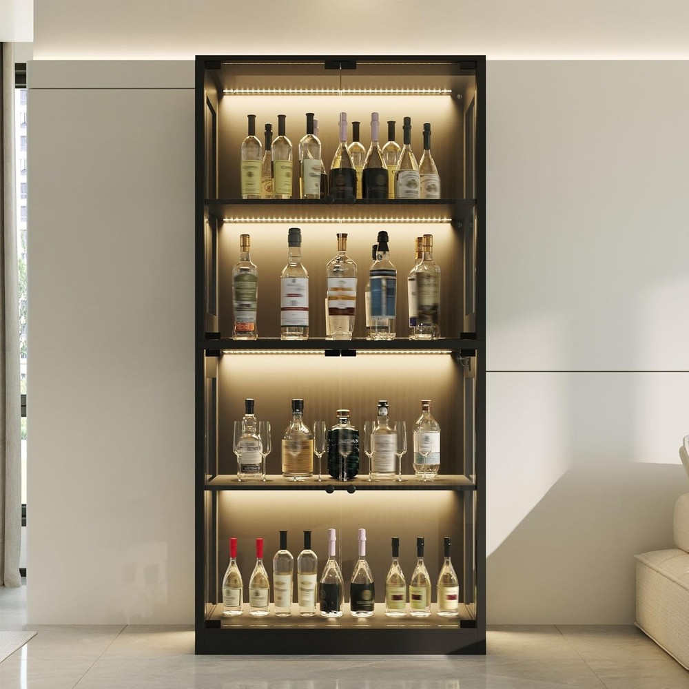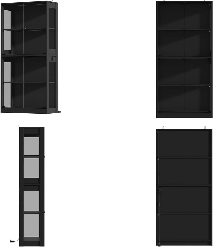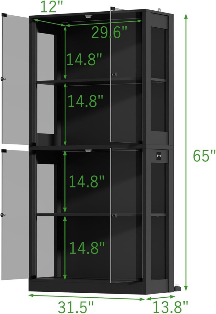 Product Description About this item Display Cabinet with Lights: This display cabinet features a tall vertical structure. It has an all-black frame paired with transparent glass doors, being simple and modern. Built-in layered shelves allow for orderly display. The 3-color light strips can better showcase the collections, adding a touch of life taste and a sense of ritual Large Capacity: The overall dimensions of this wine cabinet are 13.8"D x 31.5"W x 65"H, with an ingenious space layout. It has 4 storage compartments, each with a height of 14.8 inches. The layered design allows different wines to be neatly displayed, providing an exquisite storage environment for the wines Sturdy Construction: This black cabinet with storage boasts excellent materials. It uses P2 Grade PB for the main structure. The tempered glass doors are durable and transparent. With a magnetic suction door device for easy opening/closing and an anti-tipping kit for safety, it’s both practical and secure Multiple Scenarios: This lighted glass cabinet is suitable for use as a wine cabinet in the living room to display whiskies, red wines, etc., creating a wine-tasting atmosphere. It can also serve as a display cabinet to showcase collections, figurines in the study, or present artworks in the exhibition hall Easy to Assemble: The package includes detailed instructions and all necessary parts. Each component is clearly labeled, making the assembly process straightforward and quick. If you have any questions, feel free to contact us at any time Display Cabinet Practical, Modern, Sturdy It's a 2-in-1 wine cabinet and display cabinet! With layered lighting, it easily fits in living room and study scenarios. Specifications: Material: P2 Grade PB Color: Black Overall Dimensions: 13.8"D x 31.5"W x 65"H Glass Doors Light Switch Magnetic Design Anti-tipping Kit Storage Cabinet Color Black Overall Dimensions 13.8"D x 31.5"W x 65"H Material P2 Grade PB Package Includes 1 x Storage Cabinet, 1 x Instruction On Aug 15, 2025 at 01:11:23 PDT, seller added the following information: