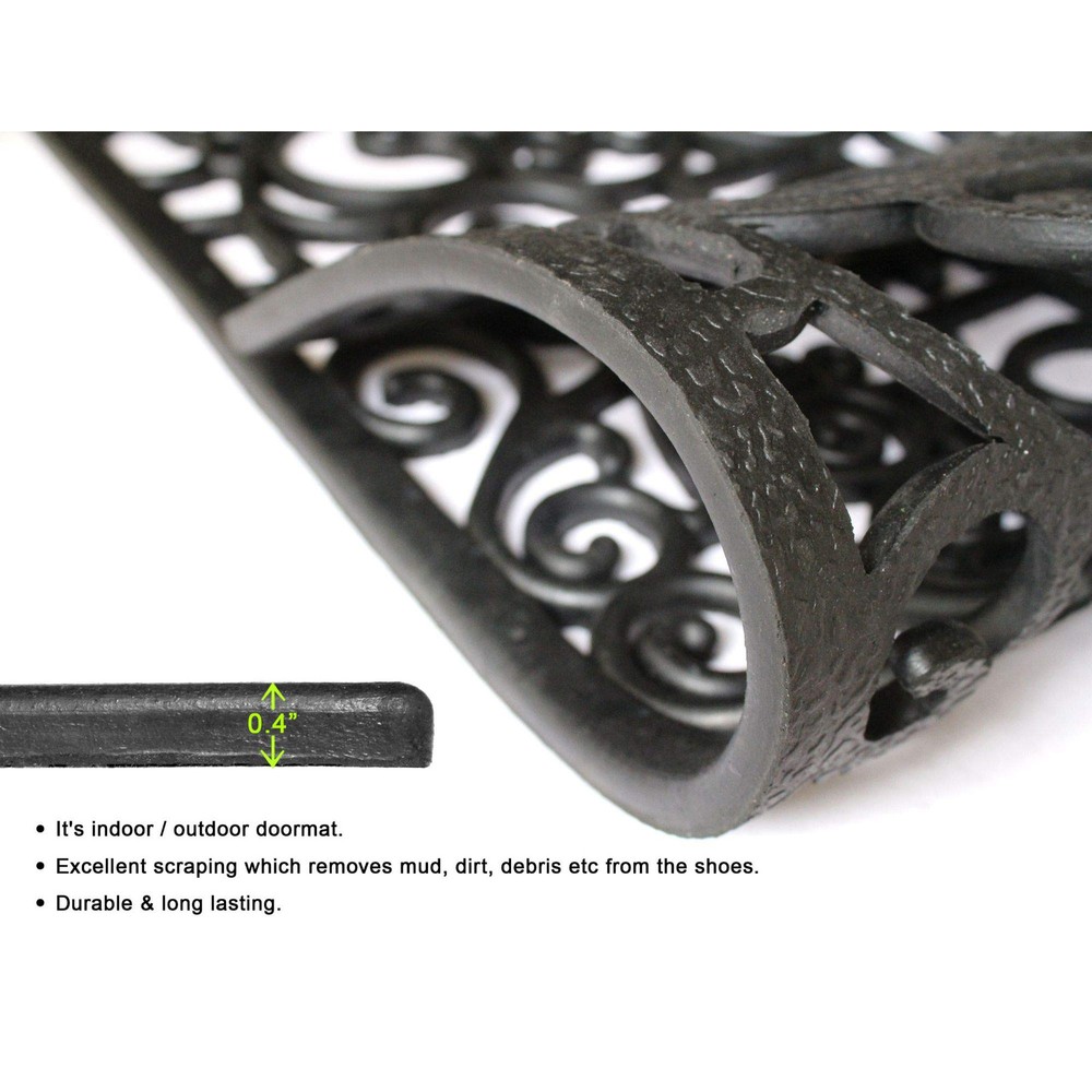 Elegant recycled rubber doormat with an intricate design. Simply rinse or wipe this doormat for easy cleaning. Recycled rubber decorative doormats feature anti-slip protection for slippery areas and doorways. Rubber doormat. To clean simply sweep or shake. Made in India. Recommended for Indoor or Outdoor Use Under Shade Sweep or Shake Clean Year round doormat Perfect for all entryways EASY CARE MAINTENANCE - Easy to clean, non shedding rug. Recommend regular vacuuming; shake or spot clean as needed. For hard to remove stains, professional rug cleaning is recommended. Non-Skid Backing