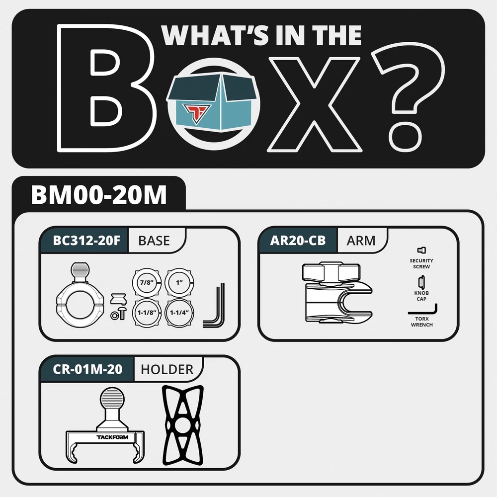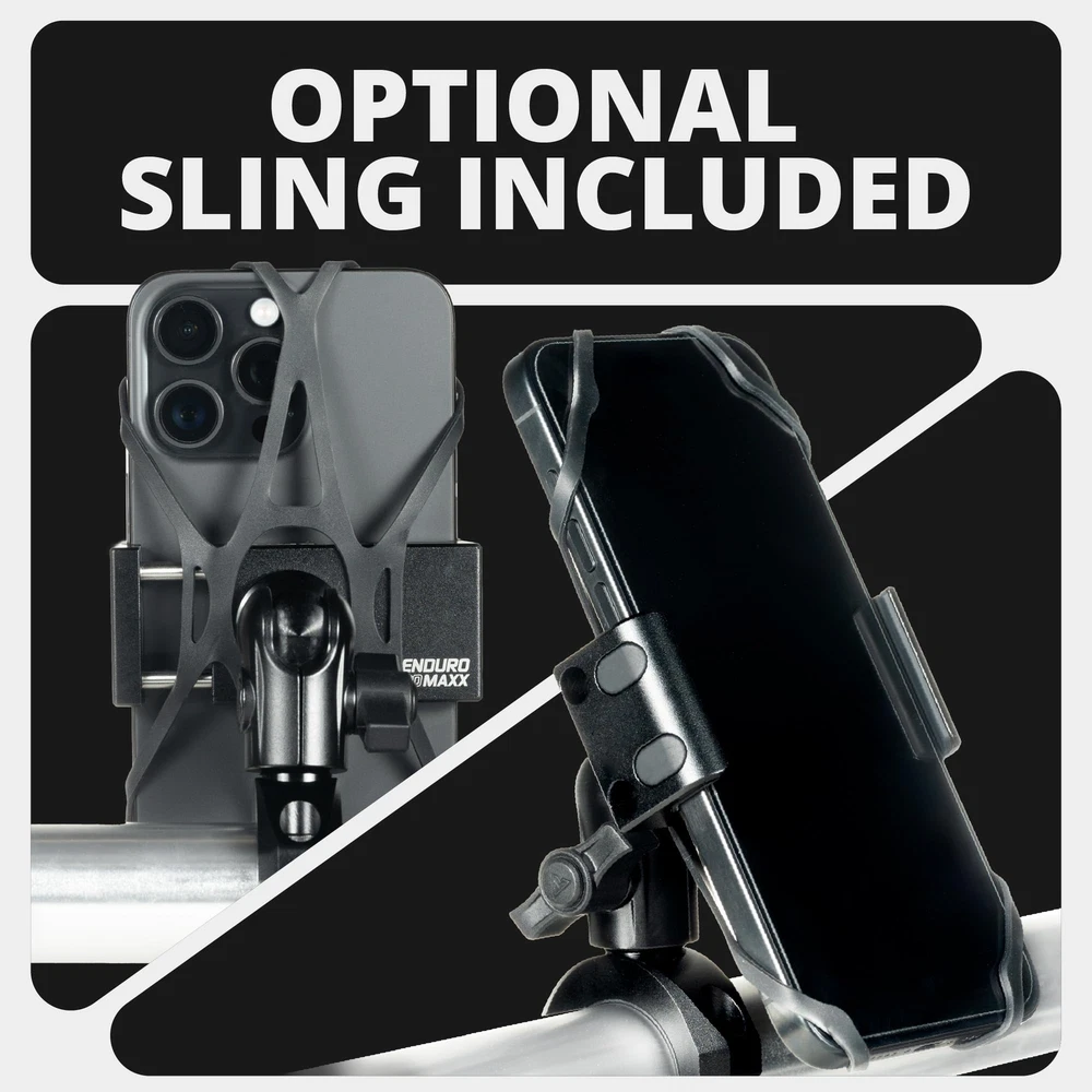 FITS A VARIETY OF BAR SIZES: The included bar clamp works with 7/8", 1", 1-1/8" and 1-1/4" handlebars (bushings are included). These sizes correspond to the most common round stock bars on the market. UNIVERSAL PHONE COMPATIBILITY: Our phone holder is designed to seamlessly work with nearly all smartphone models, cases, and sizes. While you're on the go, it ensures a secure fit for any device, whether or not it's in a case. Capable of securely holding devices up to 3.7" wide and 0.6" thick. Please check your device for proper fitment. INNOVATIVE CRADLE DESIGN: Experience the difference with our specially designed cradle. Unlike standard spring cradles, our octagon-shaped grips minimize heat transfer by pulling the phone away from the cradle's back on hot days. The spring mechanism is perfectly calibrated, allowing for effortless single-handed insertion & removal of mobile device without straining the mount base. CLIP-IN GRIPS: Traditionally, our previous generation phone cradle utilized double-sided 3M tape to secure the grips onto the cradle, a method commonly employed by other brands with similar-looking holders. However, in high temperatures, the double-sided tape could loosen, causing the grips to peel away. Our Clip-In Grips address this issue. CRADLE PIN SLEEVES ELIMINATE CRADLE BUZZ: Cradle buzz is a common issue in many of our competitors' current products. These metal cradles feature steel pins that run through them to support internal compression springs. However, the metal-on-metal contact, combined with vibrations from vehicles or motorcycles, can result in an irritating buzzing sound. We've eliminated this problem in our Enduro cradles by 'sleeving' the pins, ensuring quiet operation. PREMIUM MATERIALS: Real CNC Machined Black Anodized Aluminum. Glass Filled Resin Knob Molded over Stainless steel threaded inserts. Stainless Steel and Aluminum Internal supports. OPTIONAL ANTI-THEFT KNOB: (Patent Pending) This arm, although not always necessary, has optional anti-theft features. This can (A) help prevent snatch and grab situations on your motorcycle, SXS, or other similar environments. (B) The ball cannot slip from the socket if properly tightened. COLOR SWAP COMPATIBLE: offers a wide range of anodized billet aluminum knobs. This DuraLock arm is compatible with 's DuraLock knobs, allowing you to customize your setup to match your vehicle. Black knob included. 20 SERIES: Specifically designed for compatibility with ’s 20 Series Platform, revolving around the 20mm ball and socket system. While compatible with other 20mm products, our parts stand out for their tested durability and engineered load capacities, featuring a safety factor not guaranteed by other manufacturers. Please Note: Not suitable for 25.4mm / 1” / B-Sized balls. AMERICAN ROOTS, GLOBAL REACH: Proudly American-owned and operated, is based in Addison, IL, where we oversee design, engineering, customer support, quality control, testing, marketing, and distribution. While we manufacture globally, the core of our operations remains in the USA.