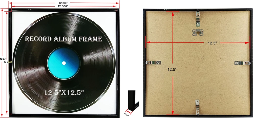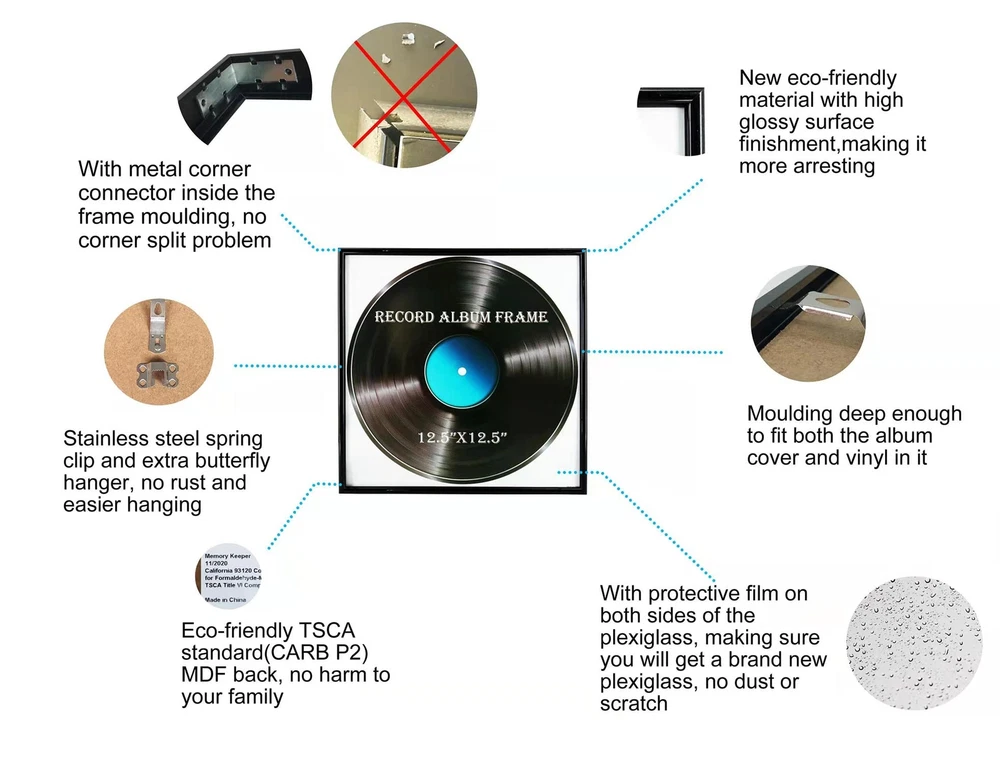 1 Professional Framers,Professional Accessories for photo frame.We making photo frames for big distributors in the USA more than 10 years, Our frame is true size and great quality 2 No matter whether the glass is broken or not, we provide return and exchange service. 3 Each frame in the box has been inspected and is intact. We use the special protective packaging for the frame, but during transportation, some packages will fall and impact, and the glass will be crushed by the extrusion of the photo frame strip, so the glass is broken and the box is still intact. 4 Please assured to choose this record frame feel free. In case of glass breakage, please return and exchange the frames. Exact Size: This frame can fits Record Album up to 12.5" x 12.5". Excellent for vinyl LP covers display, Fit the album artwork display Hight light lustre, Classic Design: The frame moulding is with high light piano-finish foil. It will make displaying your favorite Record Album looking amazing in any room. The classic high light piano-finish black design will fit perfectly in any room decor. Superior Protection: This frame was designed to provide your Record Album with a superior protection. Our frames are connected by sturdy reinforced metal connectors at the corner. A 2.5mm backer and Thick transparent polycarbonate glass provide superior protection of your Record Album.And Eco-friendly 2.5mm thicker TSCA (CARB P2) standard MDF back is no harm to your body Easy To Use: This frame features easy-to-turn tabs on the back to make inserting your Record Album a breeze. In addition, hanging hardware is included at the back. Great Gift: Perfect as a Gift for Musicans and Music Lovers, Lightweight and easy to hang