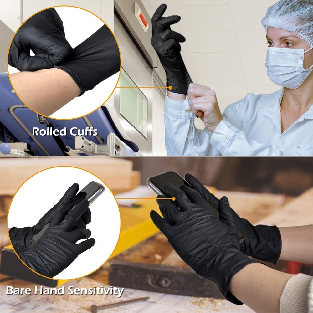 Chemical and puncture-resistant nitrile gloves offer superior protection against liquids, gases, and sharp objects. The textured finish ensures a secure grip in wet or dry conditions. Each glove has a beaded cuff Borje nitrile gloves are suitable for those who are sensitive to natural rubber latex and wearing powder Stay clean and protected when dealing with messy foods with these food-safe prep gloves Commonly used in industries such as janitorial, food service, and labs, as well as by law enforcement, tattoo artists, physicians, and first responders Black nitrile gloves are ambidextrous and disposable, designed for single use. They come in a convenient dispenser box containing 100 gloves by weight