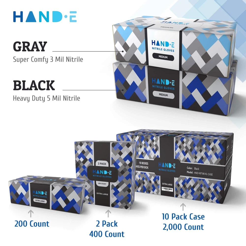At last, an industrial strength glove that looks classy enough for your home! Hand-E’s beautiful design and packaging stands out from the rest, and the quality of the gloves can’t be beat. Experience the today! Product Specifications - Nitrile - Latex Free - Powder Free - 100 or 200 Per Box - Non Sterile - 5 Gram Thickness - Textured Fingertips - Beaded Cuff - Ambidextrous - Single Use Multi Use - Food Prep - Cleaning - Medical Exam - Cooking - Mechanic - Janitorial - Spa - First Aid - Hair Stylist - Nail Salon - Tattoo Artist - Painting EXTRA STRONG BLACK GLOVES: These medical disposable gloves are 5 grams thick, highly stretchable, and won't rip or tear easily. These are ideal for commercial and home cooking, and mechanical, professional and industrial use. POWDER FREE & LATEX FREE GLOVES: Perfect for people with latex allergies, these are also great non sterile medical gloves, dental gloves, and surgical gloves. The superior protection from these ultra strong gloves is great for mechanics, auto repair, and artists and stylists using paints, dyes, epoxy, and more. BETTER GRIP & COMFORT: The fingers have textured tips for a more tactile grip and the thickness offers the best comfort out of a disposable glove! Perfect for use when you need accuracy and control, including beauticians, hair stylists, paint, arts & crafts, handiwork, gardening and more! BEST CLEANING GLOVES: For dish washing, dusting, and scrubbing at home to industrial janitorial use, this is the #1 choice! Thick enough to offer great protection, and thin enough for comfy wear. With an extra-long beaded cuff, they're awesome gloves for tattoo artists, labs, and more. SLEEK AND STYLISH: Not only are the gloves a deep black, Hand-E boxes have an elegant design that matches any decor. You'll love leaving them out on your kitchen counter, office desk, or workstation. Experience the today!