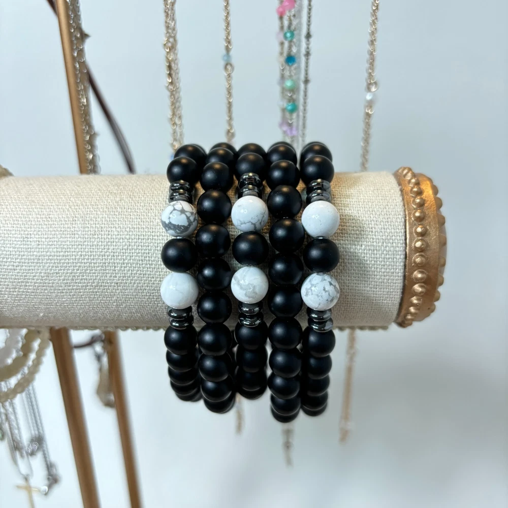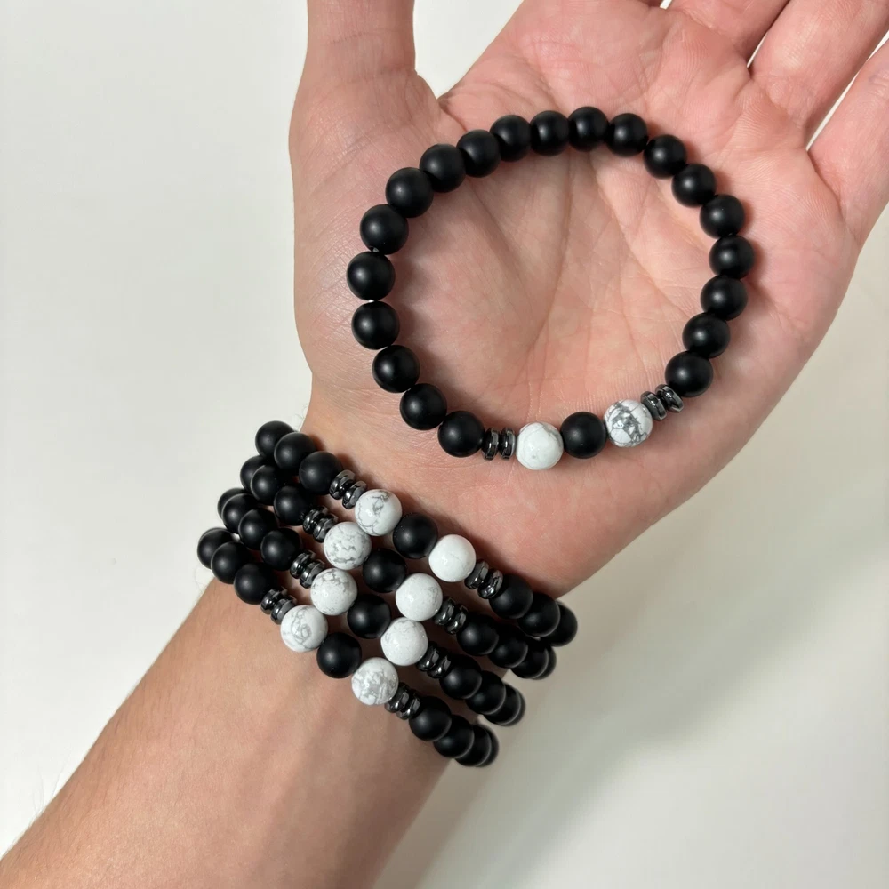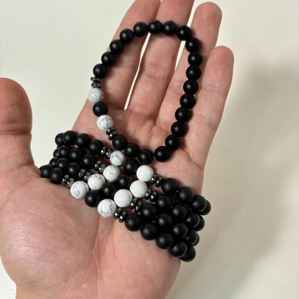 Main Stone: Obsidian Number of Gemstones: 24 Material: Crystal, Gemstone Country of Origin: China Main Stone Width: 8 mm Occasion: Anniversary, Birthday, Christmas, Mother's Day, Valentine's Day Secondary Stone: Howlite Closure: Tie Charm Type: Bead Main Stone Color: Black Item Length: 7.5 in Country/Region of Manufacture: China Type: Bracelet Metal: Silver Main Stone Creation: Natural Main Stone Length: 8 mm Features: Adjustable, Stackable Main Stone Shape: Round Gemstone Clarity Grade: Eye Clean Main Stone Depth: 8 mm Shape: Round Style: Beaded Color: Black Chain Type: Ball/Bead Brand: Unbranded