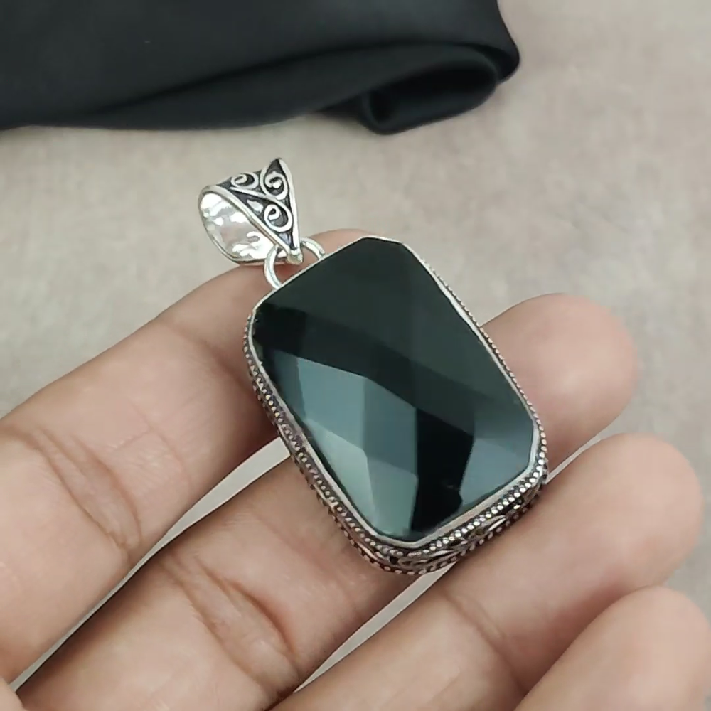 Base Metal:Sterling SilverNumber of Diamonds:N/AType:PendantNecklace Length:5"Certification:N/ADiamond Clarity Grade:N/AMetal Purity:925Brand:HandmadeMaterial:GemstoneFeatures:HandmadeStyle:PendantTheme:Beauty, Bohemian, Ethnic, Halloween, Love, NatureClosure:Same As PictureColor:SilverMain Stone Shape:EmeraldChain Type:N/AMain Stone Creation:NaturalCountry/Region of Manufacture:IndiaDiamond Color Grade:N/ACut Grade:N/AMain Stone:Black OnyxCountry of Origin:IndiaPendant/Locket Type:Same As PictureMain Stone Color:BlackColored Diamond Intensity:N/AMetal:Sterling SilverSetting Style:BezelCollection:HandmadeMain Stone Treatment:Not EnhancedSecondary Stone:N/APendant Shape:Same As PictureOccasion:Anniversary, Birthday, Christening, Christmas, Engagement, Father's Day, Graduation, Mother's Day, Valentine's Day, WeddingTotal Carat Weight:10 carat and aboveNumber of Gemstones:1