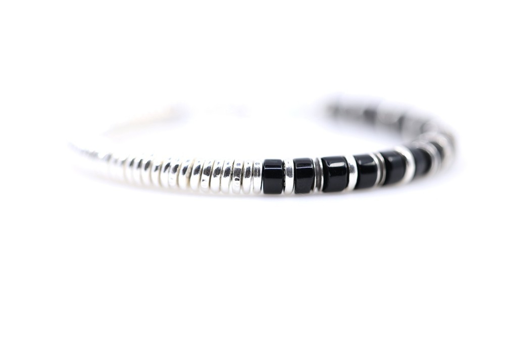 ✨ This unisex bracelet pairs deep black onyx heishi beads with bright sterling silver spacer beads in a clean split design that immediately catches the eye. The 6mm profile gives it a confident presence while staying sleek, modern, and easy to wear. Inspired by Native American artistry and the timeless contrast of dark and light, the bracelet feels strong, balanced, and intentional. It works equally well worn alone as a statement or layered with other favorites. 💎 Crafted for durability and comfort, strung on nylon coated stainless steel wire the bracelet is secured with a sterling silver lobster clasp for dependable everyday wear. Black onyx has long been associated with protection, grounding, and inner strength, while sterling silver represents clarity and refinement. Together they create a powerful visual and symbolic balance that makes this piece meaningful as well as stylish. ------------Details:------------ Bead Size: 6mm Color: Black and Silver Accessories: Sterling Silver Lobster Clasp Metal: Sterling Silver Bracelet Length: Available from 6" to 9.5". Please select your size from the dropdown menu. Styling: Unisex styling, suitable for a man or woman and would make a perfect gift! Packaging: All pieces purchased come ready for gift-giving Lead Time: Shipping on this item is within 3 days of receiving payment. 📦 Shipping: Standard Shipping to U.S. Addresses: Orders are shipped via USPS 1st class mail. Domestic delivery times range between 2-9 days, but in most cases 2-4 business days to the contiguous 48 states. Standard Shipping to International Addresses: Orders are shipped via USPS 1st class international mail. Delivery times range between 10-21 business days.