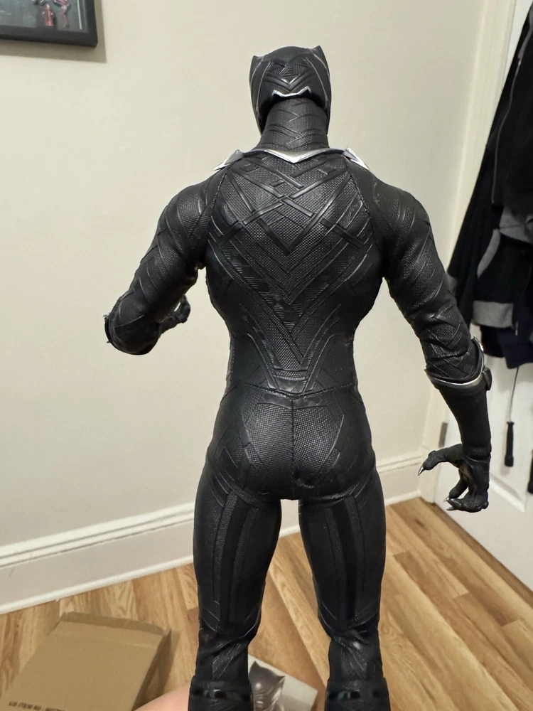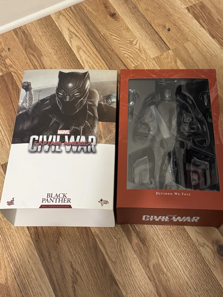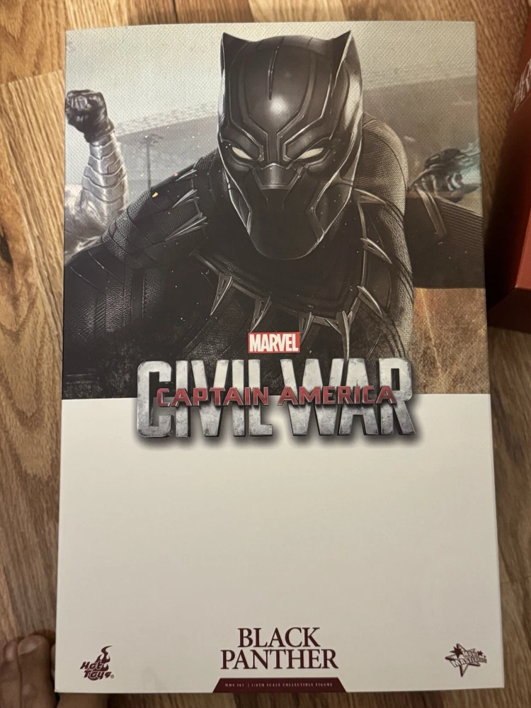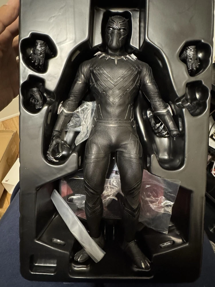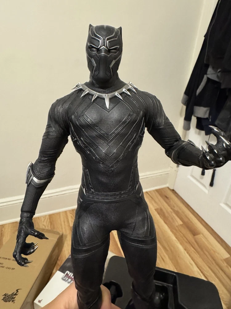 Introducing the Black Panther action figure from Hot Toys, based on the character's appearance in the movie Captain America: Civil War. This 1:6 scale figure features incredible attention to detail, with a sleek black costume and a variety of interchangeable hands. Made from high-quality plastic, this figure is perfect for collectors of all ages and is sure to be a hit with fans of the Captain America franchise. Whether you're a seasoned collector or just starting out, this original licensed reproduction is a must-have addition to your collection. Figure was never played with or abused. It was displayed in a glass case. Comes complete with ORIGINAL shipper box, instructions and all accessories and packaging!