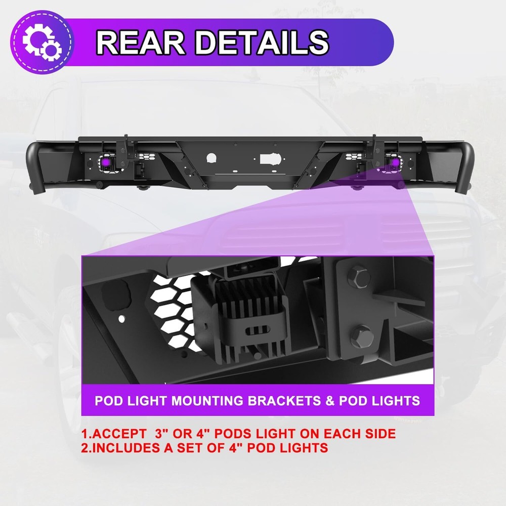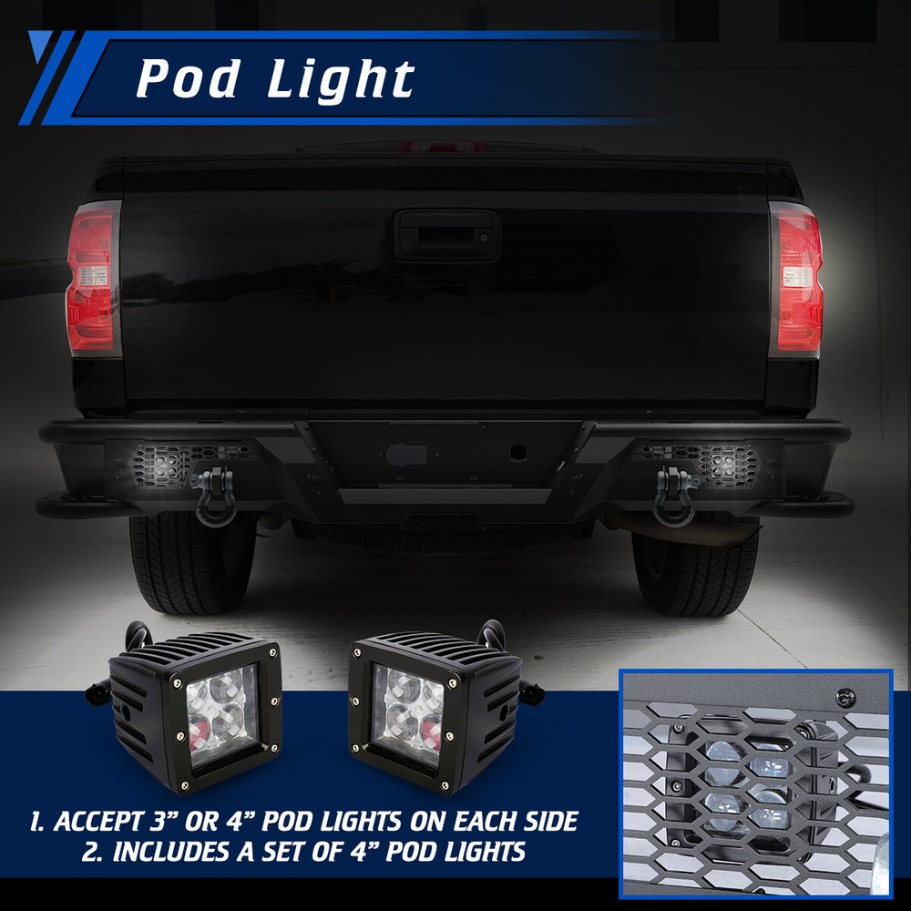 Item Length: 78.3 inch Package Weight: 80.47 lbs Features: Easy Installation, Durable, No Drilling Required, Modular 3-piece design Item Width: 13.8 inch Performance Part: Yes Fitment 2: For 2007-2018 GMC Sierra 1500 Placement on Vehicle: Rear Brand: WolfX Fitment Type: Direct Replacement Return Shipping: Seller pays. Free return shipping within 48 states Shipping Fee: Free shipping within 48 states Interchange Part Number: Works With Factory Trailer Hitch, Works with Factory Parking Sensors, Pod Light Mounting Bracket, Accept 3" or 4" Pods Light on Each Side, Flip-up Licence Plate Mounting Bracket, High Strength D-Ring Mounts,D-Ring are included, Licence Plate Light Mounting Hole, Mounting Hole for Parking Sensors, Mounting hole for Spare Wheel Lock, Mounting hole for trailer plug, Built-in antiskid steps for easy access to bed Items Included: Mounting Hardware, Bolts, Screws, Rear Bumper, D-ring Shackles, LED Pod Lights Package Dimensions: 33.46 * 33.46 * 13.39 inch Universal Fitment: No Finish: Polished, Powder-Coated, Textured Material: Steel UPC: Does not apply Fitment 1: For 2007-2018 Chevy Silverado 1500 OE/OEM Part Number: Rear Bumper Replacement Manufacturer Warranty: 1 Year Manufacturer Part Number: Rear Step Bumper gtin13: Does not apply Country/Region of Manufacture: United States Type: Rear Bumper Item Height: 10.1 inch Fast Shipping Time: Same day shipping before 1pm PST order Color: Black Vintage Part: No Attachment Type: Bolt-On, Screw-On