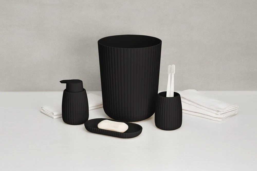 Transform your bathroom into a stylish oasis with the Mainstays Rubberized Plastic Ribbed Bathroom Set. This 4-piece ensemble blends sleek design with practicality, elevating your sink or countertop effortlessly. The ribbed toothbrush holder offers a spacious and secure spot for toothbrushes and other essentials, while its rubberized surface ensures stability and durability. The 1.64-gallon black wastebasket efficiently manages daily waste, adding a subtle texture to your space. Enhance your handwashing experience with the ribbed soap pump, which delivers the perfect amount of soap or lotion with each press, available in four neutral colors. Completing the set is the versatile accessory tray, perfect for organizing your soap pump, toothbrush holder, jewelry, or makeup, while its modern design fits seamlessly into any bathroom decor. Available in four neutral colors, this set combines function and charm, giving your bathroom an instant upgrade. Durable and practical, this 4-piece set includes a toothbrush holder, wastebasket, soap pump, and accessory tray, blending seamlessly with any bathroom decor The set features a sleek, ribbed design that adds a contemporary touch to your bathroom decor while providing practical functionality. This item offers ample space to store toothbrushes, hairbrushes, and other small essentials. The rubberized surface prevents slipping and enhances grip, making it a practical and stylish storage solution. Durable Construction: Crafted from high-quality rubberized plastic, each item in the set is designed for durability and long-lasting use in your bathroom.