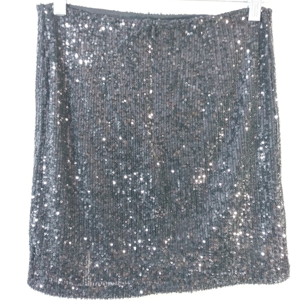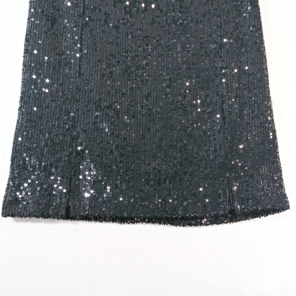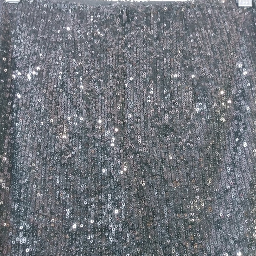 Love On A Hanger Black Sequin Mini Skirt Size 5 Sequin Mini length Lined 2 front cut outs for easy movement Back zipper gently worn approximate measurements waist across 14" length 16"