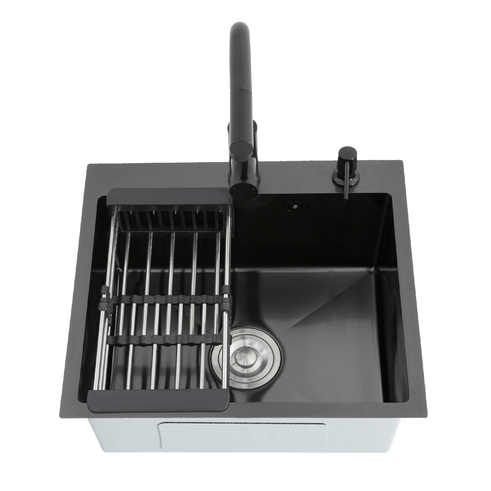 Kitchen Sink Stainless Steel Sink Sink Black Stainless Steel Built-in Sink w/Tap ❤Welcome❤ Description This 304 stainless steel kitchen sink adopts a nano-coating process, making it easy to clean and not easy to fade. Its enlarged and deepened sink not only alleviates splash problems but also improves space utilization and facilitates the cleaning of large quantities of cookware. The equipped draining basket allows for the convenient cleaning of fruits and vegetables. With it, you can enjoy a more convenient and healthier life. Key Features Build to Last: High-quality 304 stainless steel is not easy to rust, wear, and deform, and a 6-layer protective nano-coating prevents stains from adhering and enhances the sink's resistance to scratches and abrasion, making it hard to fade and reducing bacterial growth. Large Sink Size: It is large ( 18.11*13.98*7.87 inches) enough to accommodate multiple plates, dishes, and pots at once. Moreover, it prevents splashing when washing fruits and vegetables. Flexible Washing: The 360° rotatable pull-out faucet extends 23.62 inches to allow you to wash at different angles or flush the sink corners. You can switch its flush and shower water modes through the button on the spout and adjust the cold and hot water and water volume with the single handle. Humanized Design: The anti-condensation coating prevents condensation in the sink and thus prevents moisture in the kitchen cabinets. The soundproof mats on the surrounds and bottom reduce noise. Quick Drainage: It has X-shaped water guidelines and a high-performance drainer set for good drainage, effectively preventing water from accumulating inside. Complete Set: The combination of a sink and a range of accessories meets your needs in one go and is easy to install. In addition, we offer you a soap dispenser and a retractable draining basket to facilitate the draining of your dishes and allow for convenient hand washing. Easy Cleaning: Thanks to its smooth nano-coating surface, simple structure, R10 radius corners, and open design, you can easily wipe or rinse away grease and dirt on it without leaving a trace. Stylish Appearance: The modern, clean lines and elegant black color match all types of decor, making it a unique and beautiful addition to your kitchen while providing you with practical functionality. Ideal Gift: Its beautiful appearance and practical function make it an ideal housewarming gift for your friends, families, and colleagues. Details Overflow Holes: The overflow holes hidden in the sink wall prevent water from overflowing and wetting countertops and floors. Pre-drilled Holes: The reserved holes allow you to conveniently install the equipped soap dispenser and faucet. Smooth Edge: The rounded and smooth edges not only add to the aesthetics of the product but also improve the safety of use. Application This product can be widely used in homes, restaurants, laundry rooms, basements, bars, kitchens, food trucks, dessert shops, coffee shops, hotels, garages, etc. for cleaning tableware, vegetables, fruits, etc. Specification Color: Black Style: Modern Shape: Rectangular Material: 304 Stainless Steel Process: Nano-coating Assembly Required: Yes Mounting Type: Undermount, Topmount Faucet Pull-out Length: 60cm/23.62in Water Inlet Pipe Length: 60cm/23.62in Sink Size: 46*35.5*20 cm/ 18.11*13.98*7.87 in Product Size: 50*45 cm/ 19.69*17.72 in Package Size: 49*45*21.5 cm/ 19.29*17.72*8.46 in Gross Weight: 3.6kg/ 7.93lbs Net Weight: 3.3kg/ 7.28lbs Package Included 1* Kitchen Sink 1* Soap Dispenser 1* Drain Basket 1* Pull-out Faucet 1* Drainer Set 1* Multilingual Manual Other Accessories for Installation Notes Please check the size carefully before ordering. Please read the assembly instructions carefully before installation. We recommend installation by a professional. Please do not clean it with hard tools like steel wire balls for a longer service life. Please allow the slight color difference caused by the shooting light and the 1-3 cm error due to manual measurement, and make sure you do not mind before ordering. Welcome to bestwishes4y to purchase products, please feel free to contact us for any questions.👍 Payment Delivery details Terms of sales About us Contact us Payment We accept ebay payment 。 Fees such as import duties, taxes are not included in the item price or shipping costs. These charges are the buyer's responsibility. Delivery details Shipping: 2-9 working days to: USA Terms of sales We maintain high standards of excellence and strive for hundred percent customer satisfaction. Feedback is very important to us. We hope that you contact us immediately before you give neutral or negative feedback, so that we can address your concerns. It is impossible to address issues if we do not know about them! About us Your satis faction is our ultimate goal. We work hard to earn your trust and future business. Our certified technicians have tested each item before shipping. The unit comes with 1 year limited warranty on all manufacturing defects. a) If you receive a defective item, you may return it or ask for a discount. Please contact us within 14 days after you receive the package. b) What you returned must be intact and in its original packaging as re? u. Customer is responsible for shipping costs of the returned item. c) We will cover the cost of shipping back t with the shipping rate indicated in the registration page. We will send you a new unit or refund the full payment you paid. Thank you. Contact us Business Hour Business Hour: Monday To Friday: 8:30 AM to 5:00 PM (Beijing China time) Due to time zones, our reply to your questions may not be immediately. But within above working time, we will reply your email within 24 hours. If it's non-workdays, please kindly be patient and wait till Monday. Please contact us with ebay message. Please feel free to contact us if you have any questions. Monday To Friday: 8:30 AM to 5:00 PM (Beijing China time) Due to time zones, our reply to you