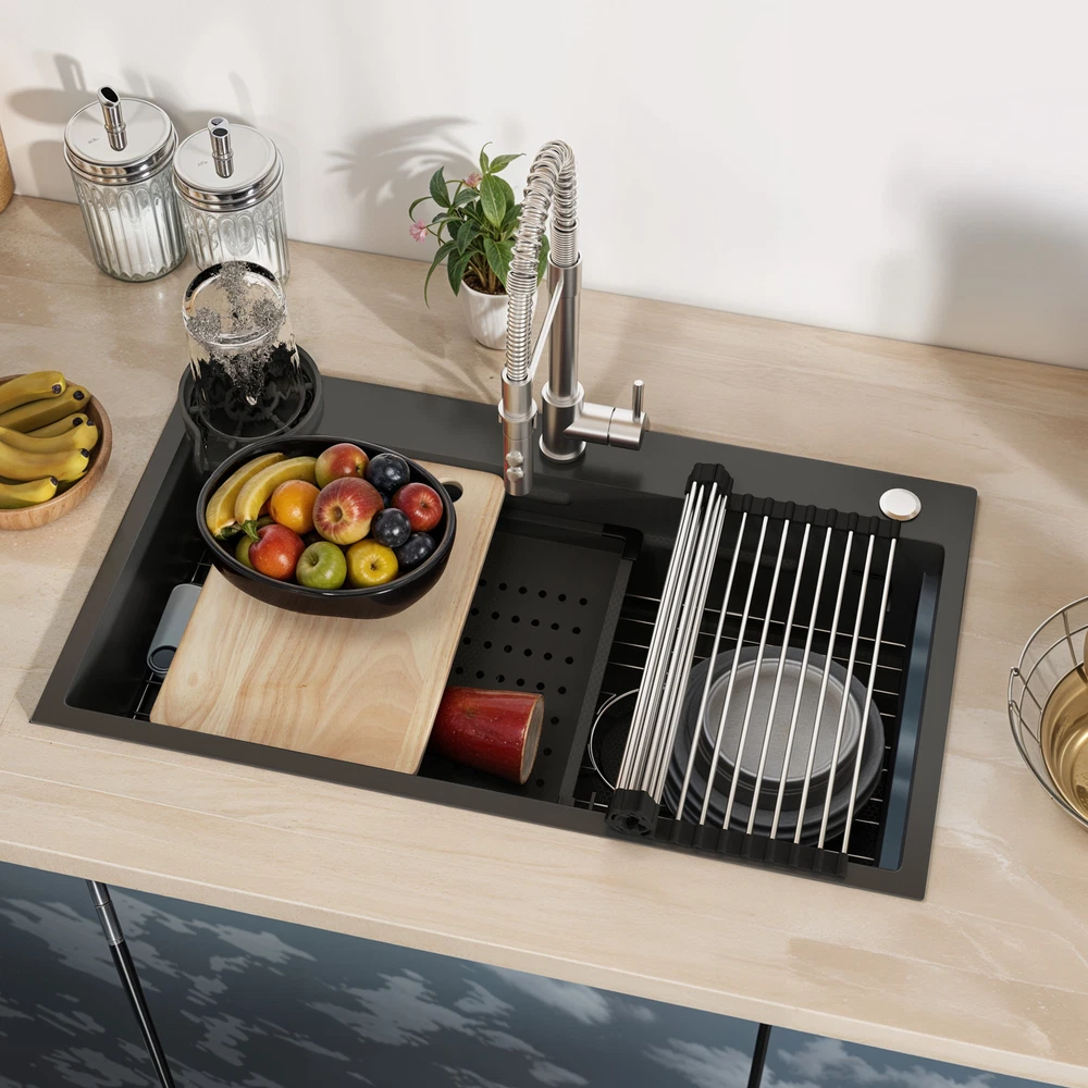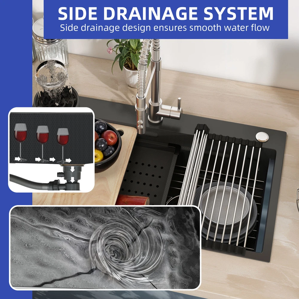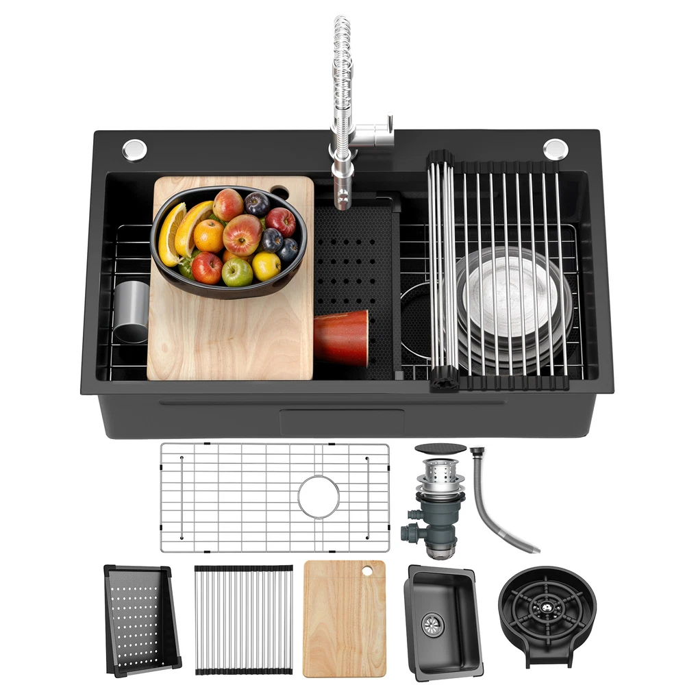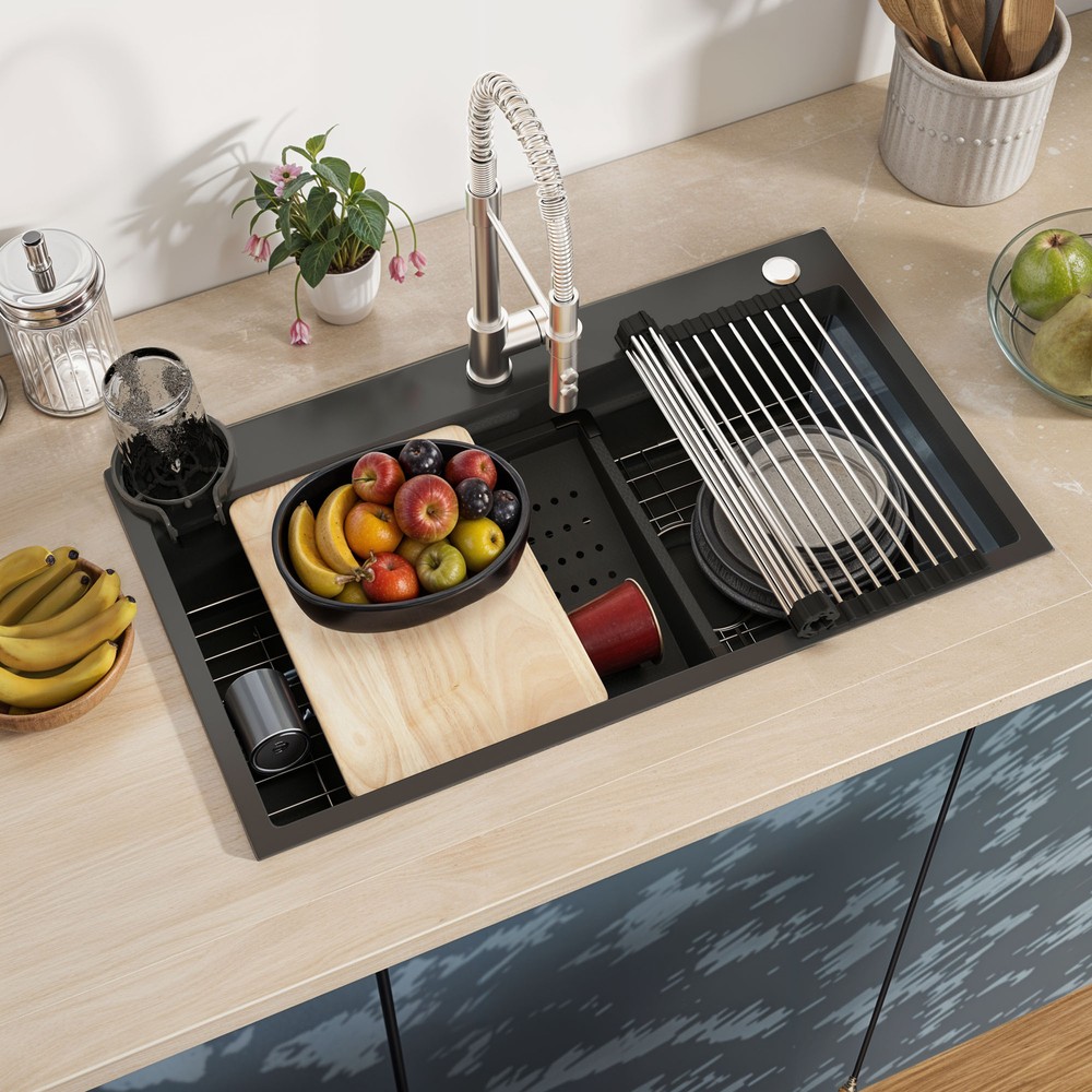 Kitchen Sink Black Stainless Steel Drop-in Multi-Tier Cutting Board Single Bowl Product Description NOTE: Professional Installation would be Highly Recommended. Description: 1. Color: Black 2. Material: Stainless Steel 3. Product Type: Kitchen Sink 4. Model: Drop-in 5. Shape: Rectangular 6. Drain Type: Grid 7. Style: 3 in 1 (Cutting, Washing, and Draining) 8. Recommendation Used: Home Kitchen, Commercial, Bar, RV's 9. Special Features: Drop-in/Topmount Design, Double Deck Track Design, Cutting Board, Movable Basin, Strainer Bowl, Filter Foods Scraps, Multi-Tier Dish Rack, Side Drainage System, Nano Honeycomb Structure Features: Premium Stainless Steel Kitchen Sink – The Ultimate Blend of Style, Function & Durability Effortless Cleaning with Smart Design: Keep your kitchen spotless with this easy-to-maintain stainless steel sink, featuring a 3mm edge and R10 rounded corners for quick, hassle-free cleaning. Its scratch-resistant stainless steel resists daily wear and tear, while the included cup washer simplifies post-meal cleanup—saving you time and effort with every use. Advanced Nano Coating for a Sleek & Durable Finish: Upgrade your kitchen aesthetics with the black PVD bronze finish and honeycomb surface treatment, offering superior scratch resistance and stain protection. The fingerprint-free, water-repellent coating ensures your sink stays pristine and polished with minimal maintenance—keeping your kitchen looking effortlessly elegant. Optimized Water Drainage & Easy Maintenance: No more standing water! The sloped bottom and offset drain promote smooth water flow, preventing pooling and ensuring quick drying. The removable bottom panel makes debris cleanup effortless, while the standard 3.5-inch drain fits seamlessly with any garbage disposal unit, making kitchen maintenance a breeze. Ultra-Quiet Operation with Flexible Installation: Enjoy a noise-free kitchen experience with the large sound-absorbing pad, minimizing clatter from dishes and running water. With the option for drop-in or top-mount installation, this sink is perfect for homes, bars, RVs, and commercial kitchens —offering versatile placement and seamless integration into any setting. All-in-One Workstation for Maximum Efficiency: Measuring 30" x 18" x 10", this spacious 28" x 14" x 9" bowl provides ample room for washing, prepping, and drying. It comes fully equipped with premium accessories, including a solid cutting board, cup washer, roll-up drying rack, sink grid, drainage basket, storage basin, and a basket -style filter drain pipe—giving you a complete workstation in one smart solution. Upgrade your kitchen with this high-performance, ultra-durable stainless steel sink—where innovation meets convenience for a superior cooking experience! Dimensions: 1. Product Dimensions: 30"L x 18"W x 9"H 2. Drainer Hole Dimensions: 3.5 in 3. Item Weight: 32.4 lb Package Included: 1 x Kitchen Sink 1 x Wood Cutting Board 1 x Glass Rinser 1 x Storage Basin 1 x Foldable Roller 1 x Drainage Basket 1 x Downpipe 1 x Instructions Manual 1 x Pack of Accessories Shipping 1. Normally the item will be dipatched within 1 business day if payment is cleared before 12pm PST. 2. Please verify the correct shipping address in your PayPal account before making the payment. We only dispatch the item to the address that is sent to us at the time of checkout. 3. We don't ship to Hawaii, Alaska, Puerto Rico, APO/FPO/PO Boxes. 4. We don't provide local pick-up service. 5. Normally we will use USPS, UPS, FedEx & LTL to dispatch items. Payment 1. We accept PayPal and credit card. 2. We will ship to the confirmed Paypal shipping address that is provided with the payment only. Return 1. 30 days Money Back Guarantee. 2. Please contact our customer service to receive a RMA form first if want to return the item. 3. All returned items MUST in new condition with the original package. Contact If has any problem, please contact us by sending an ebay message. Our customer service will resolve the problem as soon as possible. On Feb 5, 2025 at 01:32:35 PST, seller added the following information: