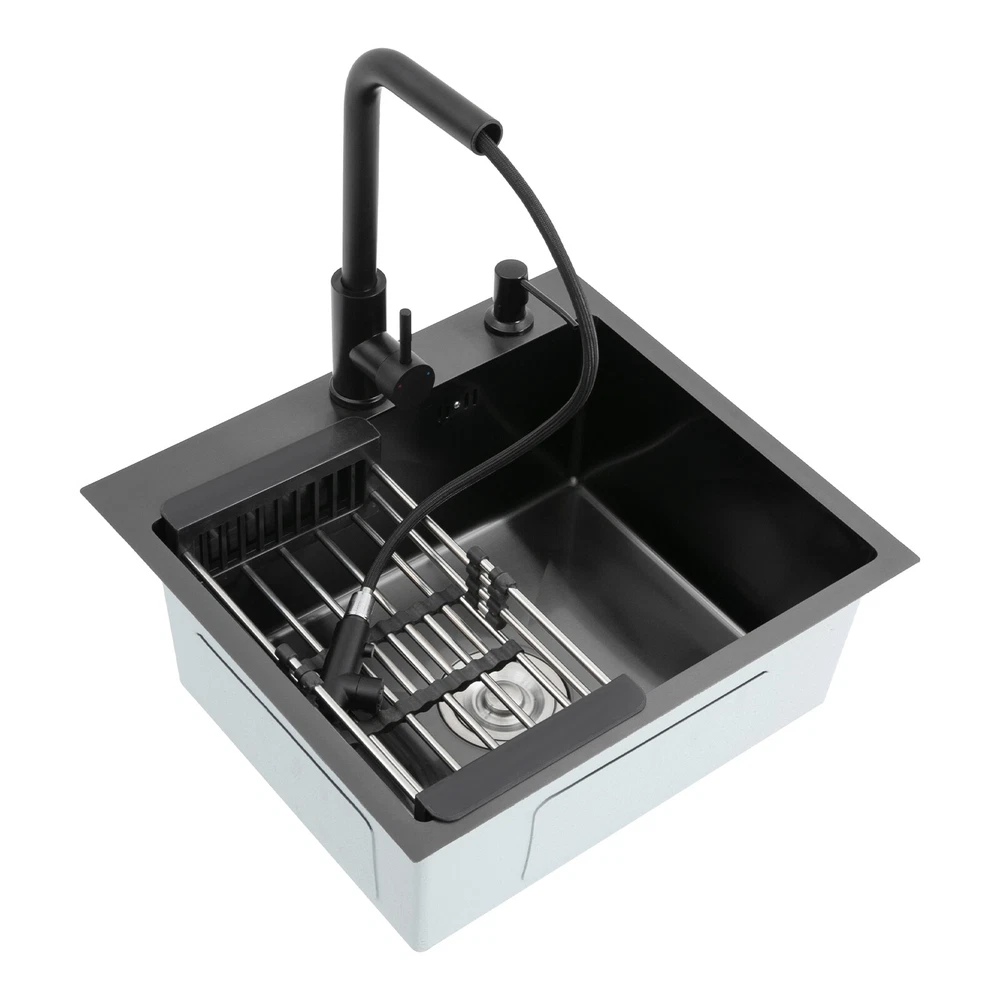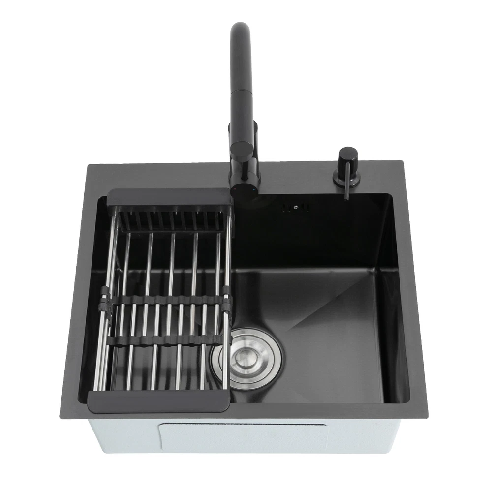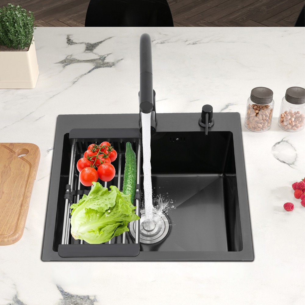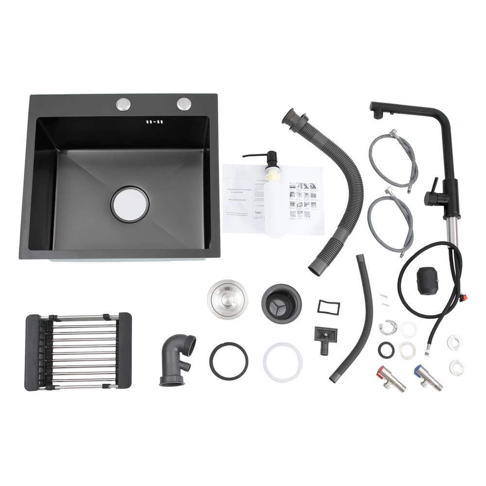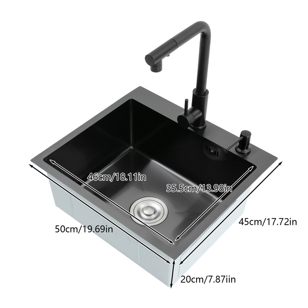 Kitchen Sink Stainless Steel Sink Sink Black Stainless Steel Built-in Sink w/Tap Welcome to haohaofacai~ Description This 304 stainless steel kitchen sink adopts a nano-coating process, making it easy to clean and not easy to fade. Its enlarged and deepened sink not only alleviates splash problems but also improves space utilization and facilitates the cleaning of large quantities of cookware. The equipped draining basket allows for the convenient cleaning of fruits and vegetables. With it, you can enjoy a more convenient and healthier life. Key Features Build to Last: High-quality 304 stainless steel is not easy to rust, wear, and deform, and a 6-layer protective nano-coating prevents stains from adhering and enhances the sink's resistance to scratches and abrasion, making it hard to fade and reducing bacterial growth. Large Sink Size: It is large ( 18.11*13.98*7.87 inches) enough to accommodate multiple plates, dishes, and pots at once. Moreover, it prevents splashing when washing fruits and vegetables. Flexible Washing: The 360° rotatable pull-out faucet extends 23.62 inches to allow you to wash at different angles or flush the sink corners. You can switch its flush and shower water modes through the button on the spout and adjust the cold and hot water and water volume with the single handle. Humanized Design: The anti-condensation coating prevents condensation in the sink and thus prevents moisture in the kitchen cabinets. The soundproof mats on the surrounds and bottom reduce noise. Quick Drainage: It has X-shaped water guidelines and a high-performance drainer set for good drainage, effectively preventing water from accumulating inside. Complete Set: The combination of a sink and a range of accessories meets your needs in one go and is easy to install. In addition, we offer you a soap dispenser and a retractable draining basket to facilitate the draining of your dishes and allow for convenient hand washing. Easy Cleaning: Thanks to its smooth nano-coating surface, simple structure, R10 radius corners, and open design, you can easily wipe or rinse away grease and dirt on it without leaving a trace. Stylish Appearance: The modern, clean lines and elegant black color match all types of decor, making it a unique and beautiful addition to your kitchen while providing you with practical functionality. Ideal Gift: Its beautiful appearance and practical function make it an ideal housewarming gift for your friends, families, and colleagues. Details Overflow Holes: The overflow holes hidden in the sink wall prevent water from overflowing and wetting countertops and floors. Pre-drilled Holes: The reserved holes allow you to conveniently install the equipped soap dispenser and faucet. Smooth Edge: The rounded and smooth edges not only add to the aesthetics of the product but also improve the safety of use. Application This product can be widely used in homes, restaurants, laundry rooms, basements, bars, kitchens, food trucks, dessert shops, coffee shops, hotels, garages, etc. for cleaning tableware, vegetables, fruits, etc. Specification Color: Black Style: Modern Shape: Rectangular Material: 304 Stainless Steel Process: Nano-coating Assembly Required: Yes Mounting Type: Undermount, Topmount Faucet Pull-out Length: 60cm/23.62in Water Inlet Pipe Length: 60cm/23.62in Sink Size: 46*35.5*20 cm/ 18.11*13.98*7.87 in Product Size: 50*45 cm/ 19.69*17.72 in Package Size: 49*45*21.5 cm/ 19.29*17.72*8.46 in Gross Weight: 3.6kg/ 7.93lbs Net Weight: 3.3kg/ 7.28lbs Package Included 1* Kitchen Sink 1* Soap Dispenser 1* Drain Basket 1* Pull-out Faucet 1* Drainer Set 1* Multilingual Manual Other Accessories for Installation Notes Please check the size carefully before ordering. Please read the assembly instructions carefully before installation. We recommend installation by a professional. Please do not clean it with hard tools like steel wire balls for a longer service life. Please allow the slight color difference caused by the shooting light and the 1-3 cm error due to manual measurement, and make sure you do not mind before ordering. Welcome to bestwishes4y to purchase products, please feel free to contact us for any questions.?? Payment Delivery details Terms of sales About us Contact us Payment We accept ebay payment 。 Fees such as import duties, taxes are not included in the item price or shipping costs. These charges are the buyer's responsibility. Delivery details Shipping: 2-9 working days to: USA Terms of sales We maintain high standards of excellence and strive for hundred percent customer satisfaction. Feedback is very important to us. We hope that you contact us immediately before you give neutral or negative feedback, so that we can address your concerns. It is impossible to address issues if we do not know about them! About us Your satis faction is our ultimate goal. We work hard to earn your trust and future business. Our certified technicians have tested each item before shipping. The unit comes with 1 year limited warranty on all manufacturing defects. a) If you receive a defective item, you may return it or ask for a discount. Please contact us within 14 days after you receive the package. b) What you returned must be intact and in its original packaging as re? u. Customer is responsible for shipping costs of the returned item. c) We will cover the cost of shipping back t with the shipping rate indicated in the registration page. We will send you a new unit or refund the full payment you paid. Thank you. Contact us Business Hour Business Hour: Monday To Friday: 8:30 AM to 5:00 PM (Beijing China time) Due to time zones, our reply to your questions may not be immediately. But within above working time, we will reply your email within 24 hours. If it's non-workdays, please kindly be patient and wait till Monday. Please contact us with ebay message. Please feel free to contact us if you have any questions. Monday To Friday: 8:30 AM to 5:00 PM (Beijing China time) Due to time zones, our repl