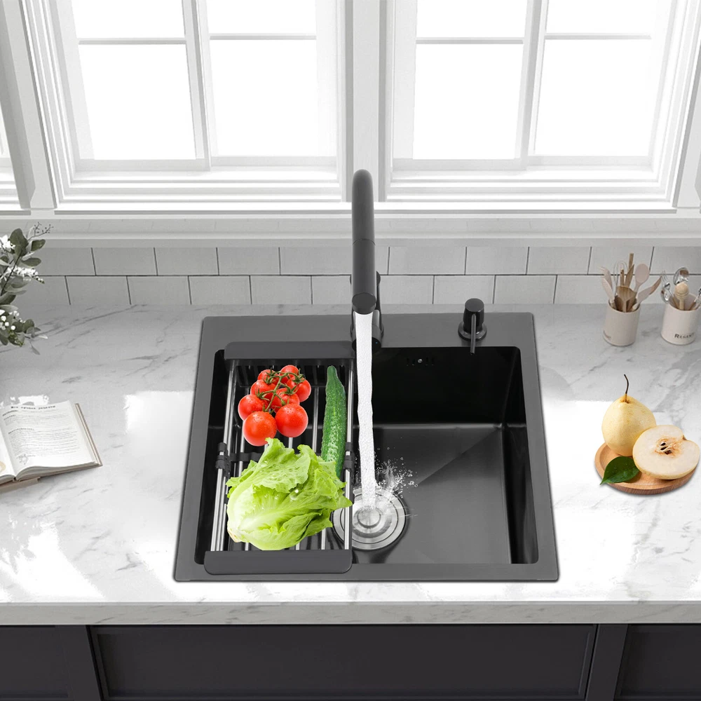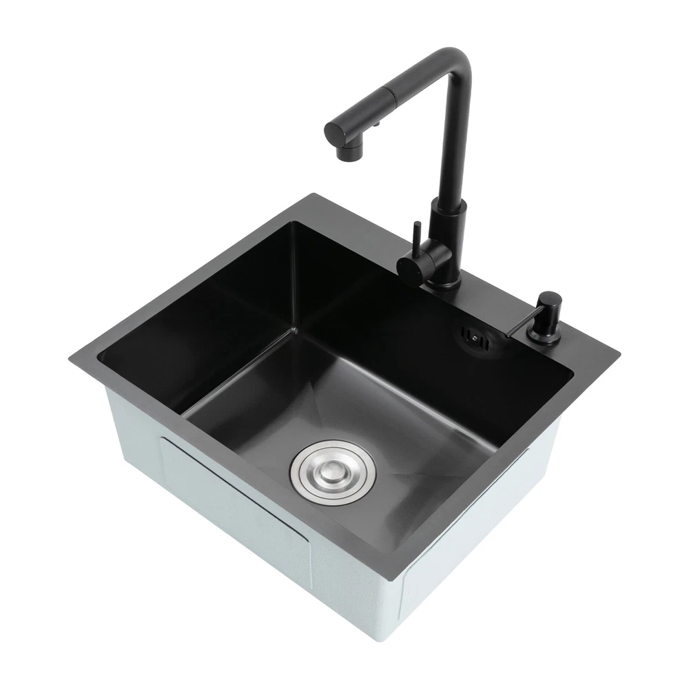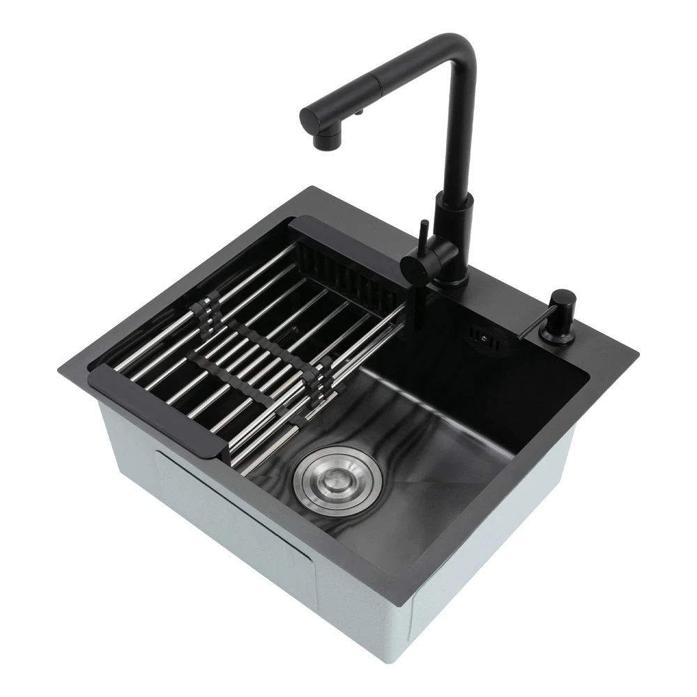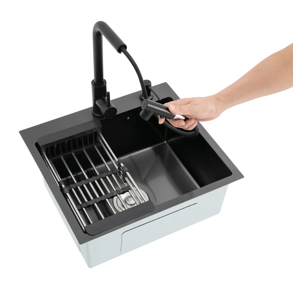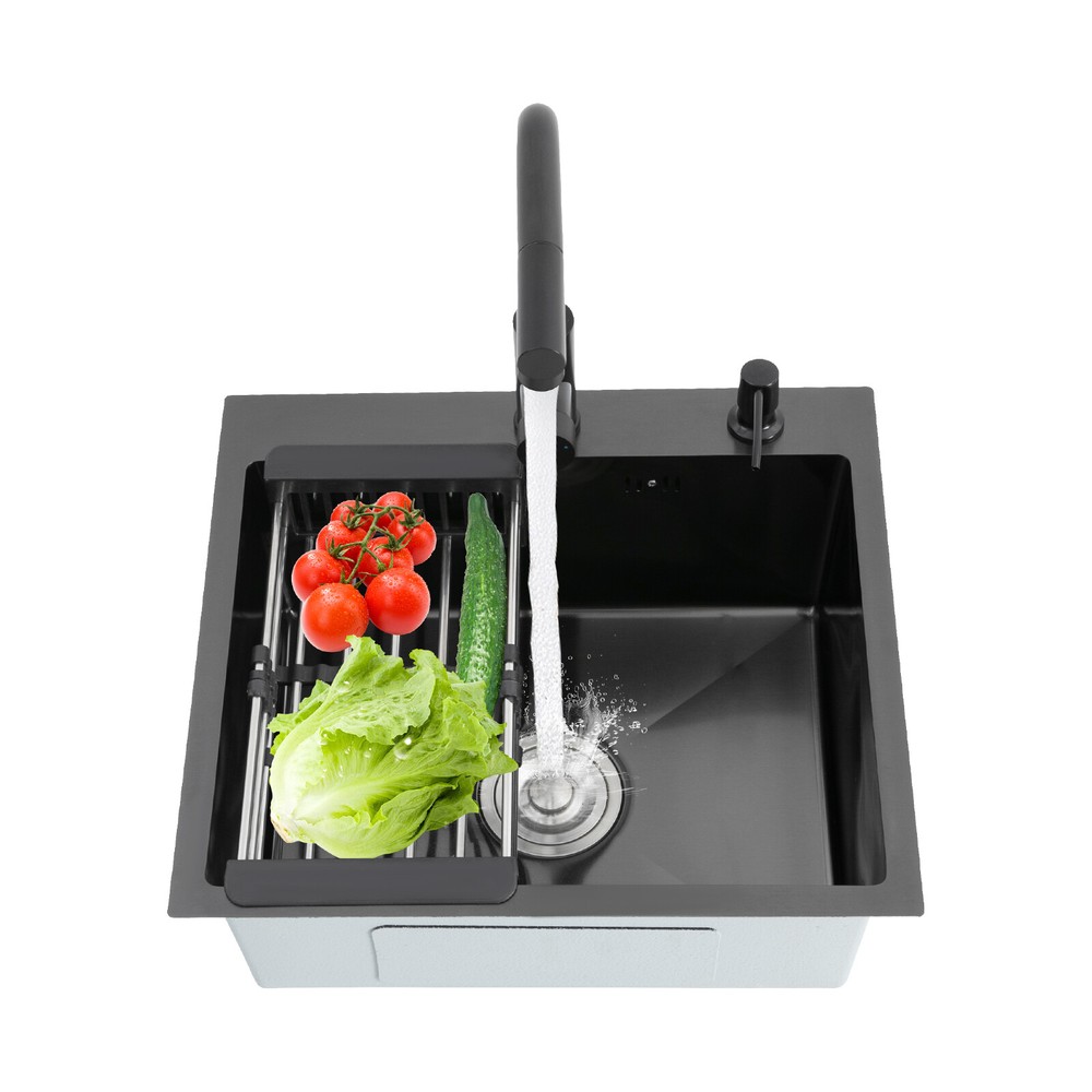 Kitchen Sink Stainless Steel Sink Sink Black Stainless Steel Built-in Sink w/Tap Welcome to haohaofacai~ Description This 304 stainless steel kitchen sink adopts a nano-coating process, making it easy to clean and not easy to fade. Its enlarged and deepened sink not only alleviates splash problems but also improves space utilization and facilitates the cleaning of large quantities of cookware. The equipped draining basket allows for the convenient cleaning of fruits and vegetables. With it, you can enjoy a more convenient and healthier life. Key Features Build to Last: High-quality 304 stainless steel is not easy to rust, wear, and deform, and a 6-layer protective nano-coating prevents stains from adhering and enhances the sink's resistance to scratches and abrasion, making it hard to fade and reducing bacterial growth. Large Sink Size: It is large ( 18.11*13.98*7.87 inches) enough to accommodate multiple plates, dishes, and pots at once. Moreover, it prevents splashing when washing fruits and vegetables. Flexible Washing: The 360° rotatable pull-out faucet extends 23.62 inches to allow you to wash at different angles or flush the sink corners. You can switch its flush and shower water modes through the button on the spout and adjust the cold and hot water and water volume with the single handle. Humanized Design: The anti-condensation coating prevents condensation in the sink and thus prevents moisture in the kitchen cabinets. The soundproof mats on the surrounds and bottom reduce noise. Quick Drainage: It has X-shaped water guidelines and a high-performance drainer set for good drainage, effectively preventing water from accumulating inside. Complete Set: The combination of a sink and a range of accessories meets your needs in one go and is easy to install. In addition, we offer you a soap dispenser and a retractable draining basket to facilitate the draining of your dishes and allow for convenient hand washing. Easy Cleaning: Thanks to its smooth nano-coating surface, simple structure, R10 radius corners, and open design, you can easily wipe or rinse away grease and dirt on it without leaving a trace. Stylish Appearance: The modern, clean lines and elegant black color match all types of decor, making it a unique and beautiful addition to your kitchen while providing you with practical functionality. Ideal Gift: Its beautiful appearance and practical function make it an ideal housewarming gift for your friends, families, and colleagues. Details Overflow Holes: The overflow holes hidden in the sink wall prevent water from overflowing and wetting countertops and floors. Pre-drilled Holes: The reserved holes allow you to conveniently install the equipped soap dispenser and faucet. Smooth Edge: The rounded and smooth edges not only add to the aesthetics of the product but also improve the safety of use. Application This product can be widely used in homes, restaurants, laundry rooms, basements, bars, kitchens, food trucks, dessert shops, coffee shops, hotels, garages, etc. for cleaning tableware, vegetables, fruits, etc. Specification Color: Black Style: Modern Shape: Rectangular Material: 304 Stainless Steel Process: Nano-coating Assembly Required: Yes Mounting Type: Undermount, Topmount Faucet Pull-out Length: 60cm/23.62in Water Inlet Pipe Length: 60cm/23.62in Sink Size: 46*35.5*20 cm/ 18.11*13.98*7.87 in Product Size: 50*45 cm/ 19.69*17.72 in Package Size: 49*45*21.5 cm/ 19.29*17.72*8.46 in Gross Weight: 3.6kg/ 7.93lbs Net Weight: 3.3kg/ 7.28lbs Package Included 1* Kitchen Sink 1* Soap Dispenser 1* Drain Basket 1* Pull-out Faucet 1* Drainer Set 1* Multilingual Manual Other Accessories for Installation Notes Please check the size carefully before ordering. Please read the assembly instructions carefully before installation. We recommend installation by a professional. Please do not clean it with hard tools like steel wire balls for a longer service life. Please allow the slight color difference caused by the shooting light and the 1-3 cm error due to manual measurement, and make sure you do not mind before ordering. Welcome to bestwishes4y to purchase products, please feel free to contact us for any questions.?? Payment Delivery details Terms of sales About us Contact us Payment We accept ebay payment 。 Fees such as import duties, taxes are not included in the item price or shipping costs. These charges are the buyer's responsibility. Delivery details Shipping: 2-9 working days to: USA Terms of sales We maintain high standards of excellence and strive for hundred percent customer satisfaction. Feedback is very important to us. We hope that you contact us immediately before you give neutral or negative feedback, so that we can address your concerns. It is impossible to address issues if we do not know about them! About us Your satis faction is our ultimate goal. We work hard to earn your trust and future business. Our certified technicians have tested each item before shipping. The unit comes with 1 year limited warranty on all manufacturing defects. a) If you receive a defective item, you may return it or ask for a discount. Please contact us within 14 days after you receive the package. b) What you returned must be intact and in its original packaging as re? u. Customer is responsible for shipping costs of the returned item. c) We will cover the cost of shipping back t with the shipping rate indicated in the registration page. We will send you a new unit or refund the full payment you paid. Thank you. Contact us Business Hour Business Hour: Monday To Friday: 8:30 AM to 5:00 PM (Beijing China time) Due to time zones, our reply to your questions may not be immediately. But within above working time, we will reply your email within 24 hours. If it's non-workdays, please kindly be patient and wait till Monday. Please contact us with ebay message. Please feel free to contact us if you have any questions. Monday To Friday: 8:30 AM to 5:00 PM (Beijing China time) Due to time zones, our repl