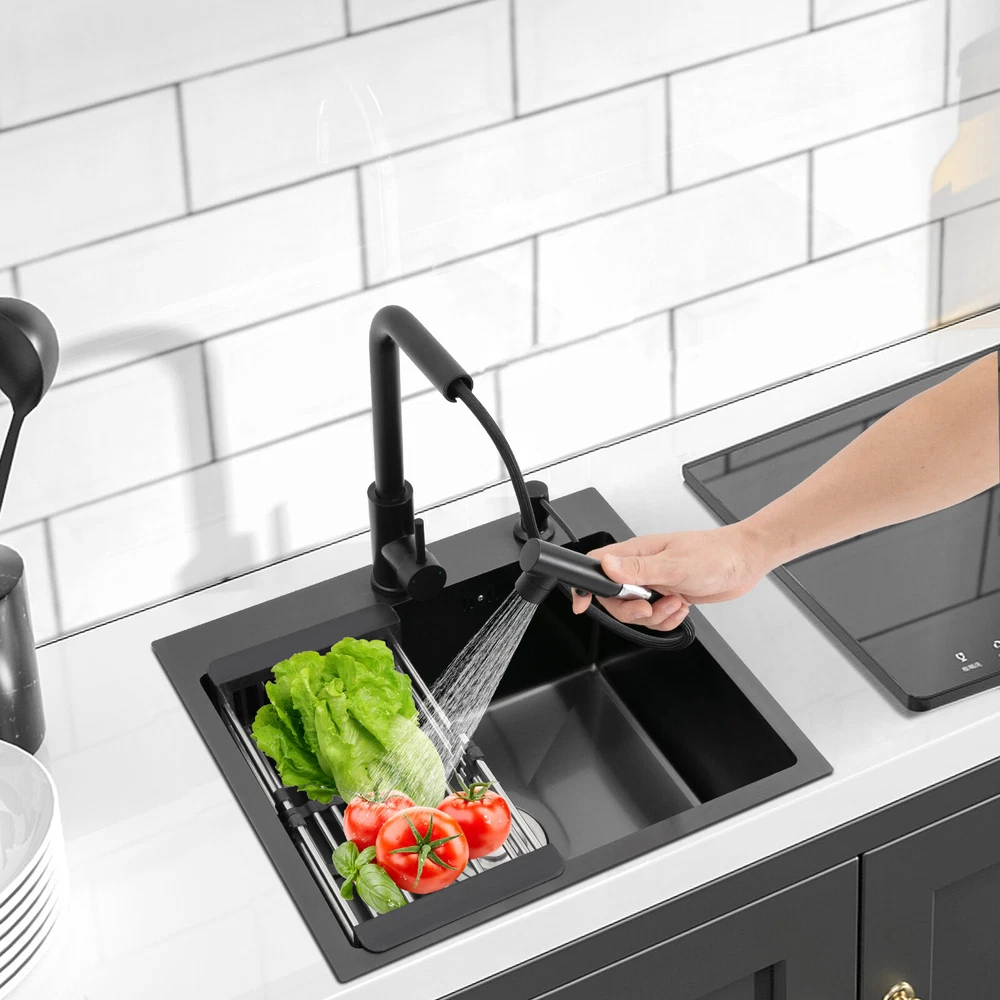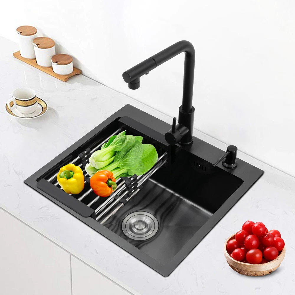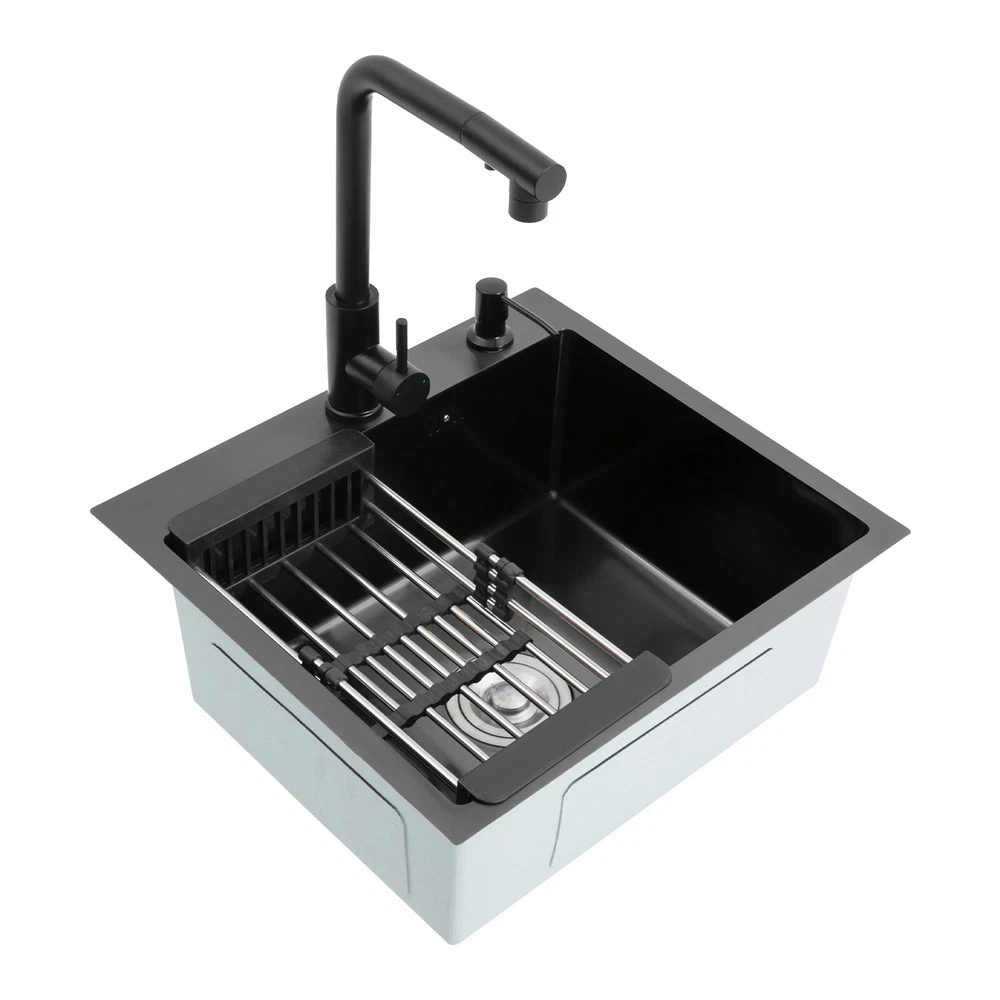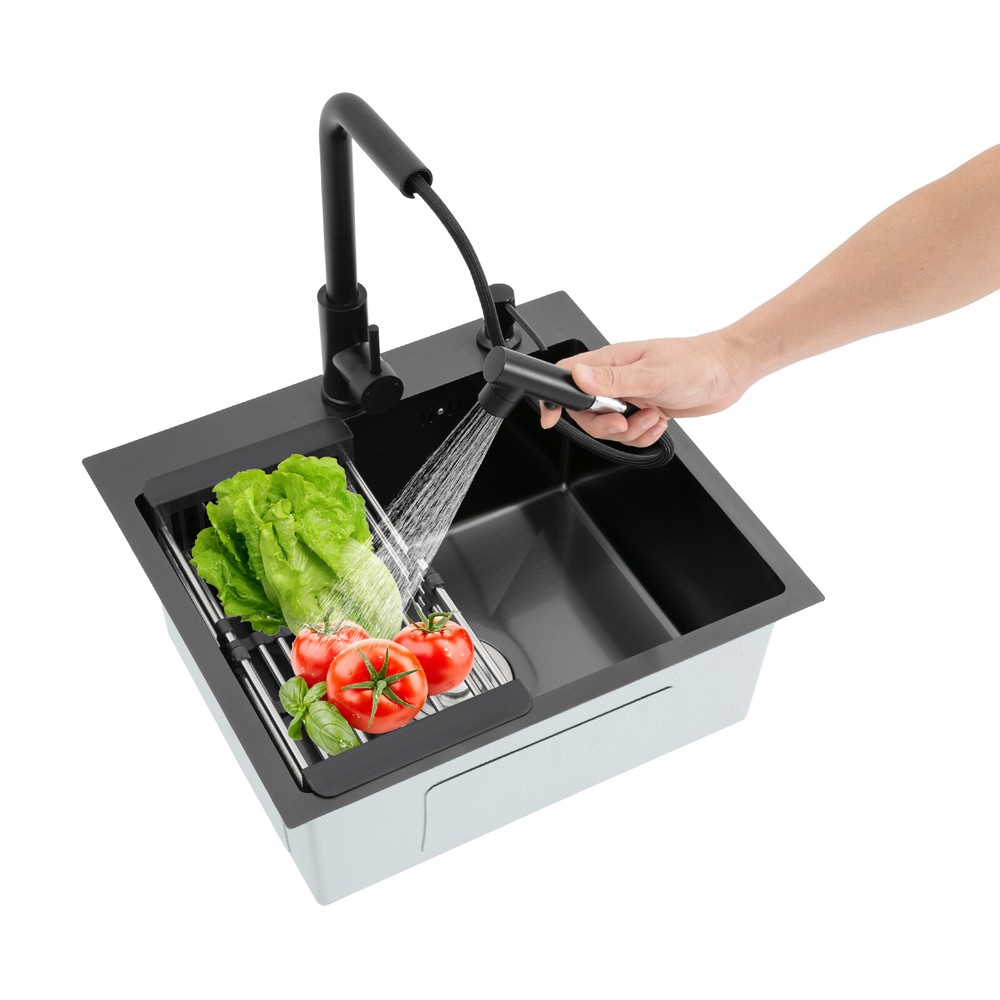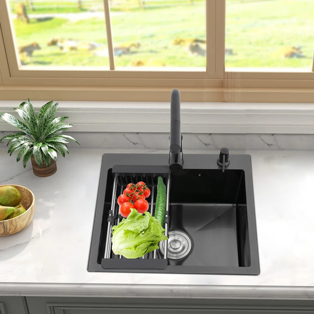 Kitchen Sink Stainless Steel Sink Sink Black Stainless Steel Built-in Sink w/Tap Welcome to haohaofacai~ Description This 304 stainless steel kitchen sink adopts a nano-coating process, making it easy to clean and not easy to fade. Its enlarged and deepened sink not only alleviates splash problems but also improves space utilization and facilitates the cleaning of large quantities of cookware. The equipped draining basket allows for the convenient cleaning of fruits and vegetables. With it, you can enjoy a more convenient and healthier life. Key Features Build to Last: High-quality 304 stainless steel is not easy to rust, wear, and deform, and a 6-layer protective nano-coating prevents stains from adhering and enhances the sink's resistance to scratches and abrasion, making it hard to fade and reducing bacterial growth. Large Sink Size: It is large ( 18.11*13.98*7.87 inches) enough to accommodate multiple plates, dishes, and pots at once. Moreover, it prevents splashing when washing fruits and vegetables. Flexible Washing: The 360° rotatable pull-out faucet extends 23.62 inches to allow you to wash at different angles or flush the sink corners. You can switch its flush and shower water modes through the button on the spout and adjust the cold and hot water and water volume with the single handle. Humanized Design: The anti-condensation coating prevents condensation in the sink and thus prevents moisture in the kitchen cabinets. The soundproof mats on the surrounds and bottom reduce noise. Quick Drainage: It has X-shaped water guidelines and a high-performance drainer set for good drainage, effectively preventing water from accumulating inside. Complete Set: The combination of a sink and a range of accessories meets your needs in one go and is easy to install. In addition, we offer you a soap dispenser and a retractable draining basket to facilitate the draining of your dishes and allow for convenient hand washing. Easy Cleaning: Thanks to its smooth nano-coating surface, simple structure, R10 radius corners, and open design, you can easily wipe or rinse away grease and dirt on it without leaving a trace. Stylish Appearance: The modern, clean lines and elegant black color match all types of decor, making it a unique and beautiful addition to your kitchen while providing you with practical functionality. Ideal Gift: Its beautiful appearance and practical function make it an ideal housewarming gift for your friends, families, and colleagues. Details Overflow Holes: The overflow holes hidden in the sink wall prevent water from overflowing and wetting countertops and floors. Pre-drilled Holes: The reserved holes allow you to conveniently install the equipped soap dispenser and faucet. Smooth Edge: The rounded and smooth edges not only add to the aesthetics of the product but also improve the safety of use. Application This product can be widely used in homes, restaurants, laundry rooms, basements, bars, kitchens, food trucks, dessert shops, coffee shops, hotels, garages, etc. for cleaning tableware, vegetables, fruits, etc. Specification Color: Black Style: Modern Shape: Rectangular Material: 304 Stainless Steel Process: Nano-coating Assembly Required: Yes Mounting Type: Undermount, Topmount Faucet Pull-out Length: 60cm/23.62in Water Inlet Pipe Length: 60cm/23.62in Sink Size: 46*35.5*20 cm/ 18.11*13.98*7.87 in Product Size: 50*45 cm/ 19.69*17.72 in Package Size: 49*45*21.5 cm/ 19.29*17.72*8.46 in Gross Weight: 3.6kg/ 7.93lbs Net Weight: 3.3kg/ 7.28lbs Package Included 1* Kitchen Sink 1* Soap Dispenser 1* Drain Basket 1* Pull-out Faucet 1* Drainer Set 1* Multilingual Manual Other Accessories for Installation Notes Please check the size carefully before ordering. Please read the assembly instructions carefully before installation. We recommend installation by a professional. Please do not clean it with hard tools like steel wire balls for a longer service life. Please allow the slight color difference caused by the shooting light and the 1-3 cm error due to manual measurement, and make sure you do not mind before ordering. Welcome to bestwishes4y to purchase products, please feel free to contact us for any questions.?? Payment Delivery details Terms of sales About us Contact us Payment We accept ebay payment 。 Fees such as import duties, taxes are not included in the item price or shipping costs. These charges are the buyer's responsibility. Delivery details Shipping: 2-9 working days to: USA Terms of sales We maintain high standards of excellence and strive for hundred percent customer satisfaction. Feedback is very important to us. We hope that you contact us immediately before you give neutral or negative feedback, so that we can address your concerns. It is impossible to address issues if we do not know about them! About us Your satis faction is our ultimate goal. We work hard to earn your trust and future business. Our certified technicians have tested each item before shipping. The unit comes with 1 year limited warranty on all manufacturing defects. a) If you receive a defective item, you may return it or ask for a discount. Please contact us within 14 days after you receive the package. b) What you returned must be intact and in its original packaging as re? u. Customer is responsible for shipping costs of the returned item. c) We will cover the cost of shipping back t with the shipping rate indicated in the registration page. We will send you a new unit or refund the full payment you paid. Thank you. Contact us Business Hour Business Hour: Monday To Friday: 8:30 AM to 5:00 PM (Beijing China time) Due to time zones, our reply to your questions may not be immediately. But within above working time, we will reply your email within 24 hours. If it's non-workdays, please kindly be patient and wait till Monday. Please contact us with ebay message. Please feel free to contact us if you have any questions. Monday To Friday: 8:30 AM to 5:00 PM (Beijing China time) Due to time zones, our repl