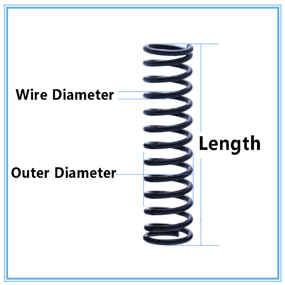 Product description Specifications: 【Features】- Springs occupy an important position in various markets. Stainless steel spiral compression spring, waterproof, rust-proof, durable. 【Application】- Widely used in shipbuilding, computer, electronics, automobile, chemical industry, aerospace, railway, wind power, thermal power, construction machinery, mining machinery, construction machinery, elevators and other fields. Wire diameter:1.2mm Diameter:6mm - 20mm Length:10 - 50mm Material:Spring Steel Colour: Black Surface Treatment: Blackened