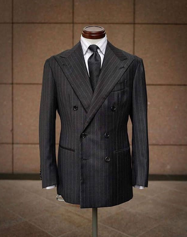 Black Striped Peak Lapel Double Breasted Mens Wedding Tuxedo Suit