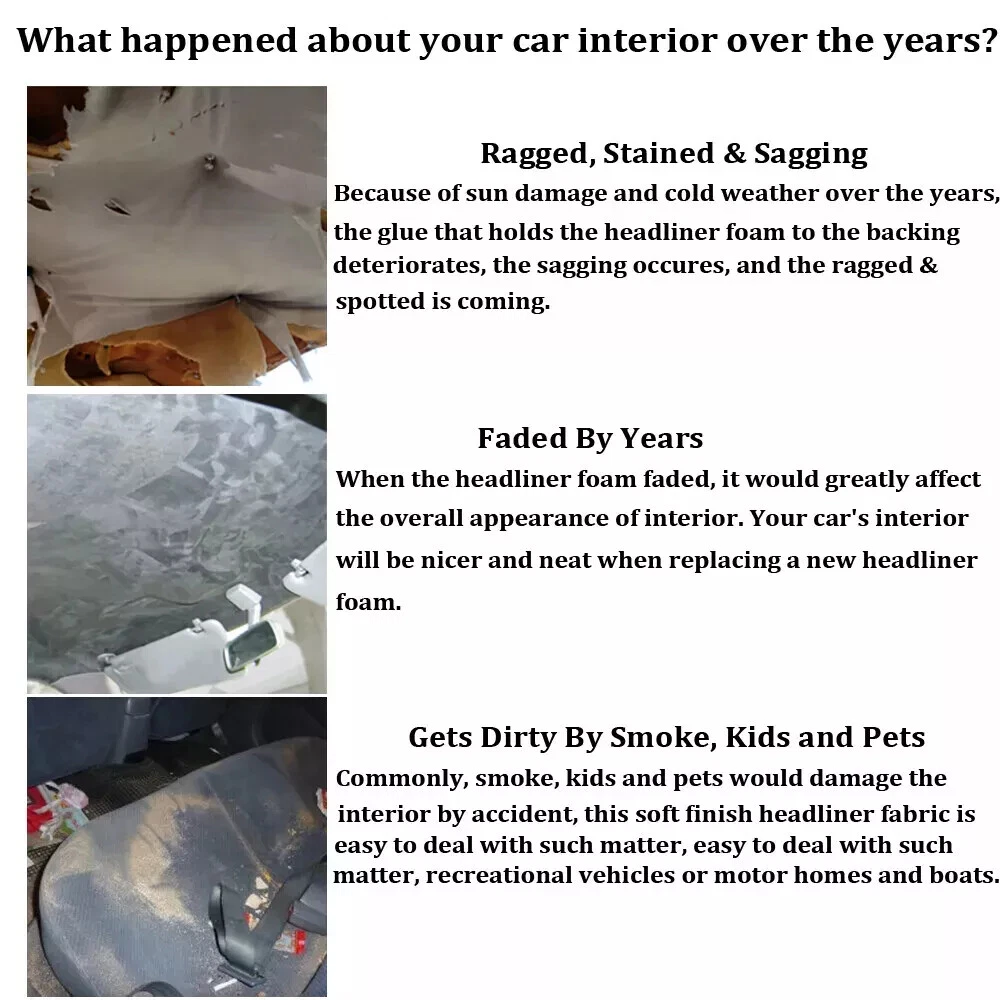 Package Includes: 59''x59'' Headliner Fabric Specification: *Material: Face Content: 100% Suede| Backing Content: 100% Polyether *Thickness: 1/9inch(3mm) *Size:59"*59"(About 24sqft) *Width: 59" *Color: Black *Non-toxic:Yes *Soft Finish:Yes *Widely Use:Yes *Easy to clean and install:Yes Yetkole Best motor store Black Suede Headliner 59"X59" Foam Supported for Car Inner Roof Repair 3mm Thick Package Includes: 59''x59'' Headliner Fabric Specification: *Material: Face Content: 100% Suede| Backing Content: 100% Polyether * Thickness: 1/9inch(3mm) * Size:59"*59"(About 24sqft) * Width: 59" * Color: Black * Non-toxic:Yes * Soft Finish:Yes * Widely Use:Yes * Easy to clean and install:Yes Features: ● Premium Material: The fabric is made of high quality Suede headliner with a 1/9" foam backing and has a soft smooth and clean finish on the surface of the fabric,to determine the size you need, please measure your vehicle headliner from front to back, then add 6 inches. (Note: The headliner fabric is folded for delivery, not delivered in rolls, But Don't Worry, just lay the headliner flat for a few hours and the creases will disappear.) ● Refresh Your Car: Suede Headliner Fabric can be used to repair or replace the interior of a vehicle that has been damaged by accidents, soiled by years of smoke, kids, pets or are just plain old ragged and faded from age. It can be used on automobiles, recreational vehicles or motor homes and boats. Restoring classic vehicles is a hobby of yours. ● Widely Used: Ideal for car and truck cab headliner replacement in vehicles that have a sunroof / moon roof and also great for door panels, sun visors, lining gun lockers,hunting cabins, box stands and gun blind interiors. It is also well suited for the front of foam/mesh ball caps, and anywhere else were a polyester flat knit face and foam backing upholstery application is desired ● Easy Care: Spot clean with upholstery shampoo, foam from a mild detergent, or mild dry cleaning solvent. Do not saturate with liquid. Pile fabrics may require brushing to restore appearance. Cushion covers should not be removed and dry cleaned. Note: The fabric will be shipped in folded, you can try with some methods to smooth out the wrinkles: Heat it with a steam iron on the back of the material, then it will be smooth again. Iron the back surface with steam iron with low heat (less than 90 degrees) but not dry iron. Size may be slight inaccuracy due to different batches of the products or hand measurement. Color may be little different due to monitors. Please take real product as standard. The headliner is folded for delivery,not delivered in rolls. The compatibility list is not absolutely 100% correct. It's only for reference. As the size and shape are different for each vehicle, please measure the size you need for your vehicle before purchase, to make sure you have ordered enough area of the headliner to cover. Item Specifics Type Headliner Headlining Fabric Upholstery Repair Replacement Theme Car/Auto Pattern Solid/Plain Material Suede Fabric Backed Foam Brand Modigt Features Coated, Colorfast, Mildew-Resistant, Waterproof Color Black Warranty 2 Year Unit of Sale Lot Placement on Vehicle Roof,Pillar,Dashboard,Sunroof,Sun Visor,Trunk,Tailgate,Console Square Size 59"*59"=5Ft*5FT=150cm*150Cm=24sqft Thread Count High Width 59Inch Surface Soft Flat Knit Thickness 3mm (1/9") Face Content 100% Suede Backing Content 100% Polyether Suitable 1 Accessories - Bags/Purses, Accessories - Hats Suitable 2 Apparel - Coat/Jacket, Car Upholstery, Crafts, Suitable 3 Cushion, Drapery, Motorcycle Upholstery, Speakers Suitable 4 Car Auto SUV Truck Caravan Pickup Van Camper RV Trailer Suitable 5 Boat,RV,Furniture,Motorcycle Seats,Yacht,Outdoor,Upholstery Other Part Number Faux Leather Roof Lining Headliner Fabric Trimmings Manufacturer Part Number Headliner Suede Fabric MPN Suede Headliner Model Panel Side Lining Ceiling Headliner Repair Fix Replacement Payment 1. It will be much appreciated that you finish your payment asap or it will make UPI(unpaid item case) on your account leading to be suspended or restricted by eBay when those UPI cases carry over to certain amount. 2. Any problems please contact us for more details. Shipping We do appreciate your purchase here. If you are astisfied with the item as well as our service, please kindly leave us a Positive Feedback to help develop our business. Thank you in advance. Returns 1. All items will be shipped to buyer's ebay address. 2. All items will be shipped within 24 working hours upon receipt of payment, and multiple items will be combined shipping. 3. In most cases, delivery takes around 3-5 business days, it's highly depended on the efficiency of the shpping carrier. If your item doesn't arrive on time, please contact us immediately for further assistance. Please note there is no local pickup service available. Contact Us 1. We care about our valued buyers, if you have any questions, our Customer Service staff will be very glad to help you. We try our best to reply your ebay message as soon as possible, please kindly allow 24 hours for us to response. 2. Our goal is to make sure you are a happy buyer and pleasant shopping with us. Please contact us before leaving any 1 or 2 star ratings, negative feedback or open any dispute. We understand the concerns and frustrations you might have, and will do our endeavor to resolve the issues. Wish you have a good shopping time~ Yetkole Best motor store DESCRIPTION PAYMENT SHIPPING RETURN POLICY CONTACT US Black Suede Headliner 59"X59" Foam Supported for Car Inner Roof Repair 3mm Thick Package Includes: 59''x59'' Headliner Fabric Specification: *Material: Face Content: 100% Suede| Backing Content: 100% Polyether * Thickness: 1/9inch(3mm) * Size:59"*59"(About 24sqft) * Width: 59" * Color: Black * Non-toxic:Yes * Soft Finish:Yes * Widely Use:Yes * Easy to clean and install:Yes Features: ● Premium Material: The fabric is made of high quality Suede headliner wit