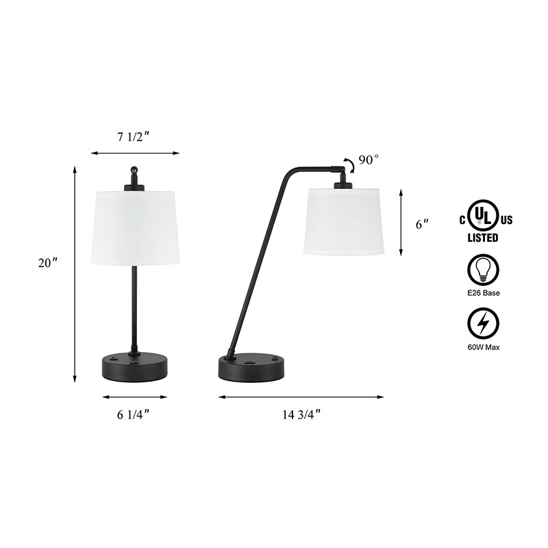 This industrial table lamp is designed with matte black finish, heavy-duty simplicity tubular metal body, simple white fabric lampshade and solid metal base. Adjustable desk lamp features swivel head that you can easily easily choose your desired lighting amount and area then to adjust the reading light to your desired direction. Bedside nightstand reading lamp with USB charging port and On-off switch on the lamp base, convenient to charge your electronic devices. The convenience of this reading lamp makes table from cords chaos it perfect for your home or office, perfect for your bedroom, living room or office. Iron table lamp is well-packaged at every detail, which makes it a wonderful gift idea for anniversary, festivals, birthday and house-warming gift. Product Specification Dimension: W: 7-1/2" x H: 20" x D: 14-3/4" Finish: Matte Black Shade Material: White Fabric Shade Shade Dimensions: T: 6-1/2" x B: 7-1/2" x H: 6" Cord: 6 Feet Black SPT-2 Cord Bulb and Wattage: Required 1 of Medium base Bulb (Bulb Not Included) Max Wattage: 1x60W Switch & USB 1) On/Off Switch make it easy to turn on and off the lamp 2) 5V DC 2A-USB Charging Port will keep your smartphone or tablet conveniently within reach while charging. Swivel Table lamp features swivel head that you can easily easily choose your desired lighting amount and area then to adjust the reading light to your desired direction Bulb Suggestion This table lamp is suggest to use “A” Type Max. 1x60W bulbs for medium base (E26 socket) (incandescent bulb or equivalent CFL / LED bulbs) Fabric Shade The handmade linen fabric lamp shade and top diffuser softens the light while allowing enough light be cast through, creating a welcoming and warm ambiance. Family Products XiNBEi Lighting Table Lamp XB-TL257-BN $90.99 Sold and Ship by XiNBEi Lighting Free Shipping XiNBEi Lighting Table Lamp XB-TL290-DB $86.99 Sold and Ship by XiNBEi Lighting Free Shipping XiNBEi Lighting Table Lamp XB-TL292-DB $74.99 Sold and Ship by XiNBEi Lighting Free Shipping XiNBEi Lighting Table Lamp XB-TL291-MB $128.99 Sold and Ship by XiNBEi Lighting Free Shipping Terms of Sale Shipping Policy: We ship within 1-2 business day from receipt of payment. We do not change your shipping address by email. Please make sure your address is correct before checking out and making payment. Payment Policy We accept most major credit cards, including, but not limited to, Visa, Mastercard, American Express, or Discover card and PayPal. All major credit cards are accepted through secure payment processor eBay Payment. All payment must be made within 7 days of the end of the auction. Otherwise, an "Unpaid Item Dispute" will be filed with eBay. Return Policy If you have any questions about purchases or concerns on our products or accessories replacement, please feel free to contact us through eBay's Message Center. However, if a return is required, please kindly noted that all returns should be met with following conditions: All return requests must be within 30 days of receipt. Return item must be in original condition as received (brand new in sealed package / with tags). Refund of purchase price less original shipping will be issued. Return postage is buyer's responsibility. Original shipping is not refundable for products features free shipping unless we're found at fault. We won't be able to refund if products are found damaged or used. Thank you. Any accessories (such as: Glass) broken via transportation can be replaced for free within 30 days receipt. However, If exceed the valid date to contact us that need you to pay for the accessories (such as: Glass), thanks!