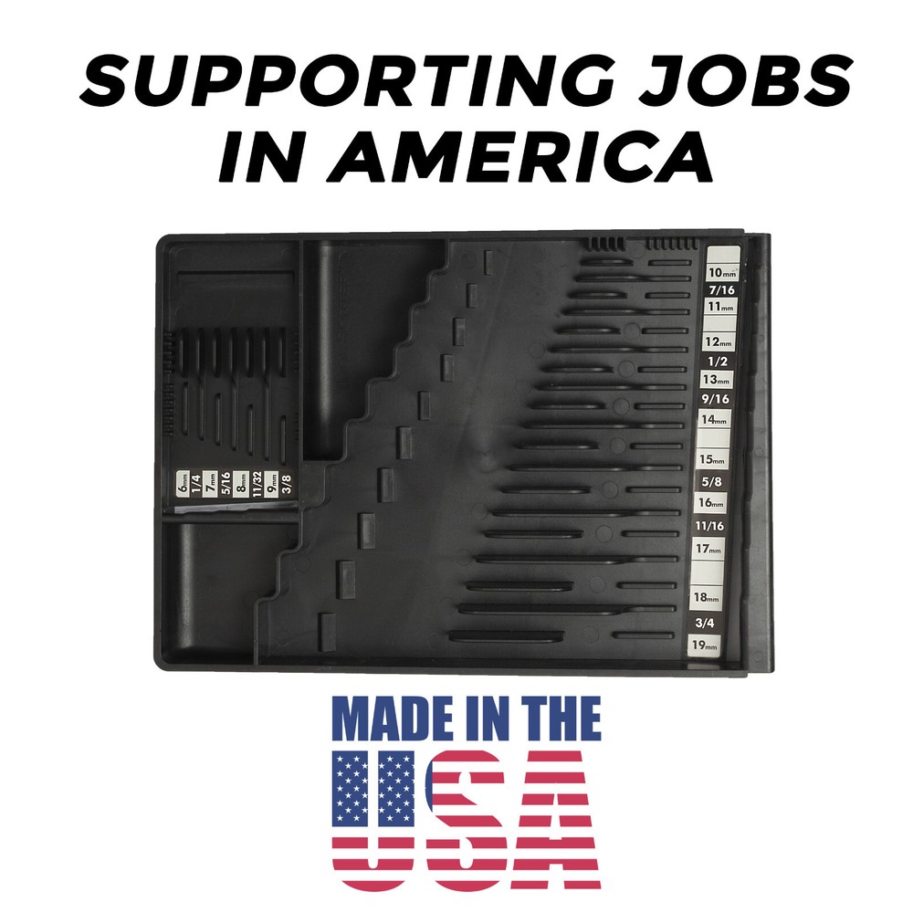 EFFICIENT WRENCH ORGANIZER – Store and sort your wrenches in an orderly fashion, get rid of the messy drawers or toolboxes, and have them easily accessible with Tool Sorter wrench organizers (Tools not included) PREMIUM WRENCH ORGANIZER – The tool tray can hold up to 28 tools with additional space for project parts. The open face design shows all stored tools and provides easy access for the wrench you need. Please note that wrenches are not held/click in place. EFFICIENT USE OF REAL ESTATE IN THE TOOL DRAWER – Wrench organizer for toolbox Measures W 10” x D 13.5” x H 1.5” and fits in 2” H shallow drawers fully loaded with typical wrenches. BUILT TOUGH WRENCH ORGANIZER – Made with premium quality materials in the USA, our wrench organizer will serve you for many years. This tool tray is extremely durable and can withstand everyday wear/tear. Note that wrenches sit in storage slots but are not held in place by magnets or clips MADE IN US