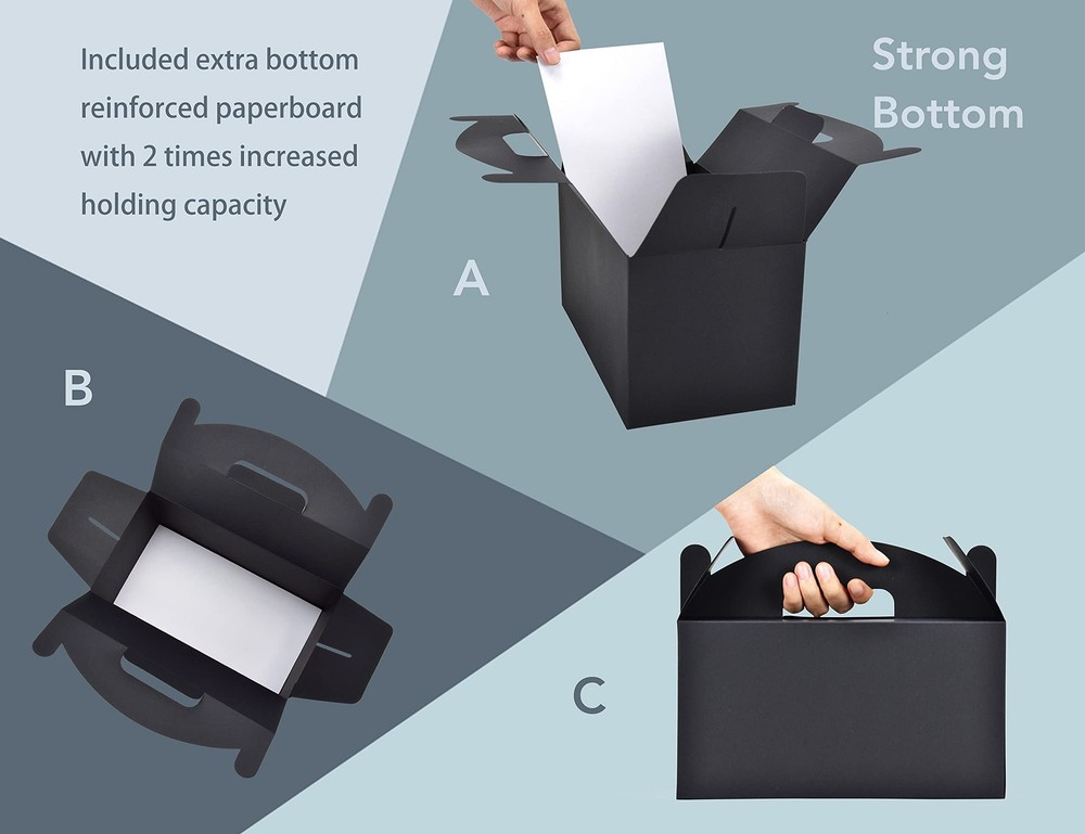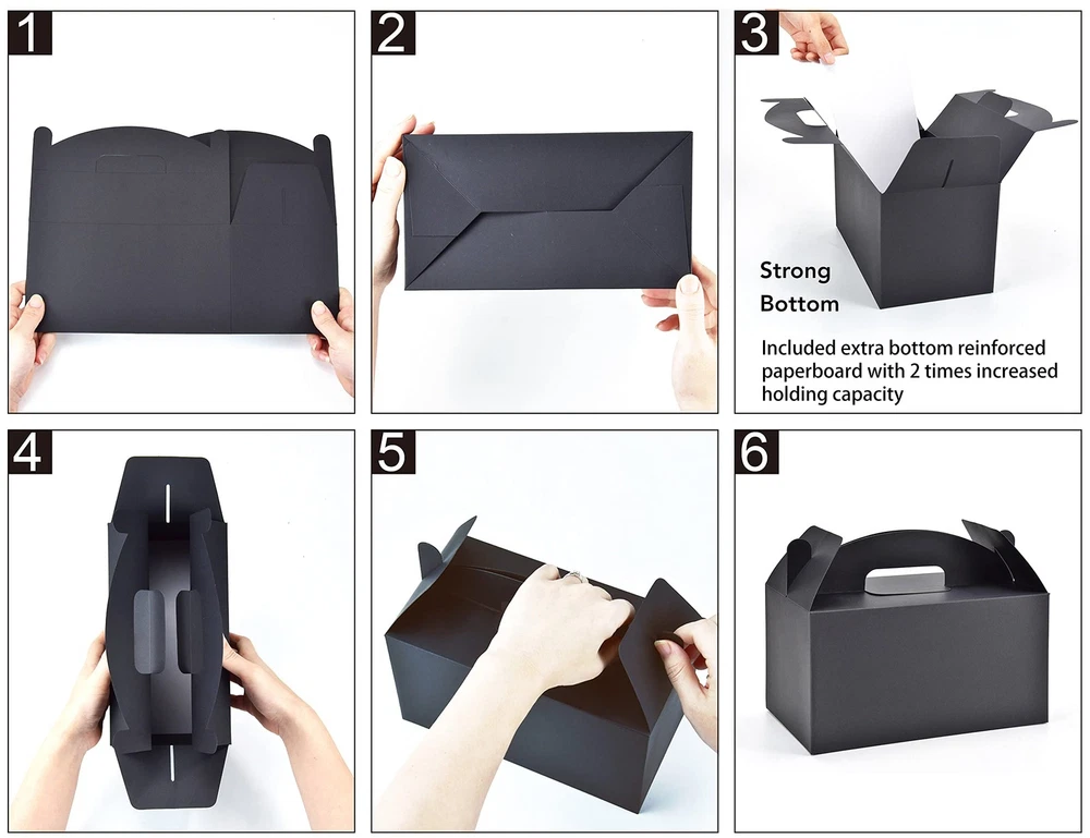 Strong Bottom Tape Free Empty Treat Boxes:An extra bottom reinforced paperboard is included,with 2 times increased holding capacity than others.Kraft gift boxes fold flat for easy packaging.No need to use additional tape for the bottom,which helps make it clean and environment-friendly Large Black Gable Boxes:Assemble in seconds,paper gift boxes come in 30pcs,each big treat box measures 9.45" long x 5" wide x 5" deep Suitable Occasions:The recyclable gift boxes are the perfect size for keeping candy,popcorn,toys,party gifts,for baby showers,birthday parties, wedding party favors Good Value:These gift boxes are made of high-quality recyclable cardboard materials Money Back Guarantee:If you are not satisfied with our treat boxes with handles for presents in 30 days. A replacement or 100% refund will be immediately provided to you