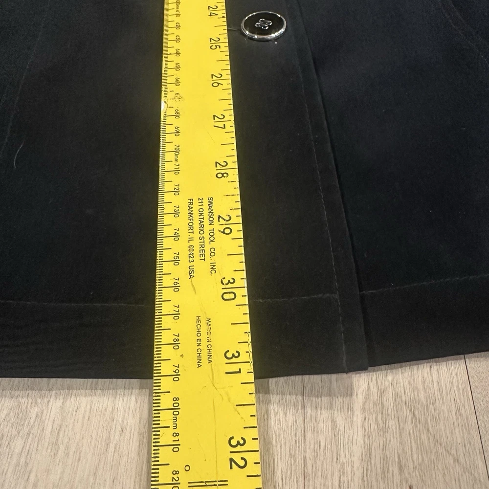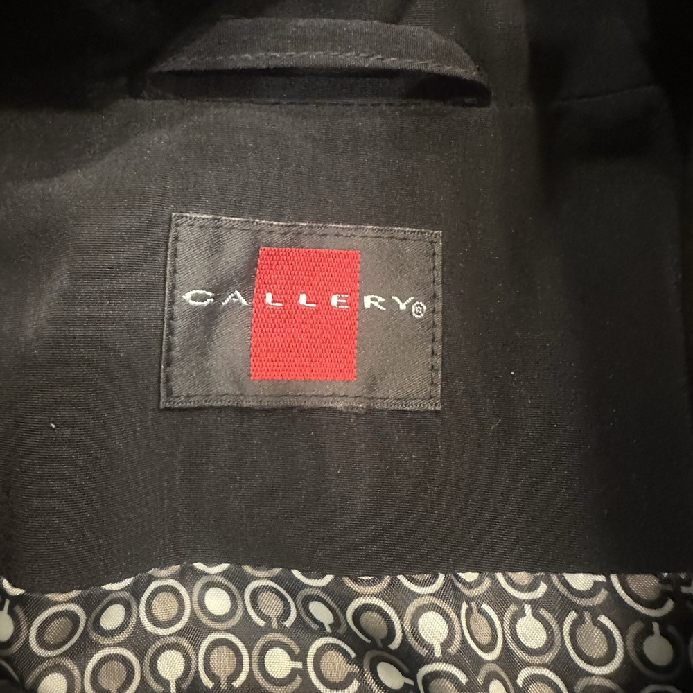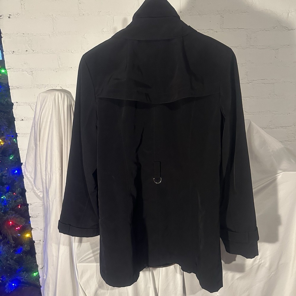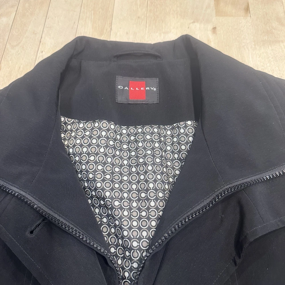 This black trench coat from Gallery is a must-have for any fashion-forward woman. With a mid-length and a solid pattern, it is perfect for casual occasions all year round. The coat features a zip and button closure, collared neckline, and packed with pockets for convenience. Made with polyester outer shell material and lined with polyester, this coat is machine washable and suitable for all seasons. The coat is cool black and has accents of button and zipper. The size is as seen in the pictures, and it is a regular size type. This coat is perfect for anyone looking for an American classic coat with a twist.
