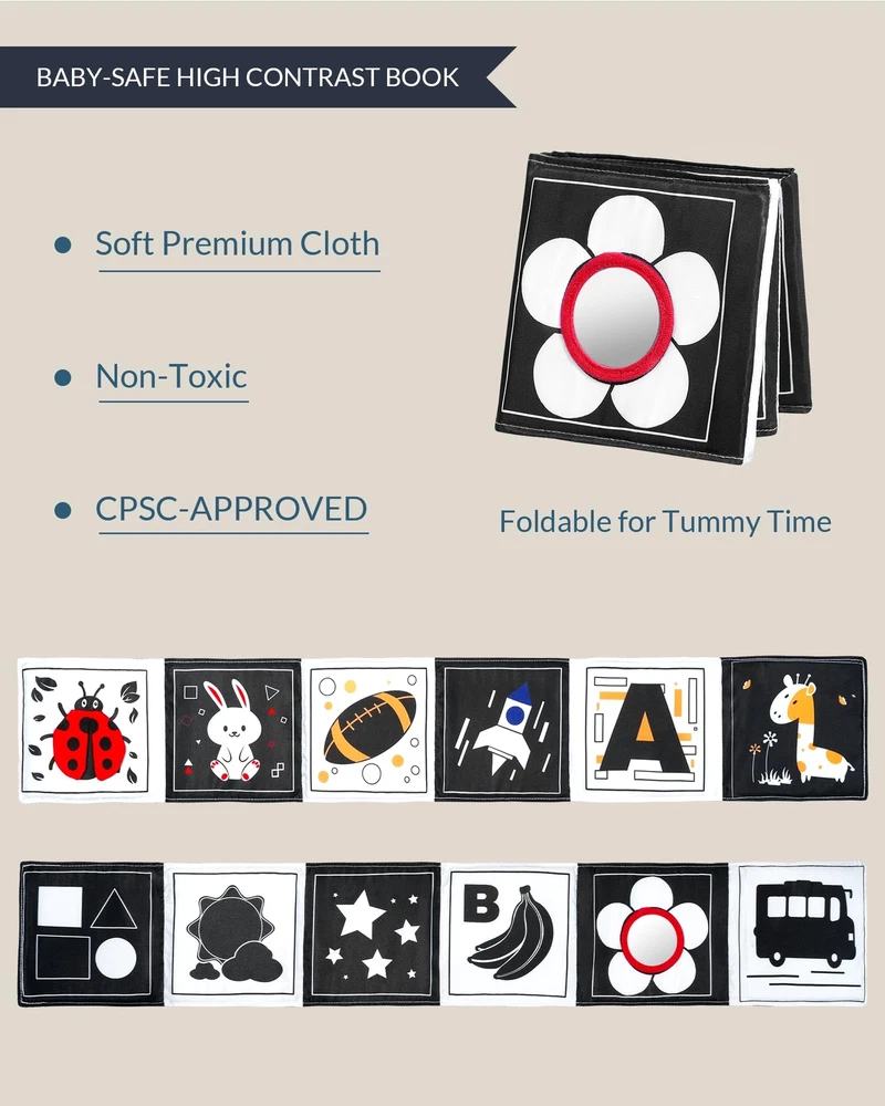 Black & White Baby Toys High Contrast Crinkle Cloth Activity Book, Infant Mirror Toys for Baby 0-6 Months, Newborn Sensory Tummy Time Toys for Infants, Baby Development Essential Stimulate Your Baby’s Senses: This sensory baby book, designed for babies 0-6 months, features high-contrast black and white patterns on one side and vibrant colors on the other, making it an ideal toy for early development. Watch your baby explore animal shapes and fun forms that captivate their attention and encourage sensory play. Interactive & Engaging Infant Toy: Includes an embedded mirror that aids in self-recognition and cognitive development. The crinkle cloth adds auditory stimulation, making this book an engaging tummy time toy for babies 3-6 months. Keep your little one entertained and learning through interactive play. Safe & Durable Newborn Toy: Made from soft sponge and polyester fiber, this baby toy is gentle on delicate skin. The thick padding ensures it stays upright, avoiding collapse – a common concern with other infant toys. It’s also chew-resistant and tear-resistant, ensuring it stands up to everyday use. Versatile & Portable Tummy Time Toy: With four pairs of sturdy ties, this book can be easily hung in a crib, attached to a stroller, or used during tummy time. Its foldable design makes it a convenient travel companion, perfect for keeping your baby engaged whether at home or on the go. Perfect Baby Gifts & Registry Must-Have: Whether you're looking for a baby shower gift, a baby birthday gift, or adding to a baby registry, this Black & White Baby Book Toy is a thoughtful and practical choice. It combines educational value with a design that parents and babies will love, making it a perfect addition to any baby registry search. Shipping We offer FREE shipping on all orders! We ship within Three business days of payment, usually sooner. We use a selection of shipping services such as UPS, FedEx, USPS etc. We only ship to the lower 48 states, no APO/FPO addresses or PO Boxes allowed. Local pickups and combined shipping options are not provided at this time. Return You can return a product for up to 30 days from the date you purchased it. Any product you return must be in the same condition you received it and in the original packaging. Please keep the receipt. Payment We accept payment by any of the following methods: PayPal Please pay as soon as possible after winning an auction, as that will allow us to post your item to you sooner! Feedback Customer satisfaction is very important to us. If you have any problem with your order, please contact us and we will do our best to make you satisfied. Contact Us If you have any queries, please contact us via ebay. We usually respond within 24 hours on weekdays. Please visit our eBay store to check out other items for sale! Thank you for shopping at our store.